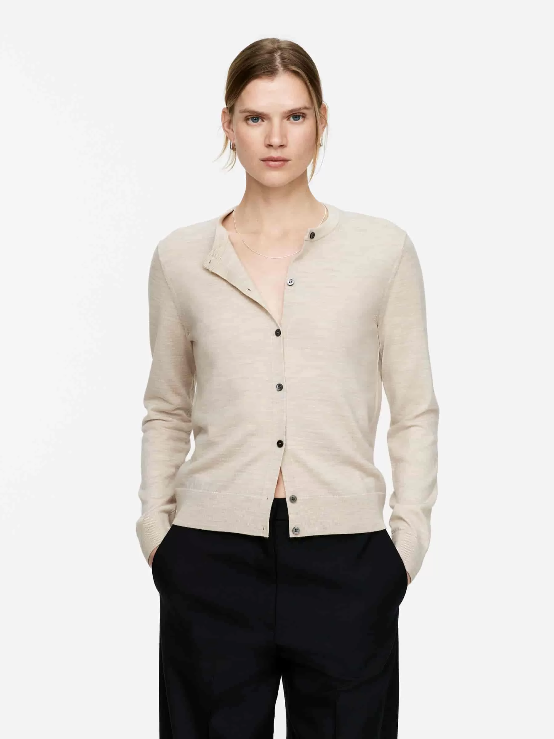 Kofta stickad av ren merinoull. Stylad med ribbade kant och pärlemorknappar. Vanlig passform. Koftan innehåller 100 % RWS-ull (TE-00047206). Produkter certifierade enligt Responsible Wool Standard (RWS) innehåller ullfibrer från gårdar som är oberoende certifierade enligt kraven på djurskydd och markförvaltning.