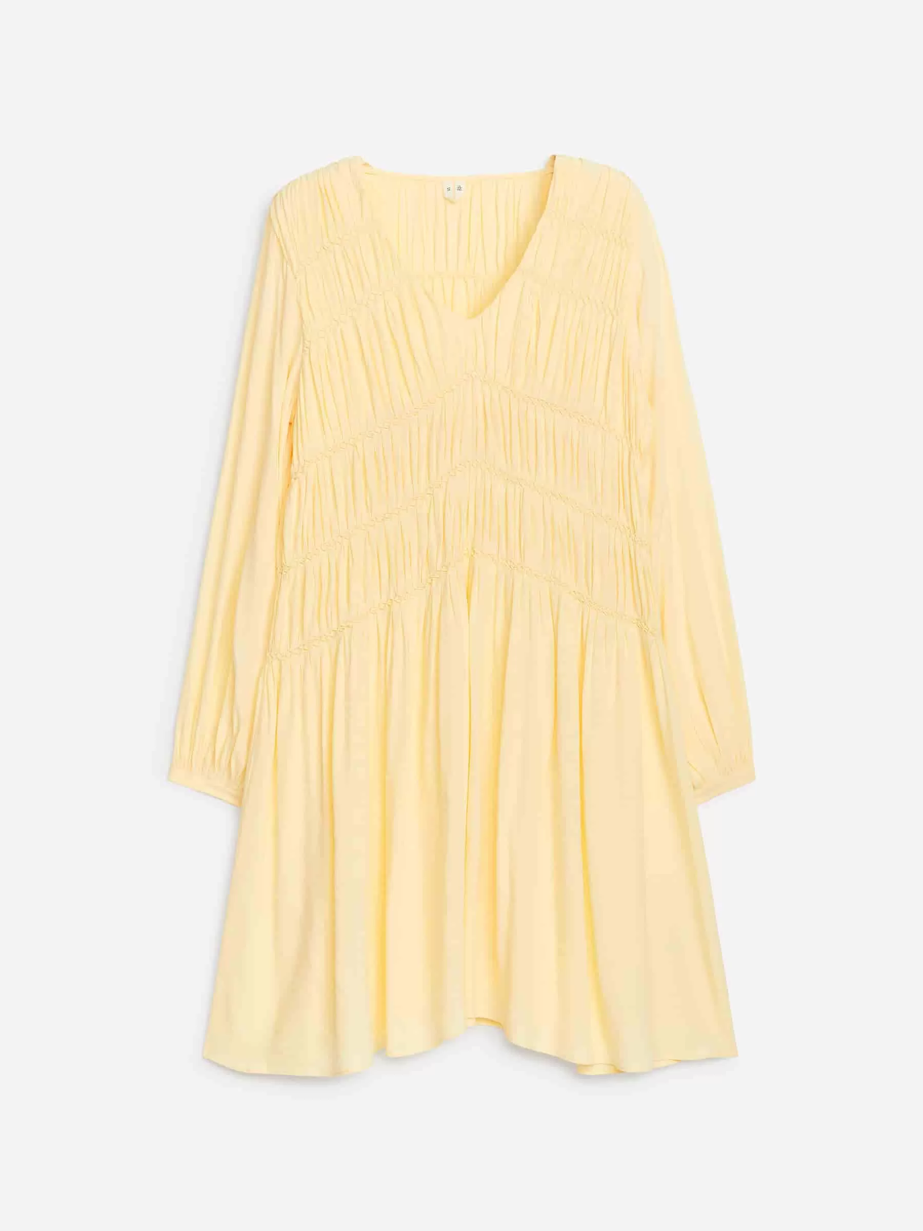 Midiklänning gjord av ett flytande viskostyg. Har V-ringning, ballongformade ärmar och smockdetaljer med elastiska sömmar över kroppen. Nålfåll i nederkant.
