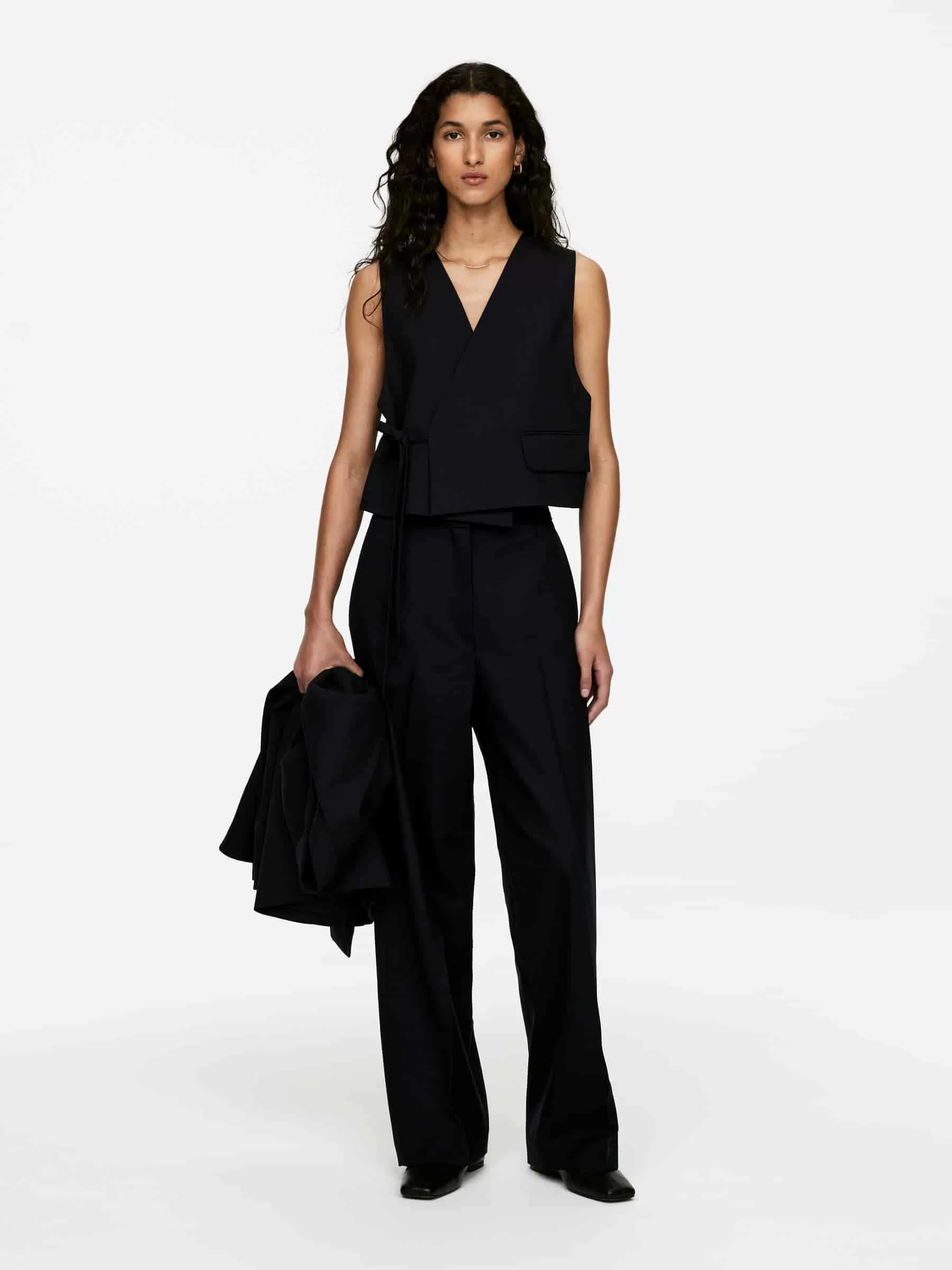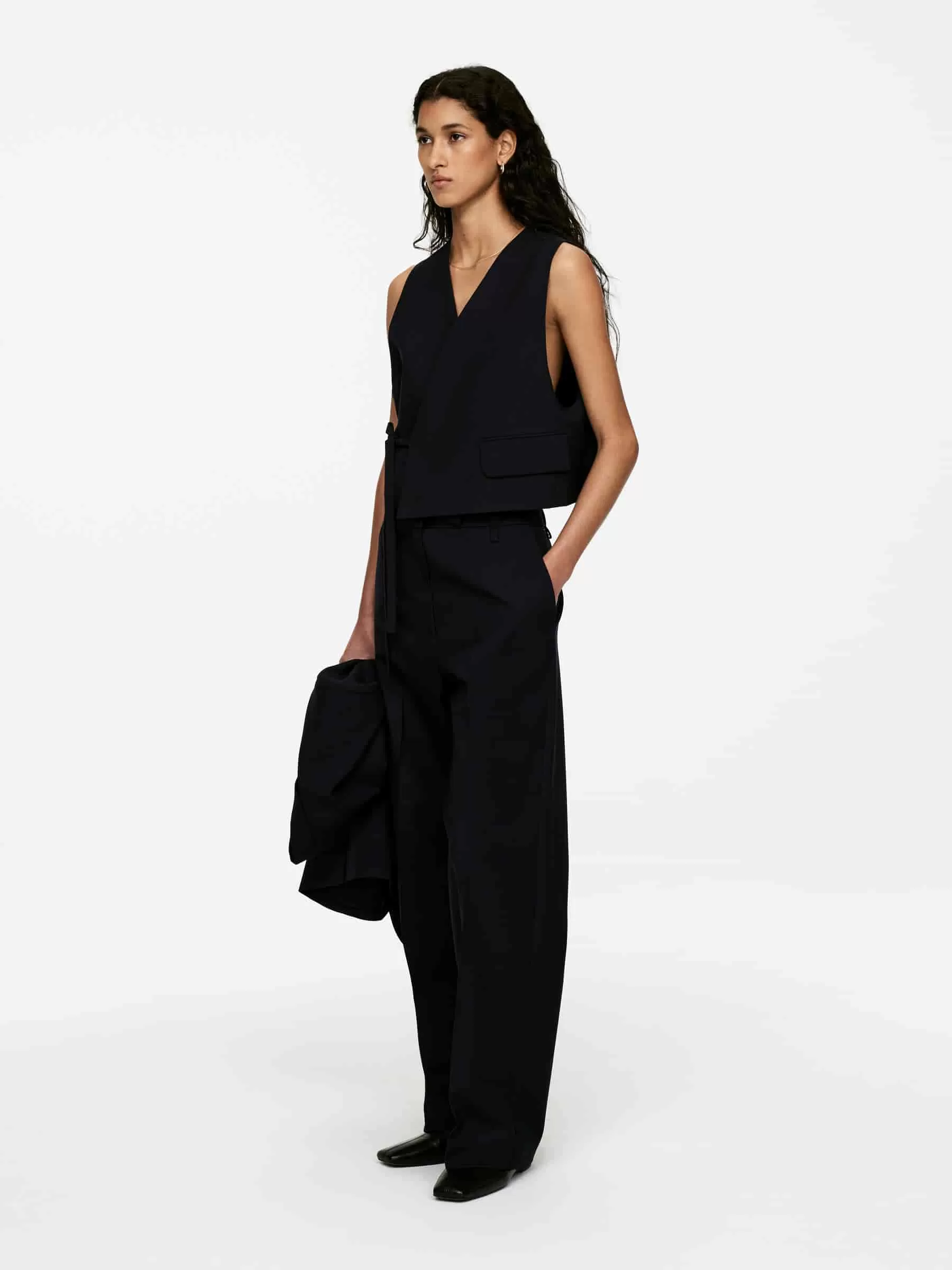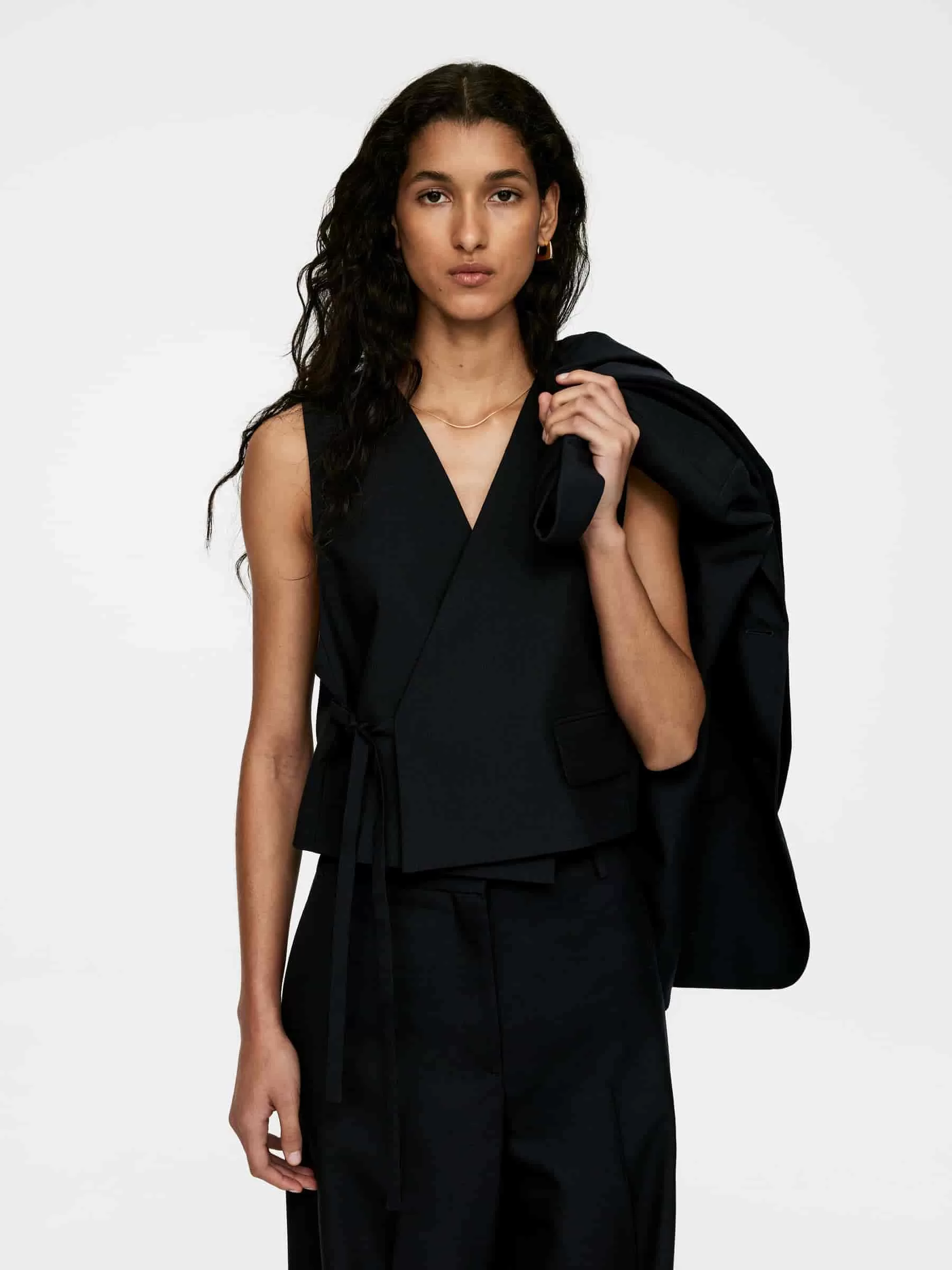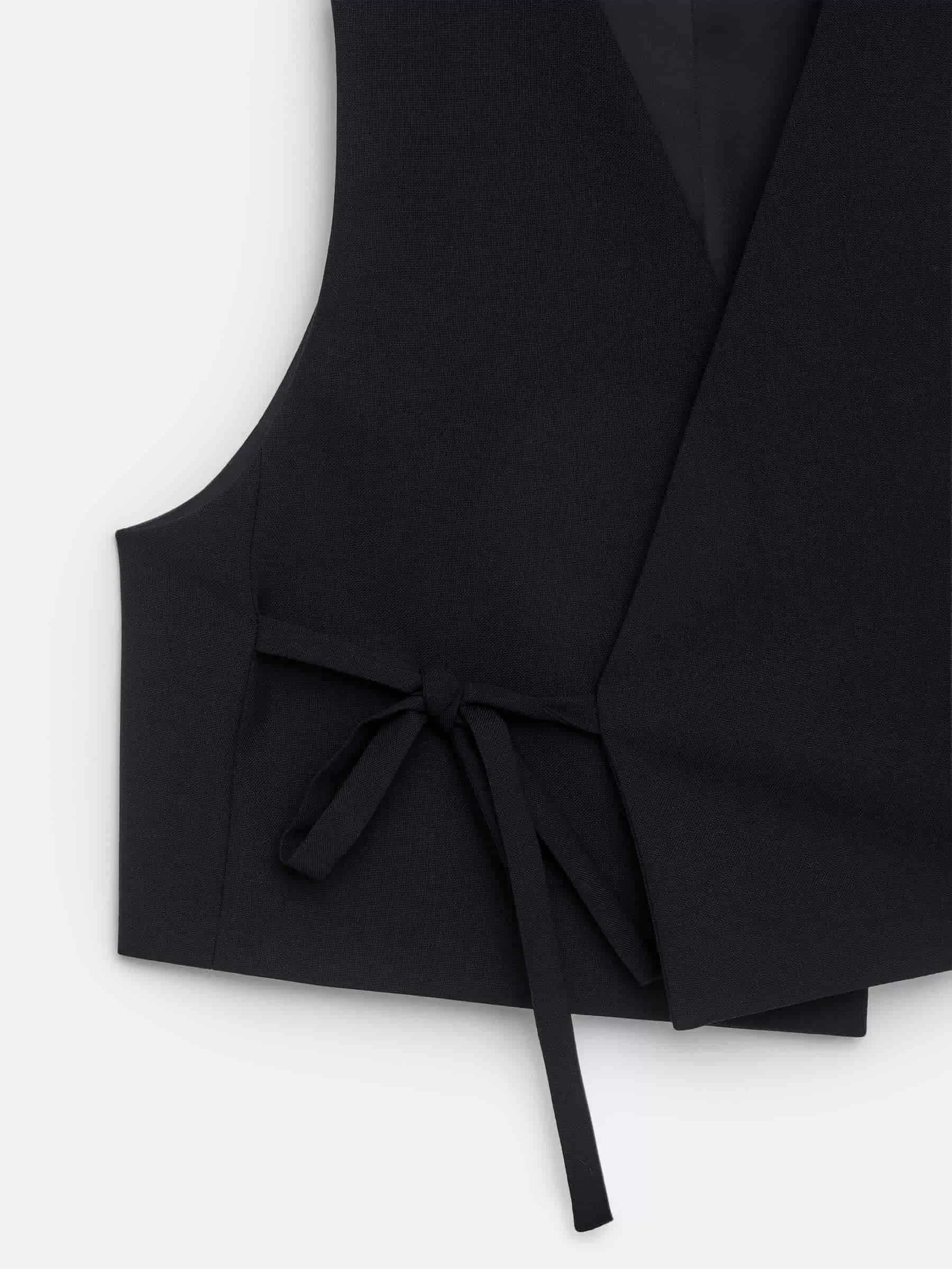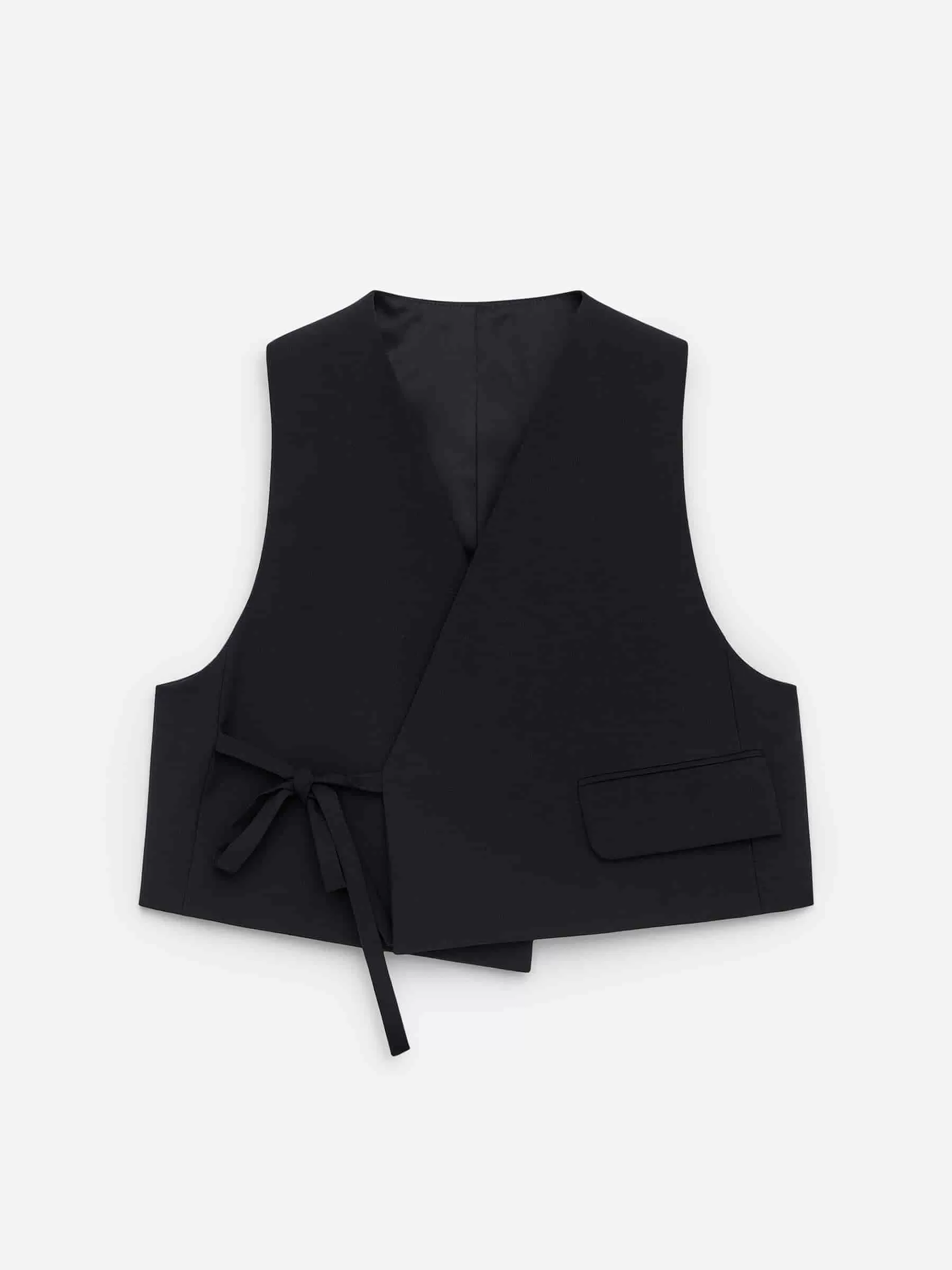Klippad väst tillverkad av en hopsackväv gjord av ull. Kan bäras för sig eller över en skjorta. Knytband och invändig knappstängning. Stilen innehåller 100 % RWS-ull (TE-00047206). Produkter certifierade enligt Responsible Wool Standard (RWS) innehåller ullfibrer från gårdar som är oberoende certifierade enligt kraven på djurskydd och markförvaltning.