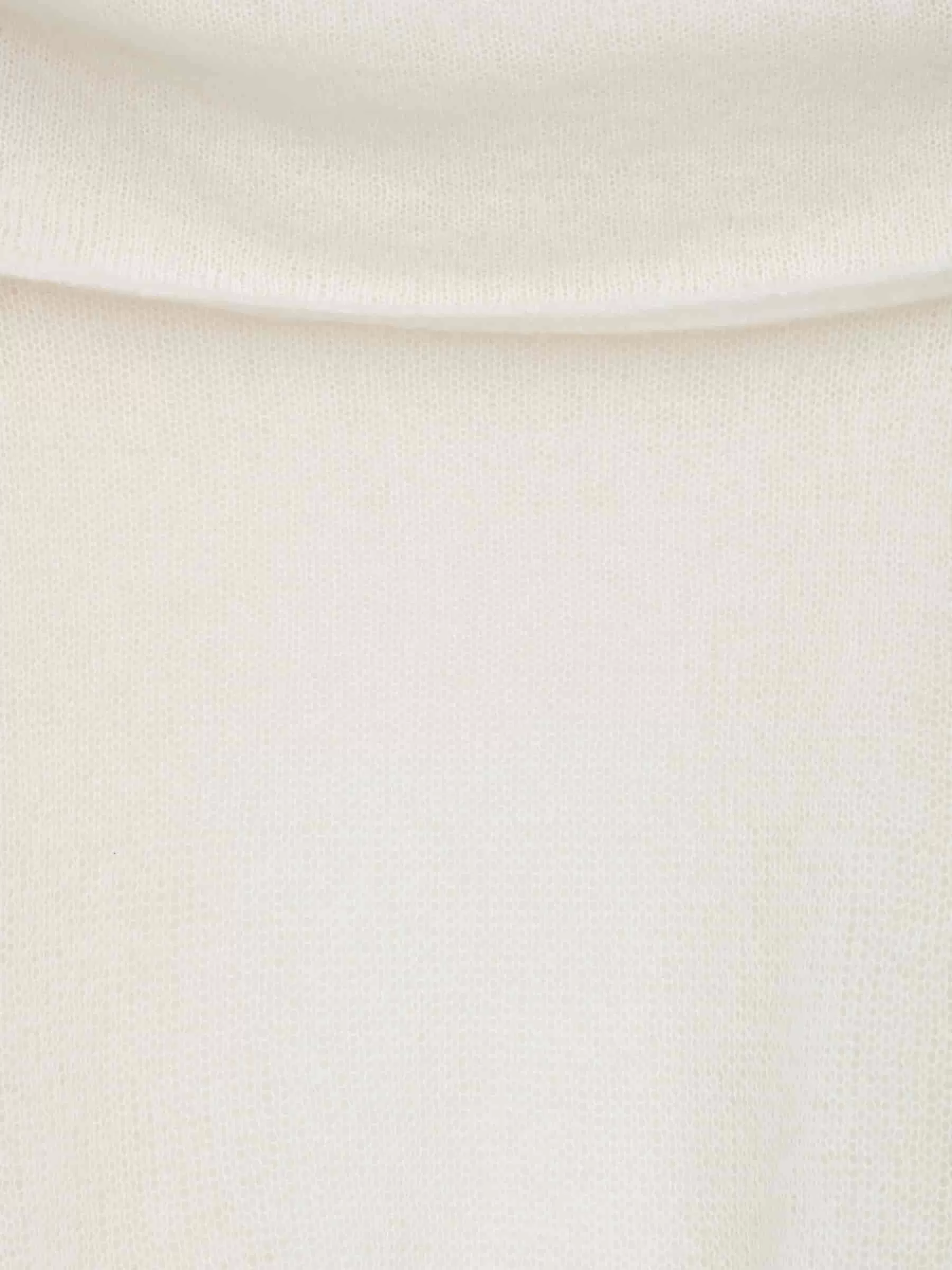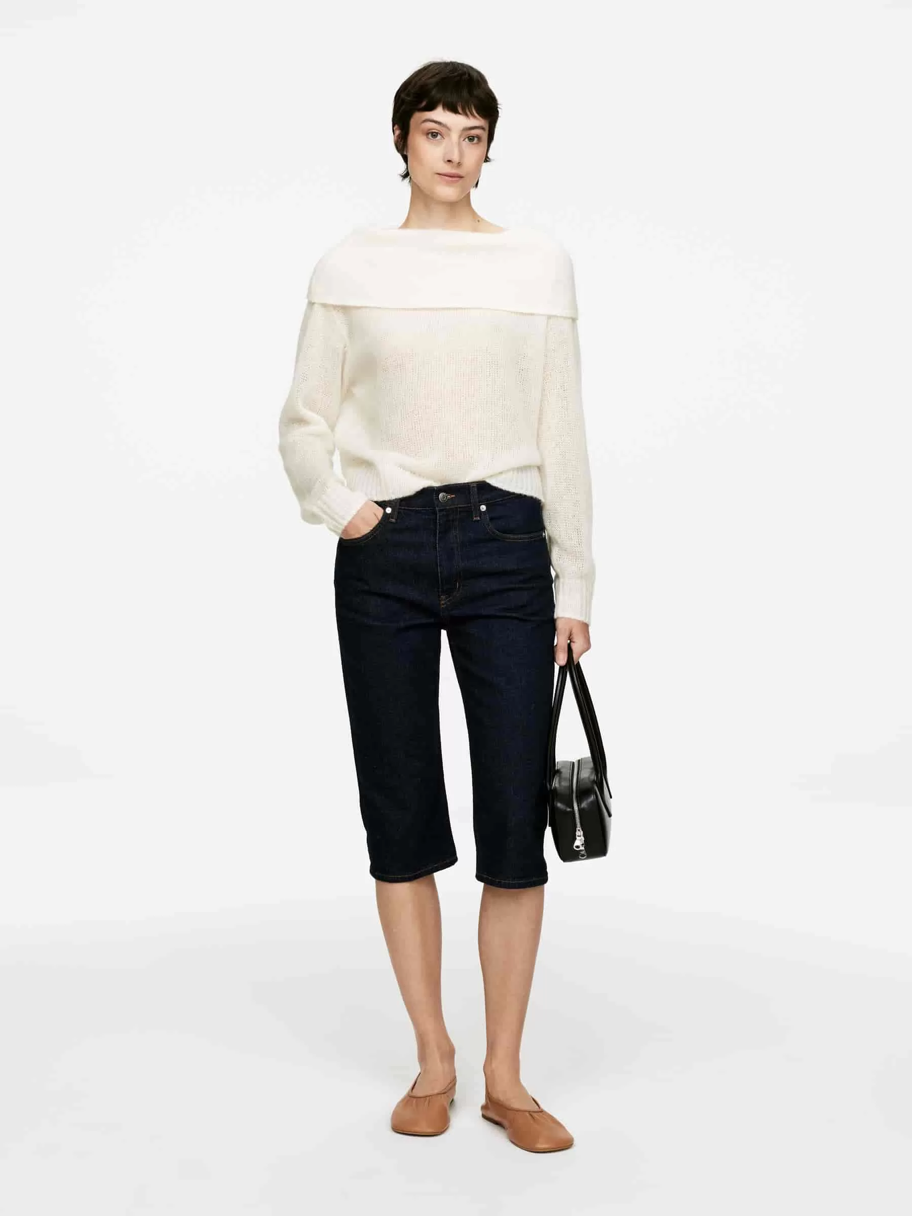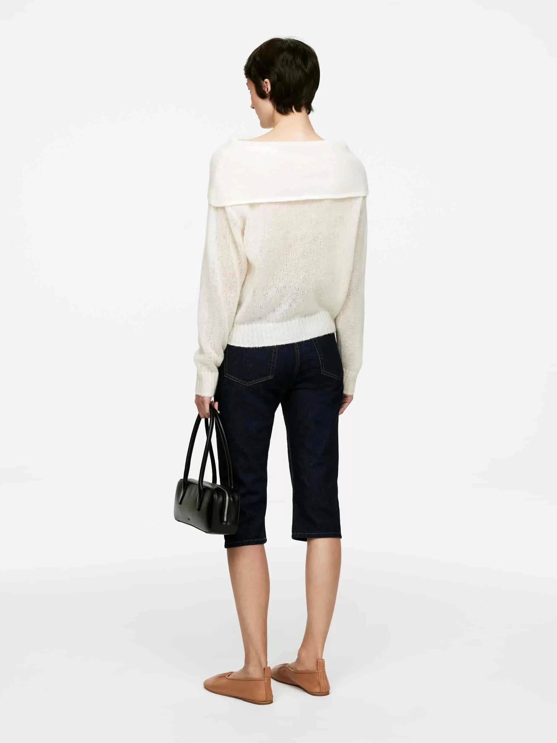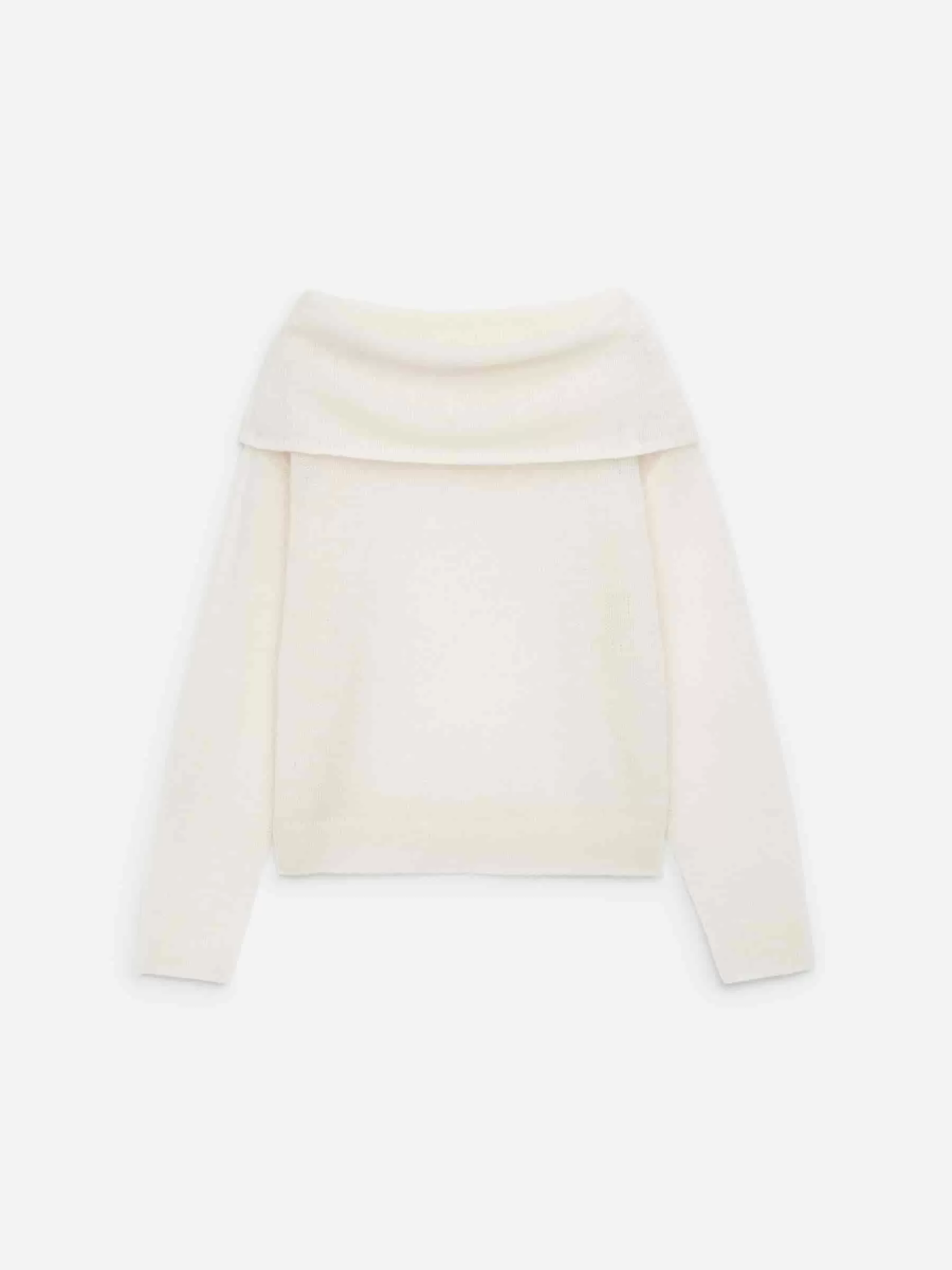 Off-shoulder-tröja tillverkad av en mjuk kvalitet inklusive ull och mohair. Denna stil innehåller 32 % RMS Mohair och 39 % RWS-ull (TE-00047206). Produkter certifierade enligt Responsible Wool Standard (RWS) och Responsible Mohair Standard (RMS) innehåller ull och mohairfiber från gårdar som är oberoende certifierade enligt kraven på djurskydd och markförvaltning.