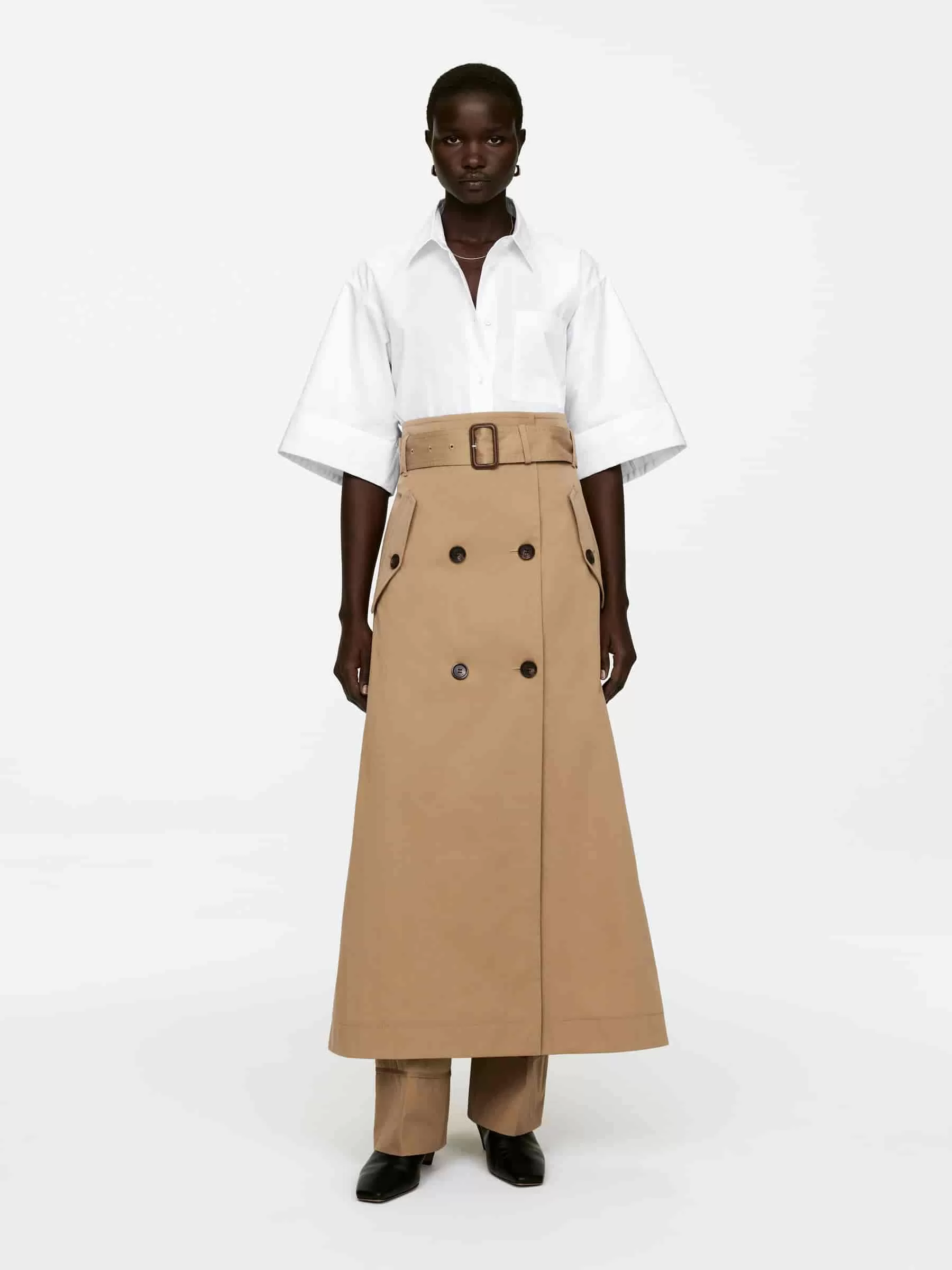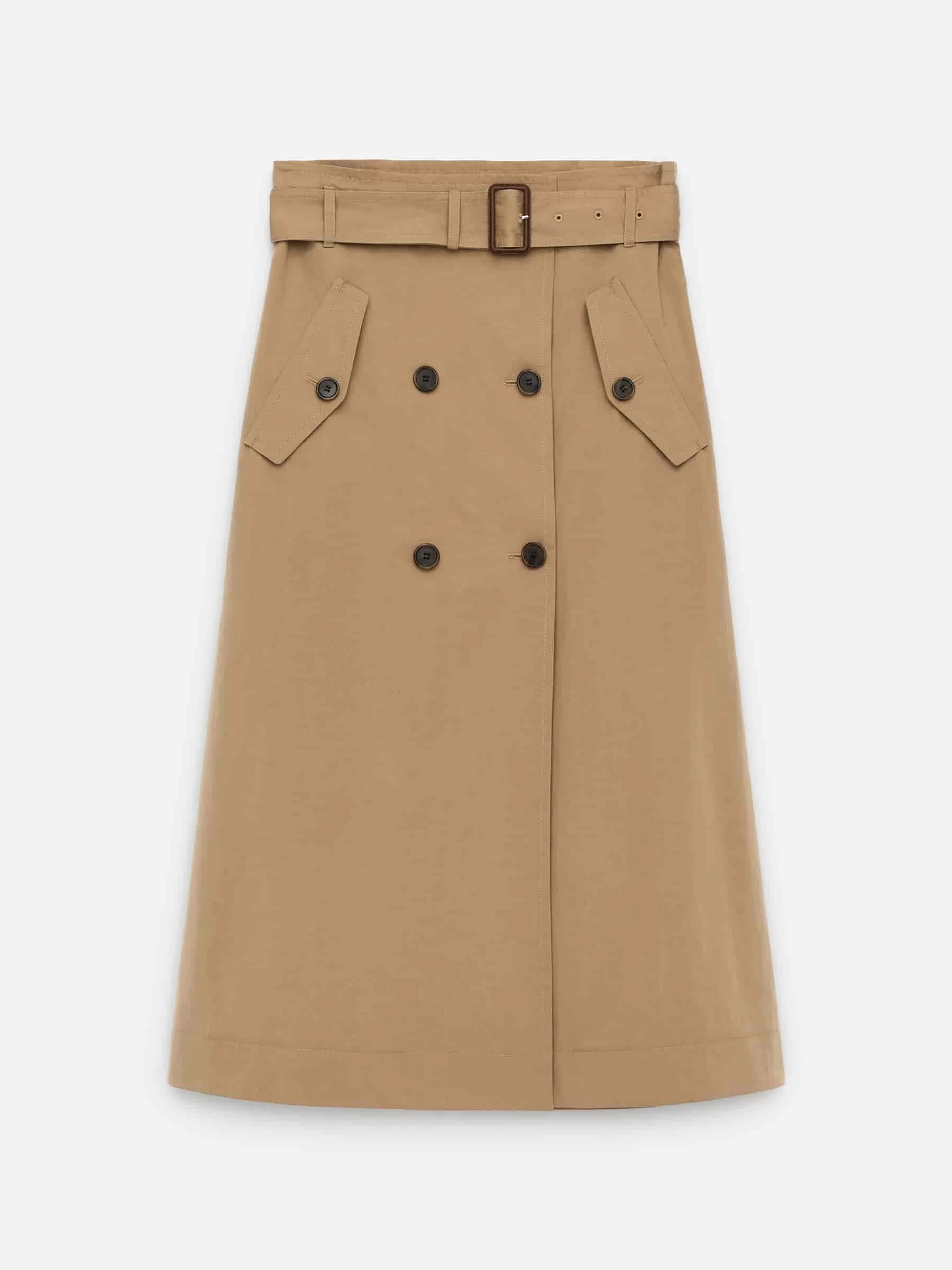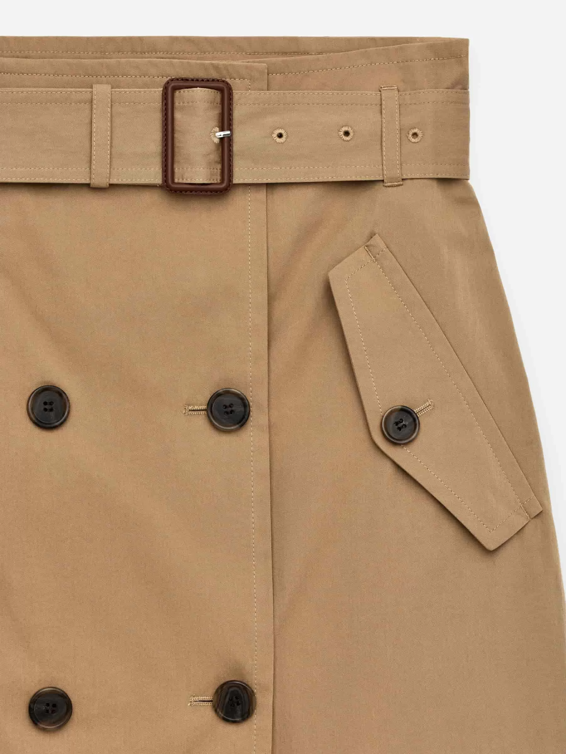 A-linje midikjol med detaljer i trenchstil, inklusive omlottstängning med knappar, sneda sidfickor med lock och ett skärp. Slits baktill.