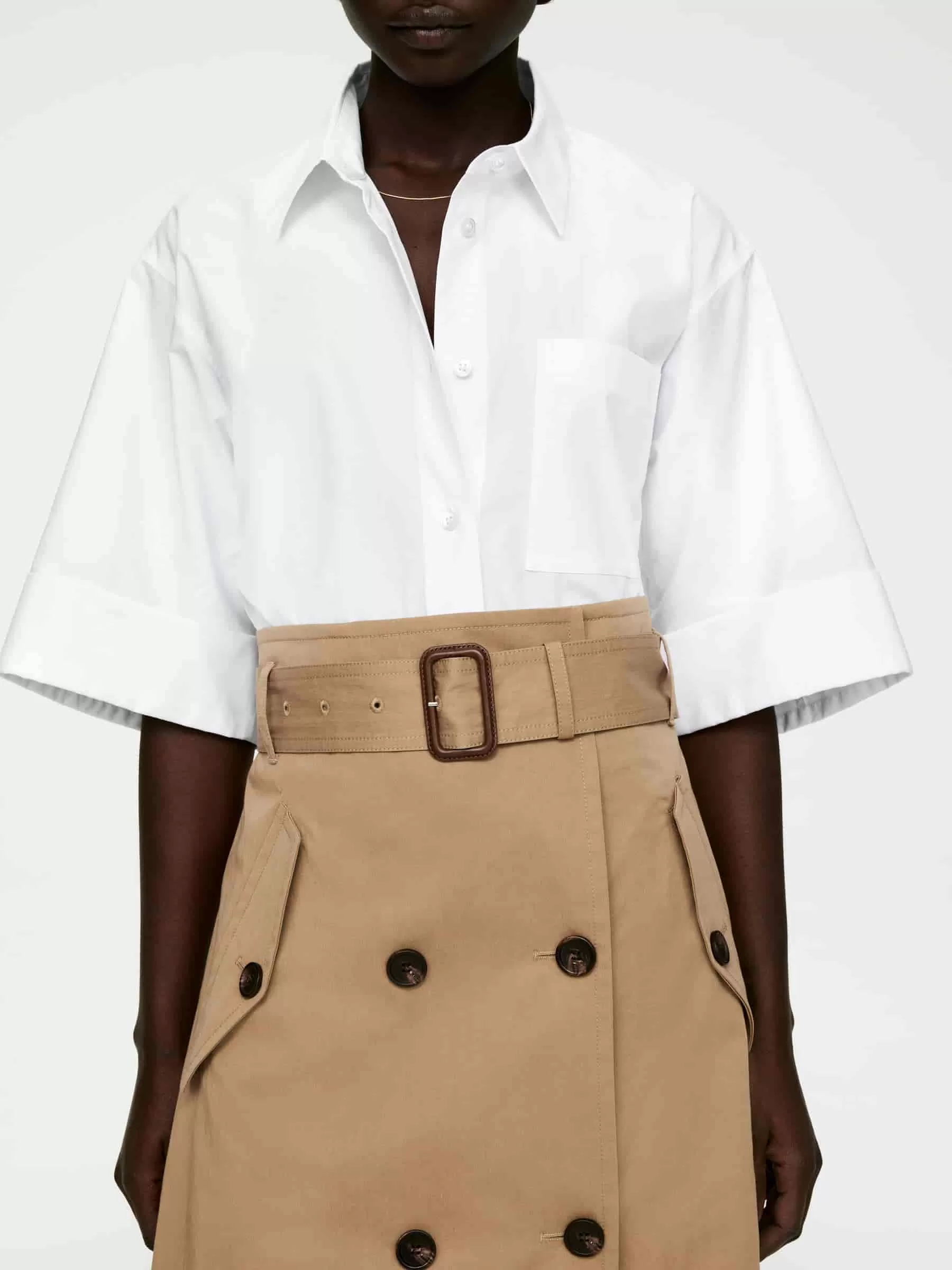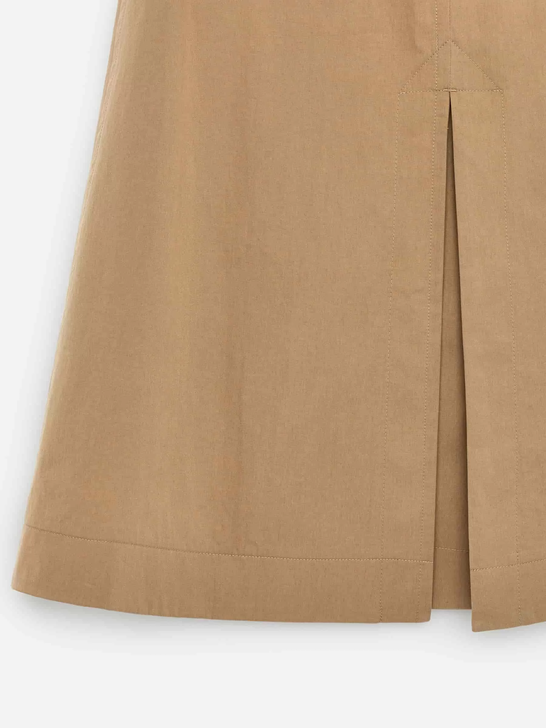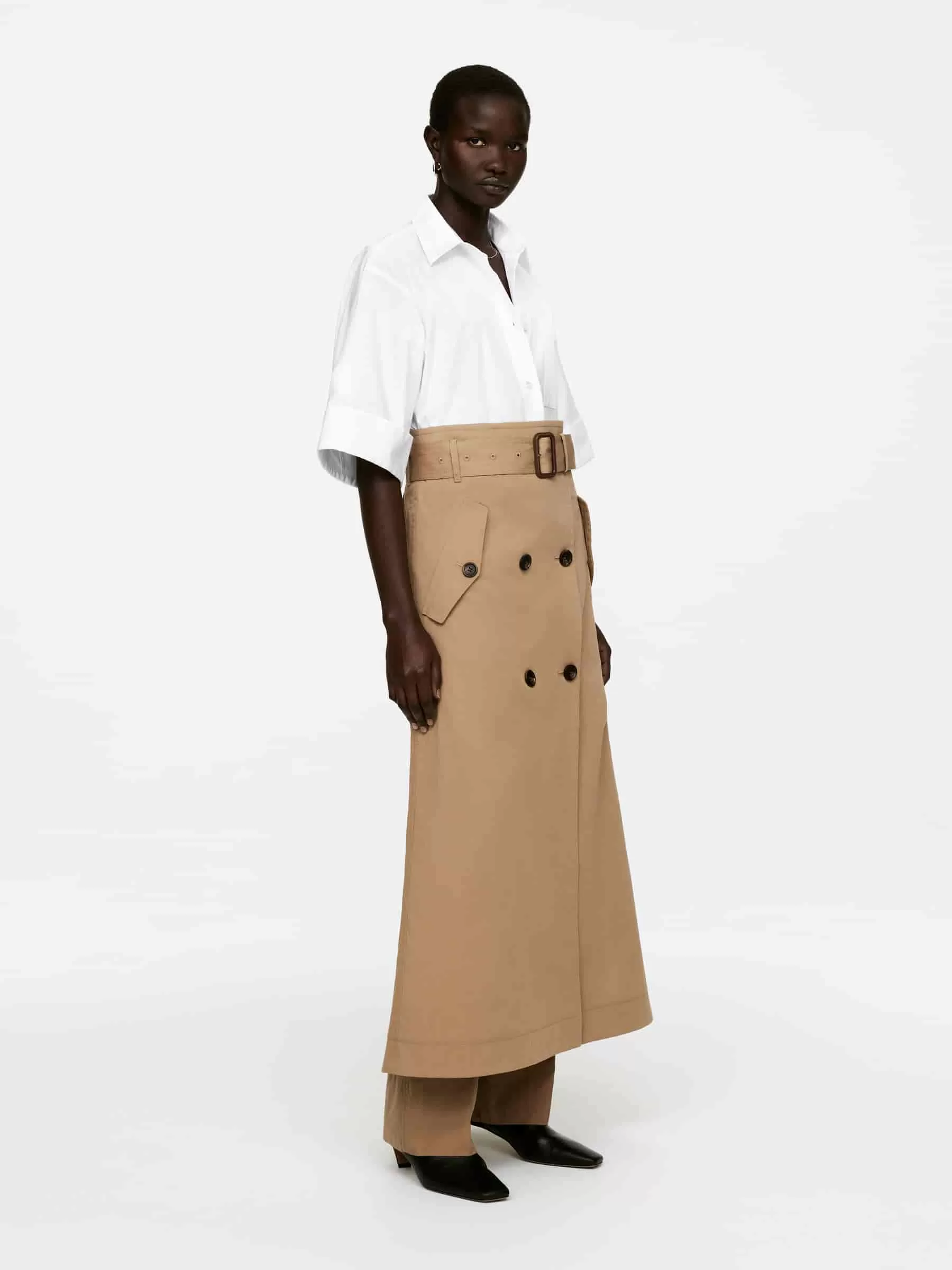A-linje midikjol med detaljer i trenchstil, inklusive omlottstängning med knappar, sneda sidfickor med lock och ett skärp. Slits baktill.