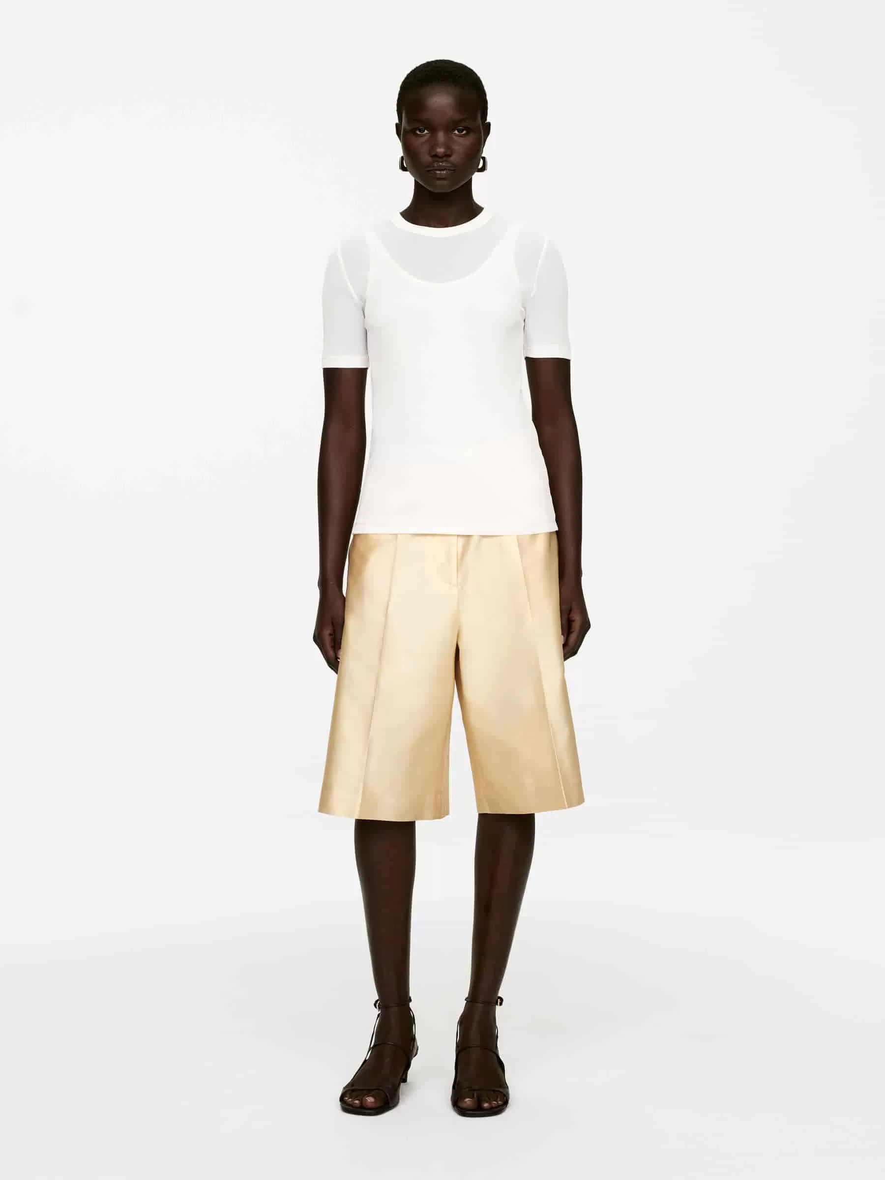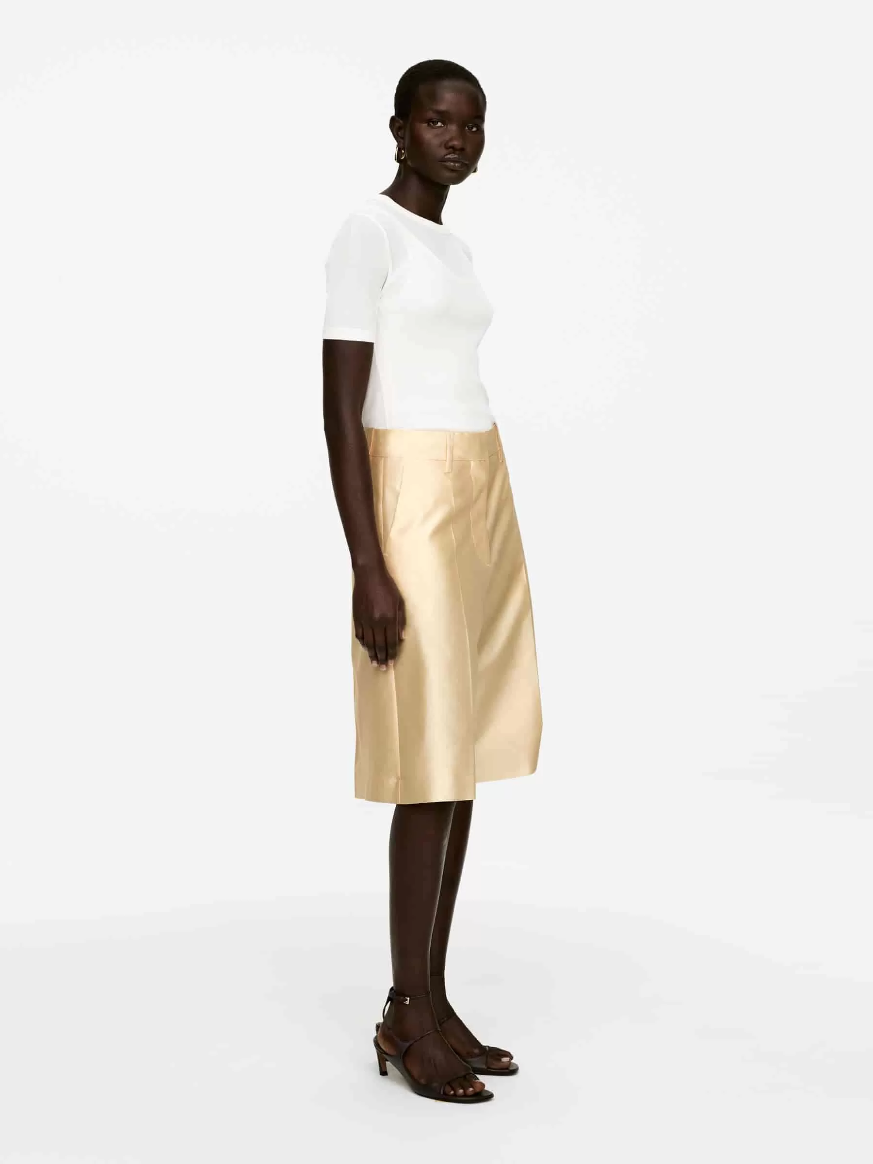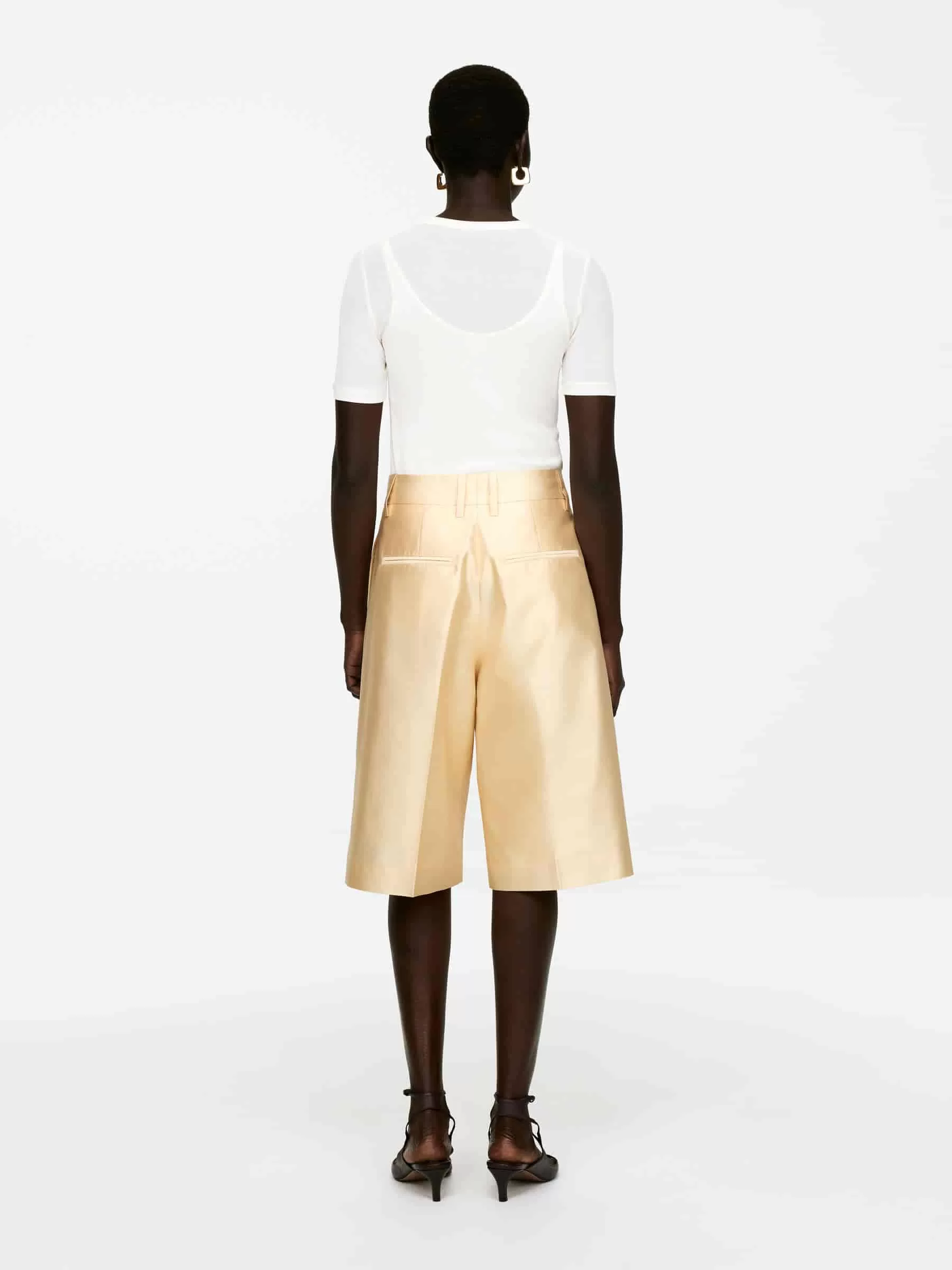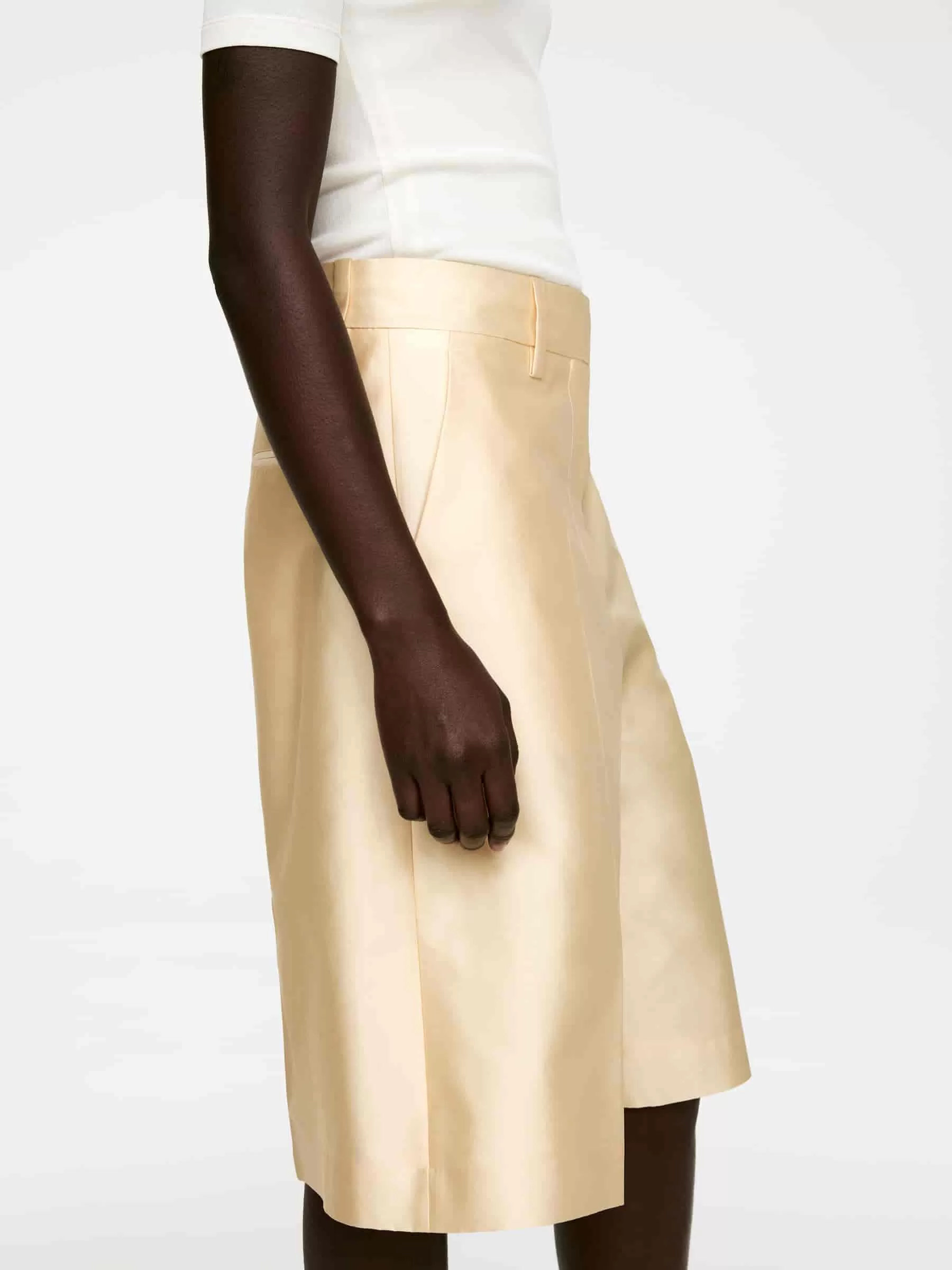 Knälånga shorts tillverkade av en blandning av polyester och mullbärssilke. Stylad med pressveck, midja i midja, snedställda sidfickor och dubbla passpoalfickor bak. Krok-och-stängning och dragkedja.
