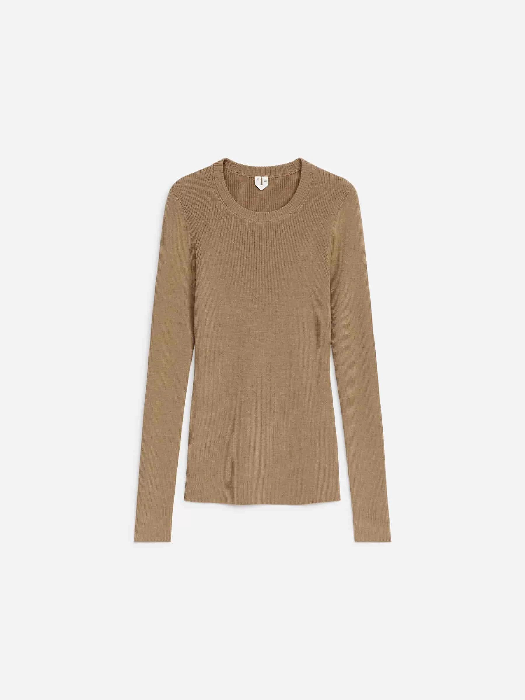 Långärmad topp ribbstickad av merinoull. Rund halsringning med ribbad kant. Slimmad passform. Toppen innehåller 100 % RWS-ull (TE-00047206). Produkter certifierade enligt Responsible Wool Standard (RWS) innehåller ullfibrer från gårdar som är oberoende certifierade enligt kraven på djurskydd och markförvaltning.
