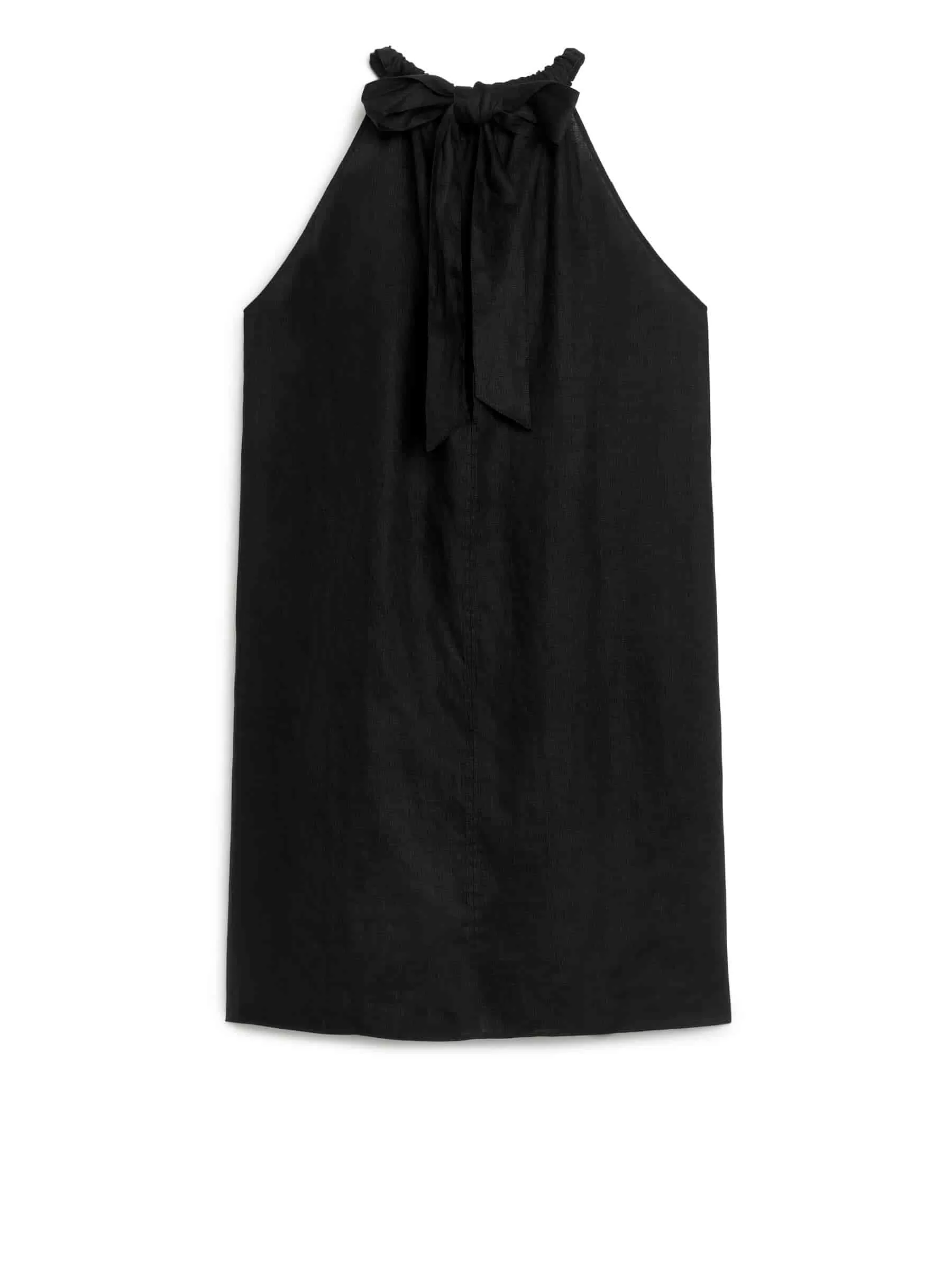 Lössittande klänning tillverkad av linneväv. Stylad med rosett bak i nacken.