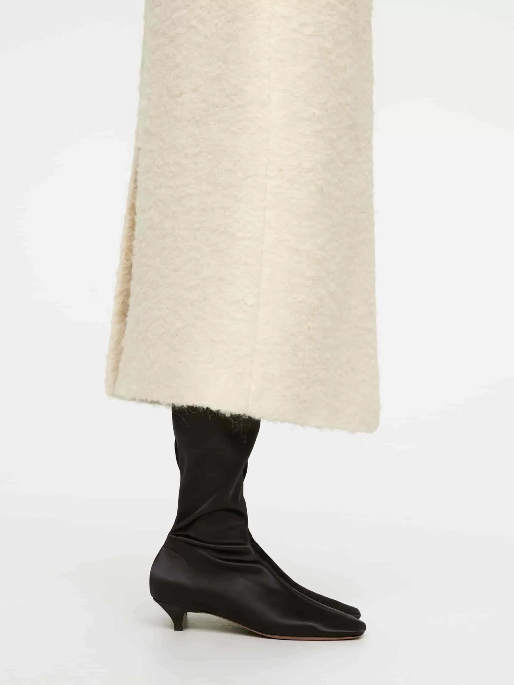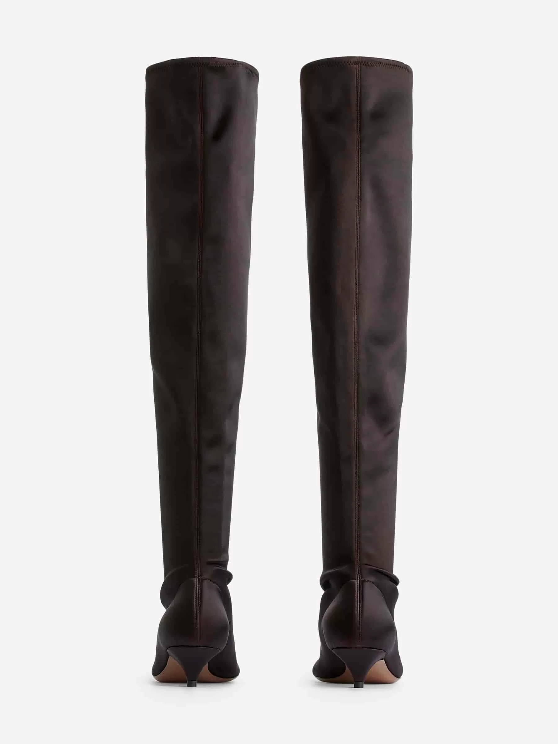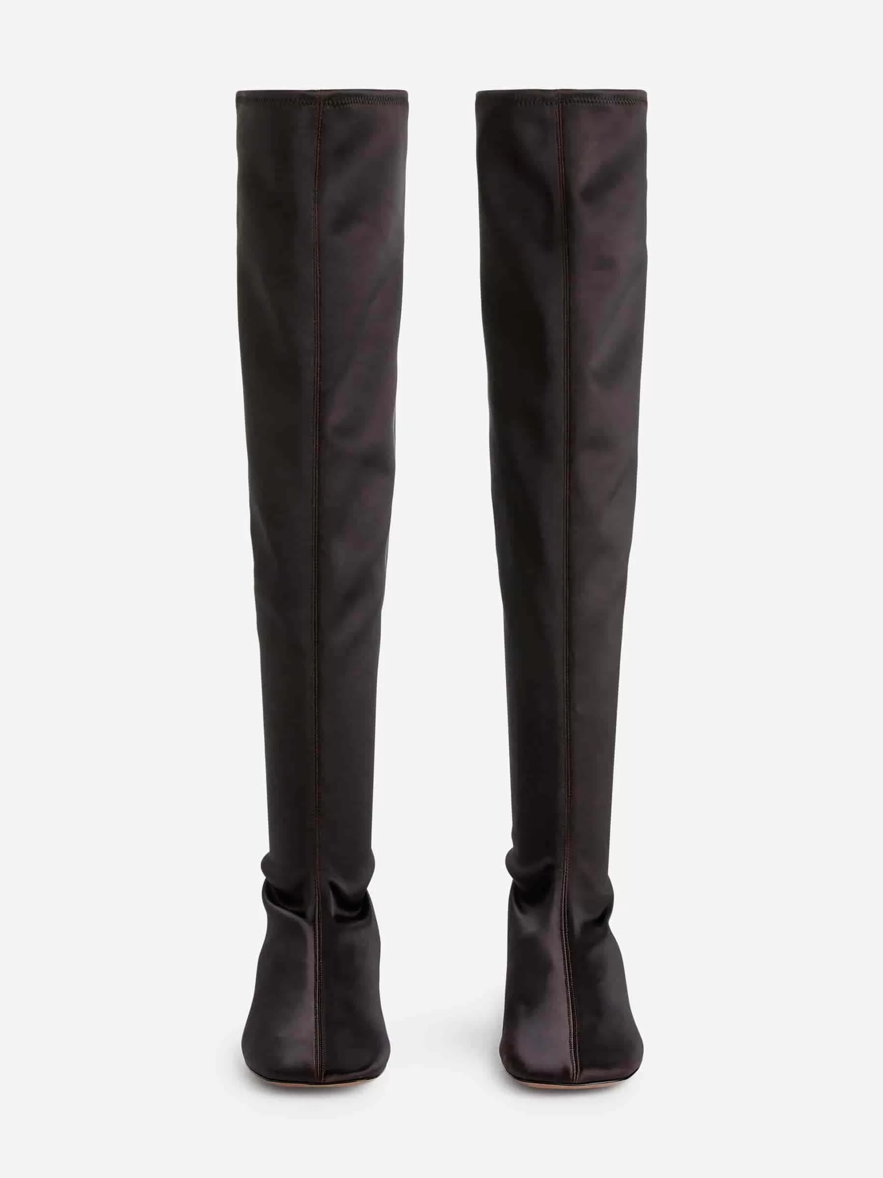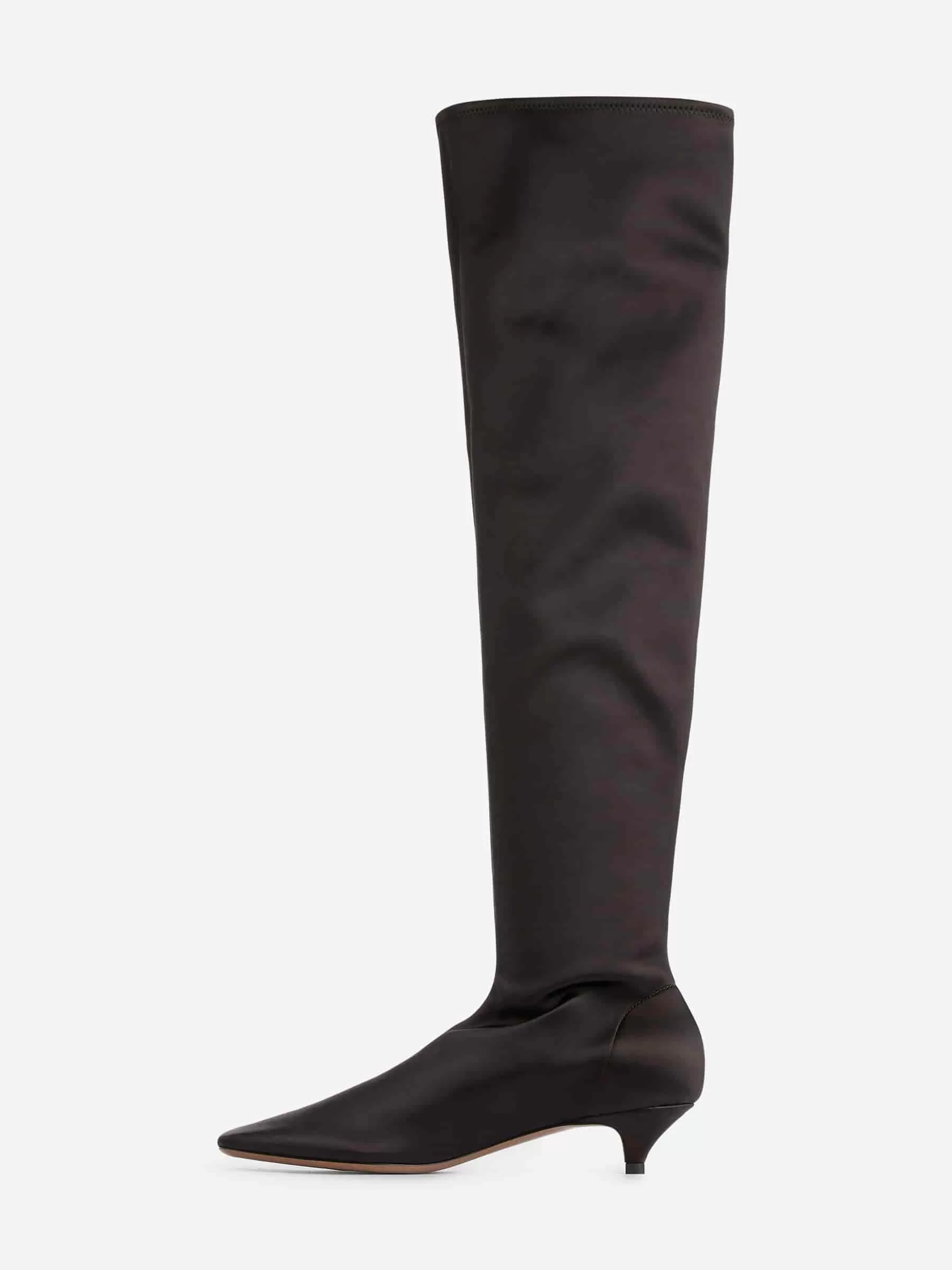 Over-the-knee satinstretchboots. En åtsittande stil med en fyrkantig tå med rundade hörn, en mittsöm fram och bak och en bekväm kattklack. Klackhöjd 4 cm.