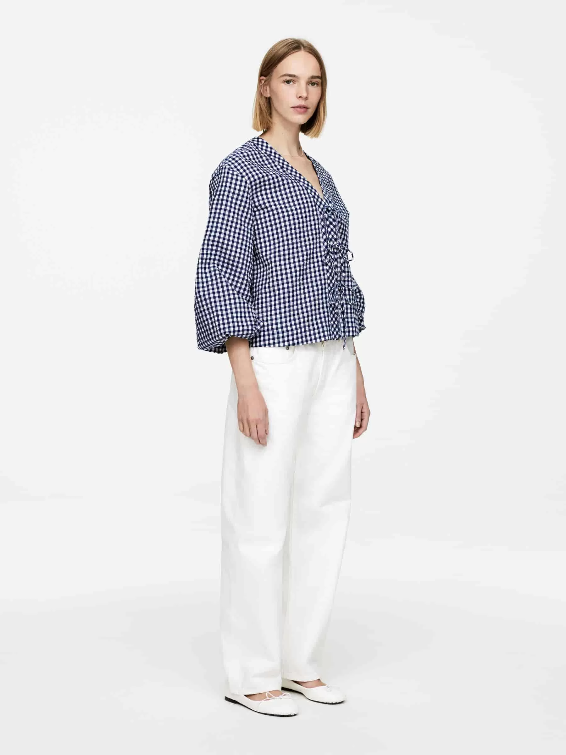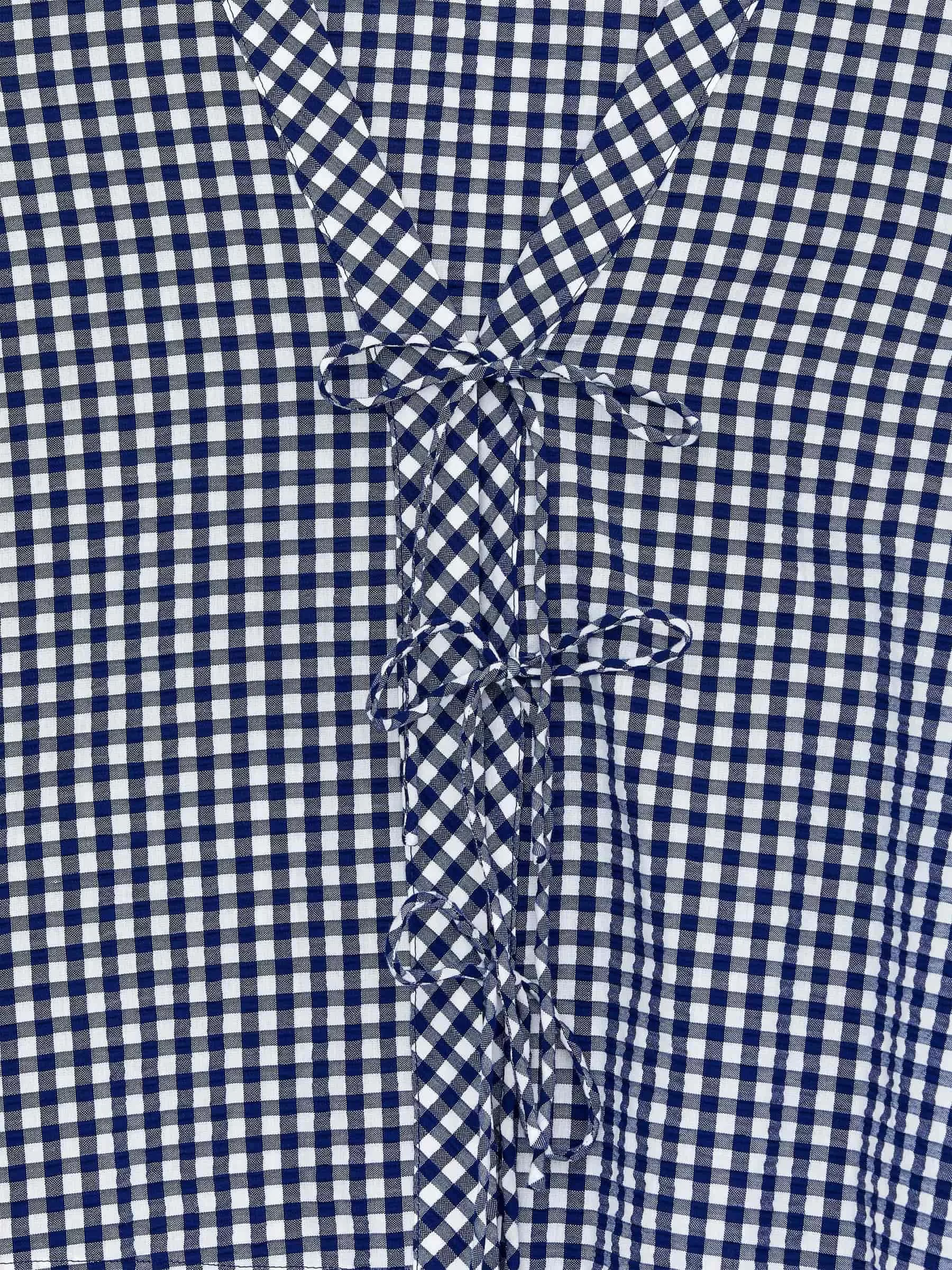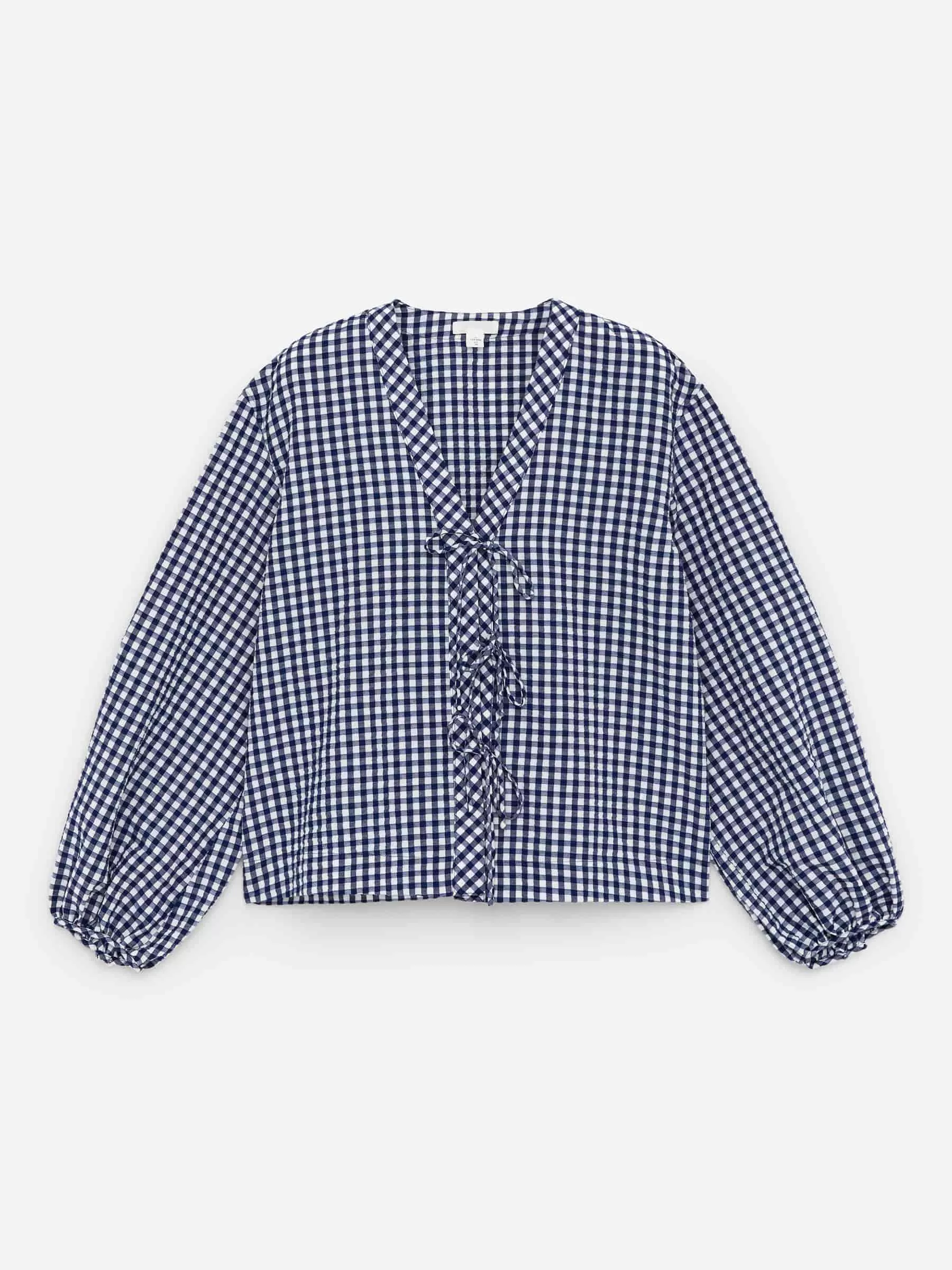 Blus tillverkad av ett seersucker-tyg med ett rutigt mönster. V-ringad modell med puffiga ärmar och knytband fram. Normal passform.