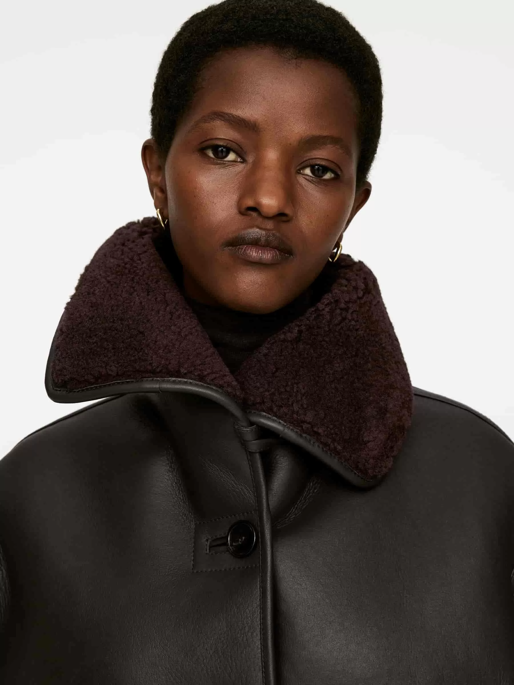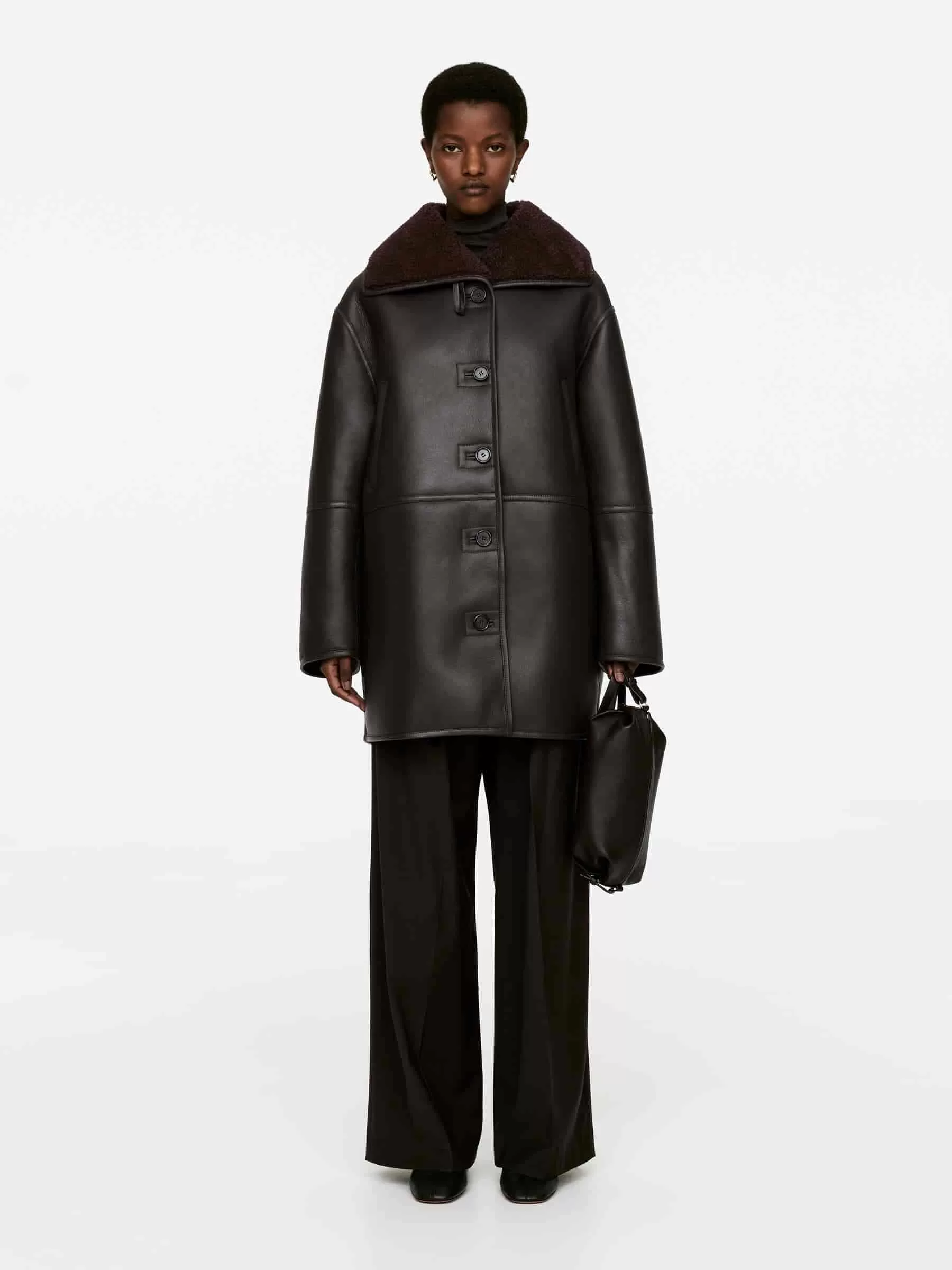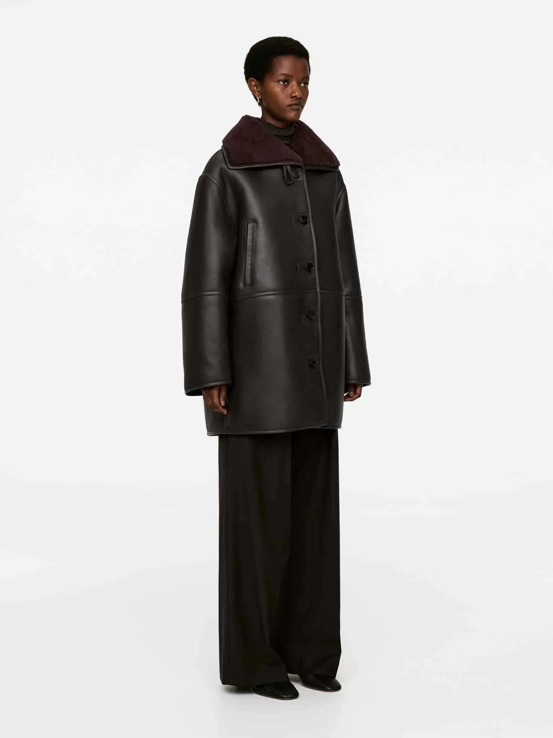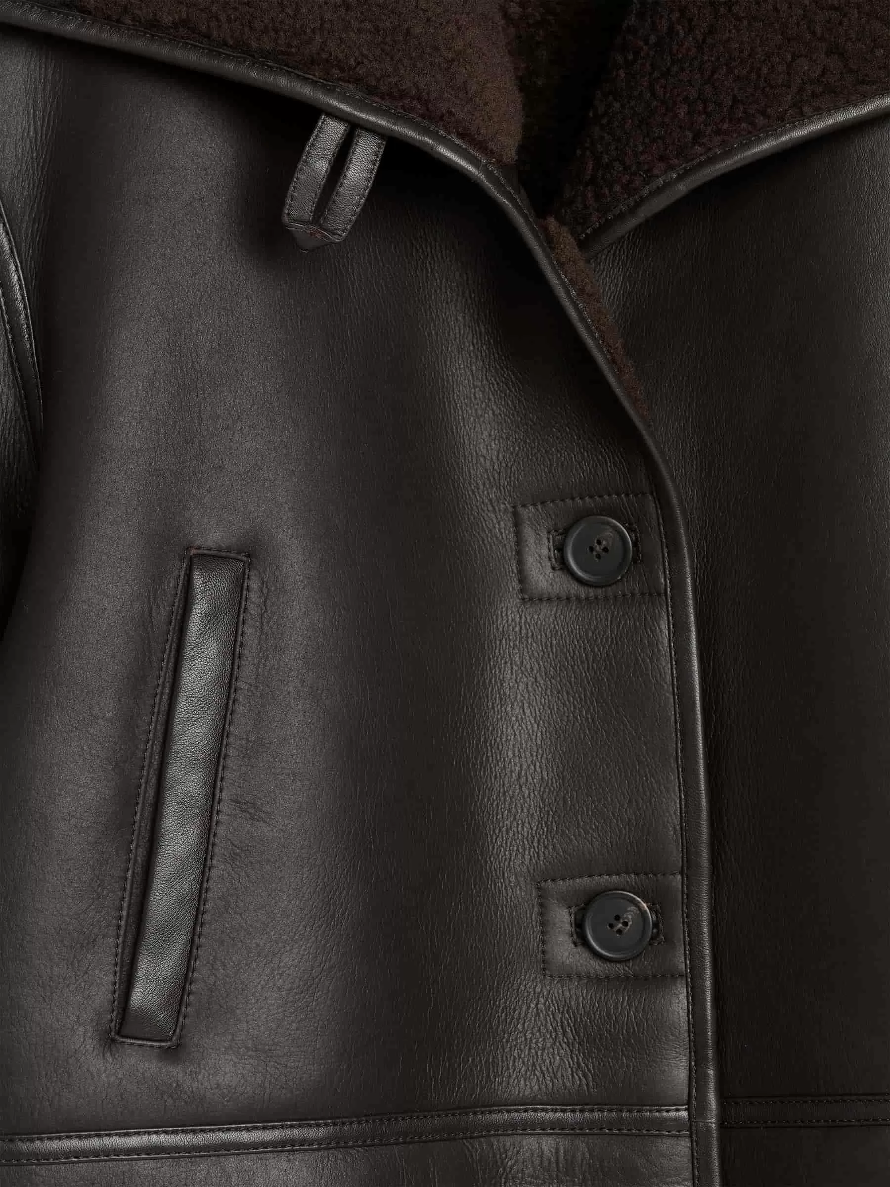 Enknäppt skinnjacka med mjuk insida. Designad med smala passpoalfickor, krage som kan vikas upp eller ner och knappstängning.