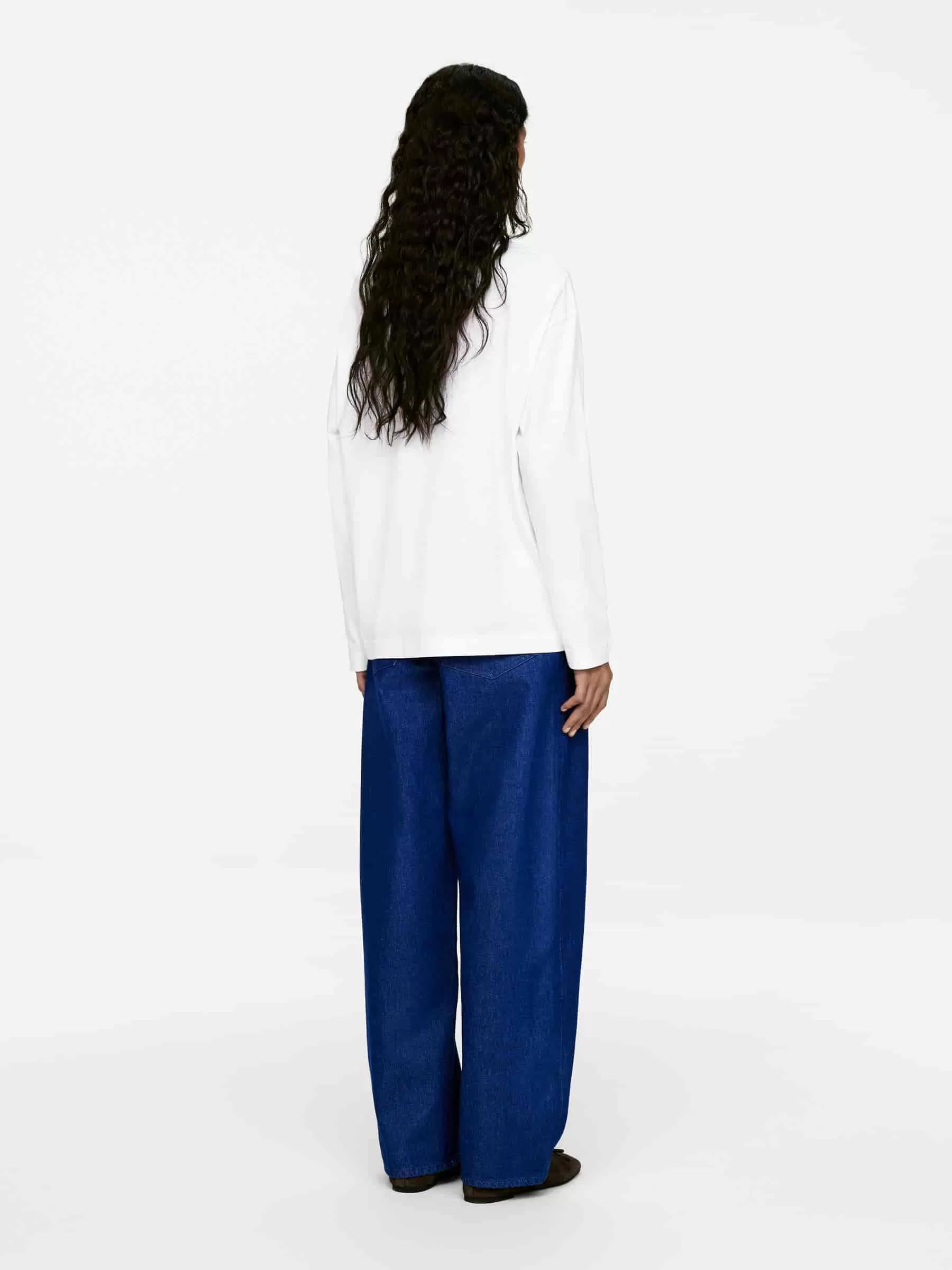 Mellanvikts T-shirt skuren av ett enkel jerseytyg gjord av bomull. En långärmad stil med en oversized passform och nedfällda axlar. Designad med en enda bröstficka.