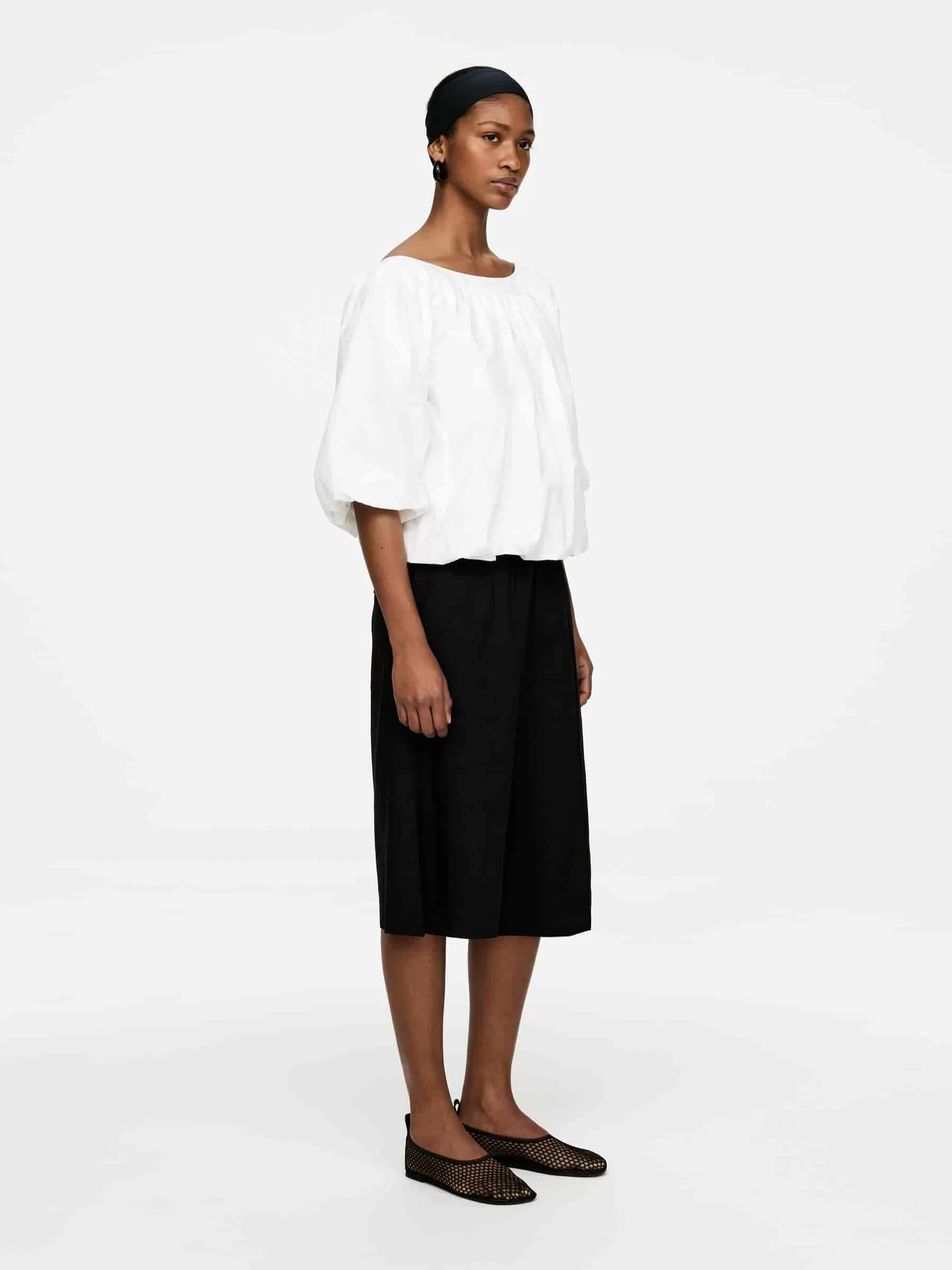 Långa shorts gjorda av en linneblandning. Designad med snedställda sidfickor och en lappficka baktill. Resår i midjan, sydda veck fram och pressade veck bak.