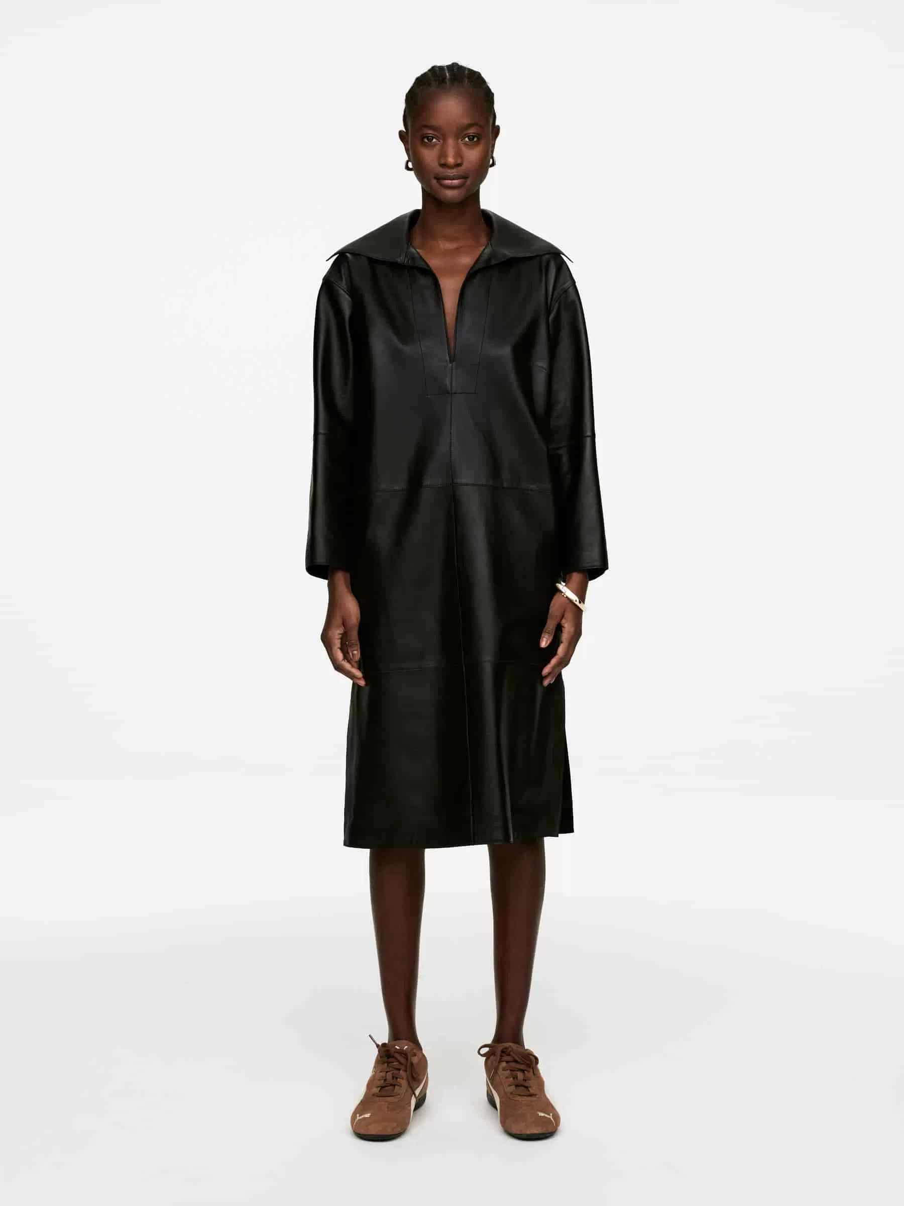 Klänning eller tunika i läder med öppen krage med brett slag och raka ärmar. Designad för en normal passform på kroppen och skuren för att falla i mitten av vaden. Rå finish med kantsömmar. Slits i sidorna.