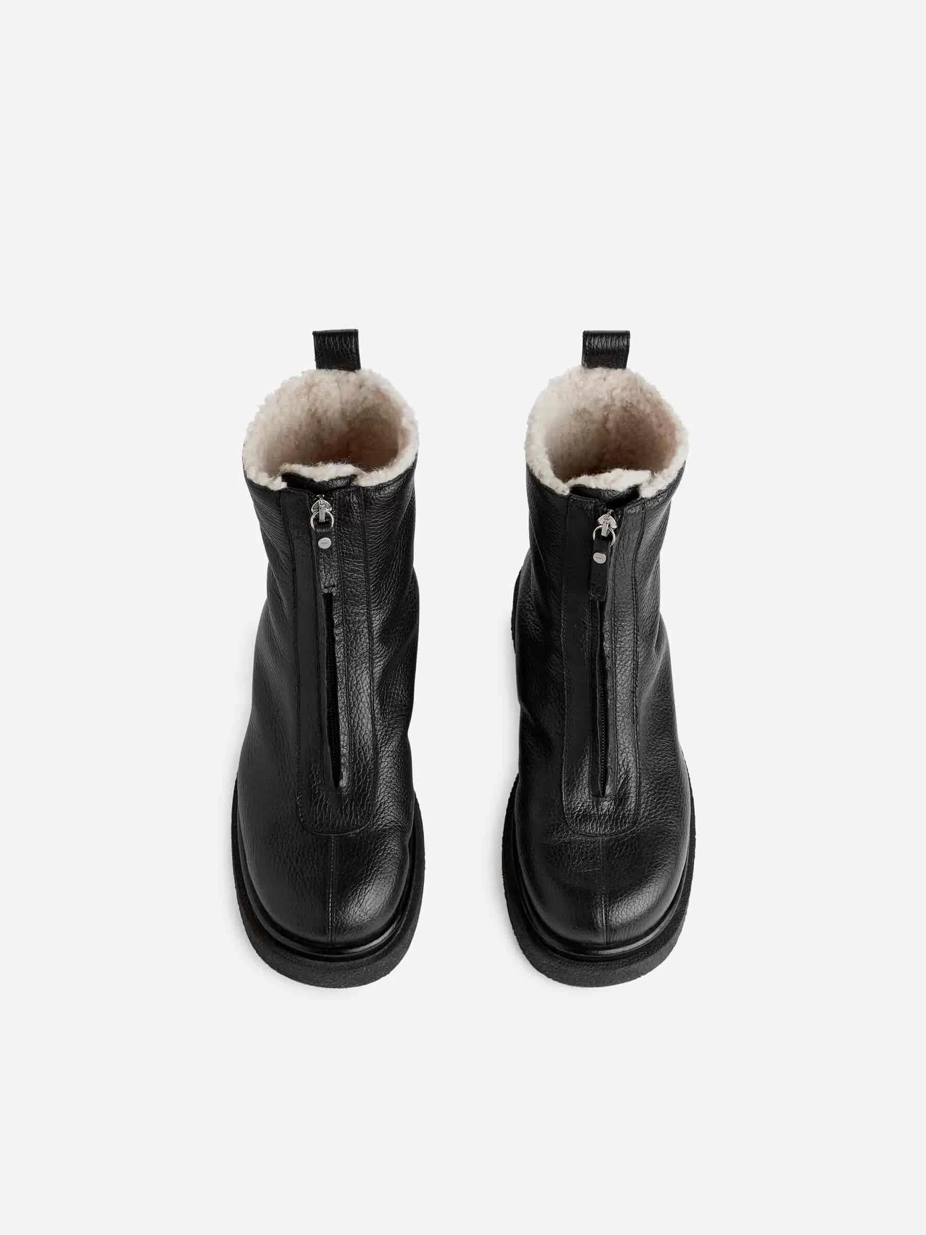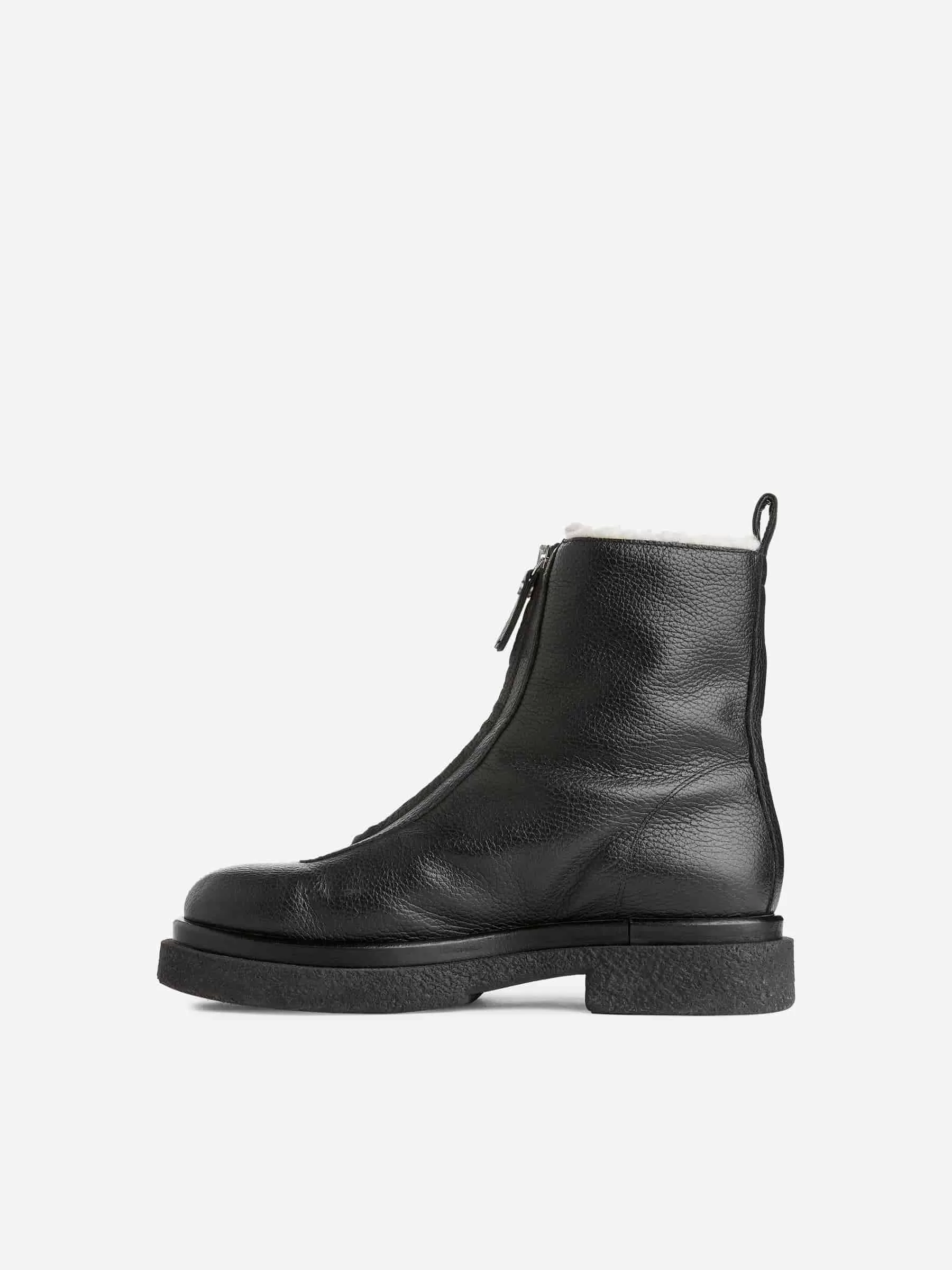Läderstövlar med fuskpälsfoder. En mellanhög stil med dragkedja framtill och en tjock gummisula. Lädret som används har genomgått en kromfri garvningsprocess.