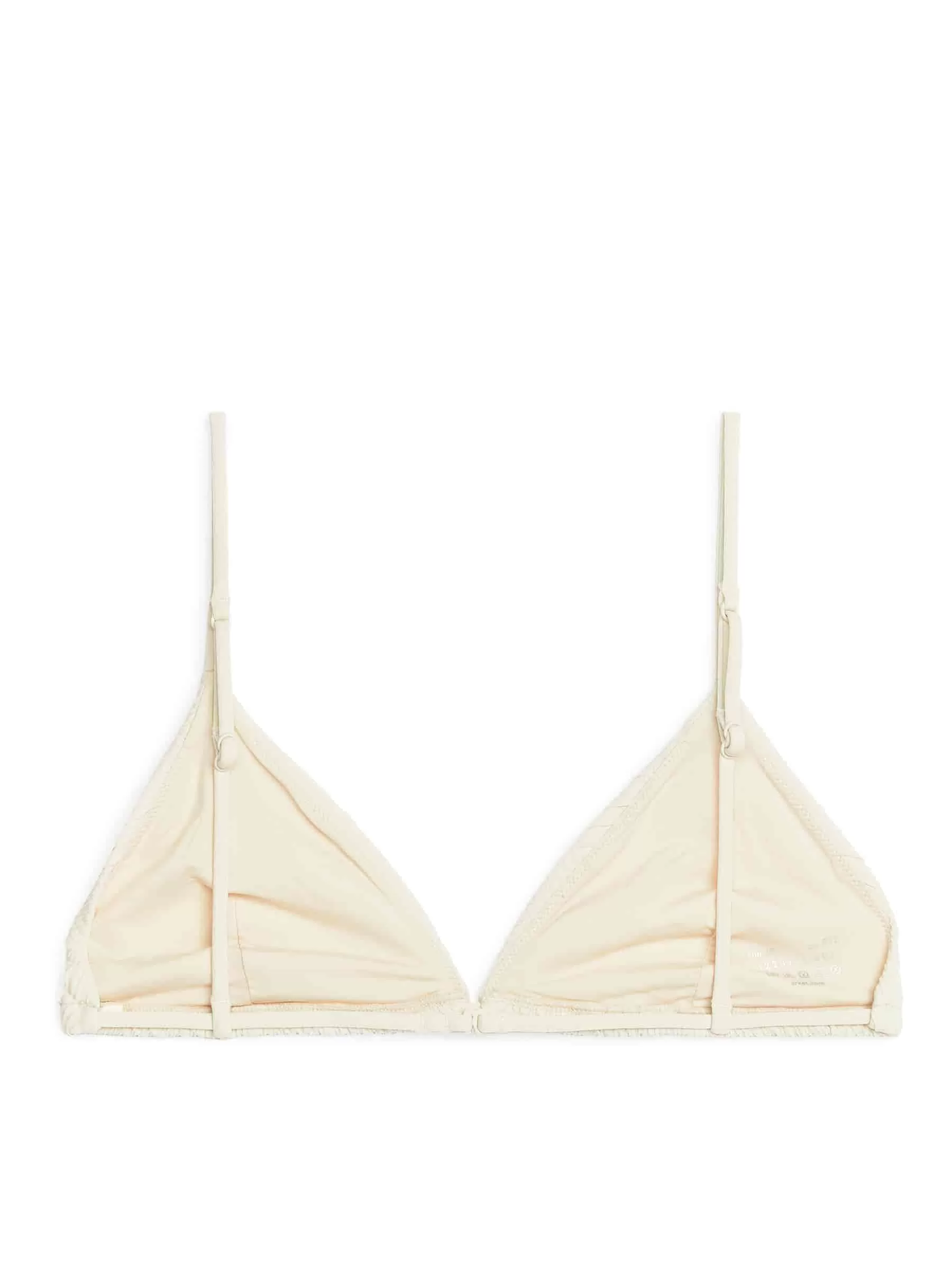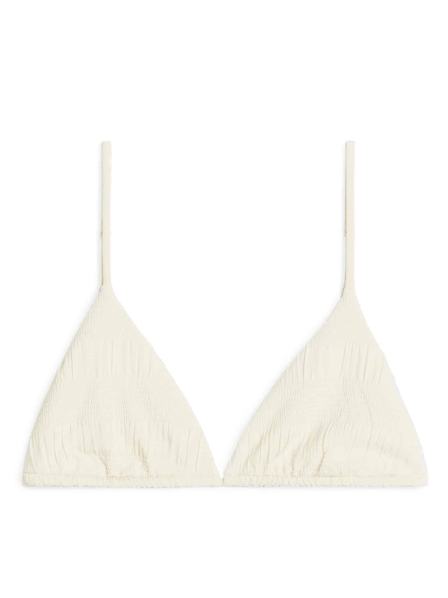 Triangel bikiniöverdel tillverkad av ett stretchigt tyg med smockdetaljer. En helfodrad stil med smala, justerbara remmar. Lågt stöd.