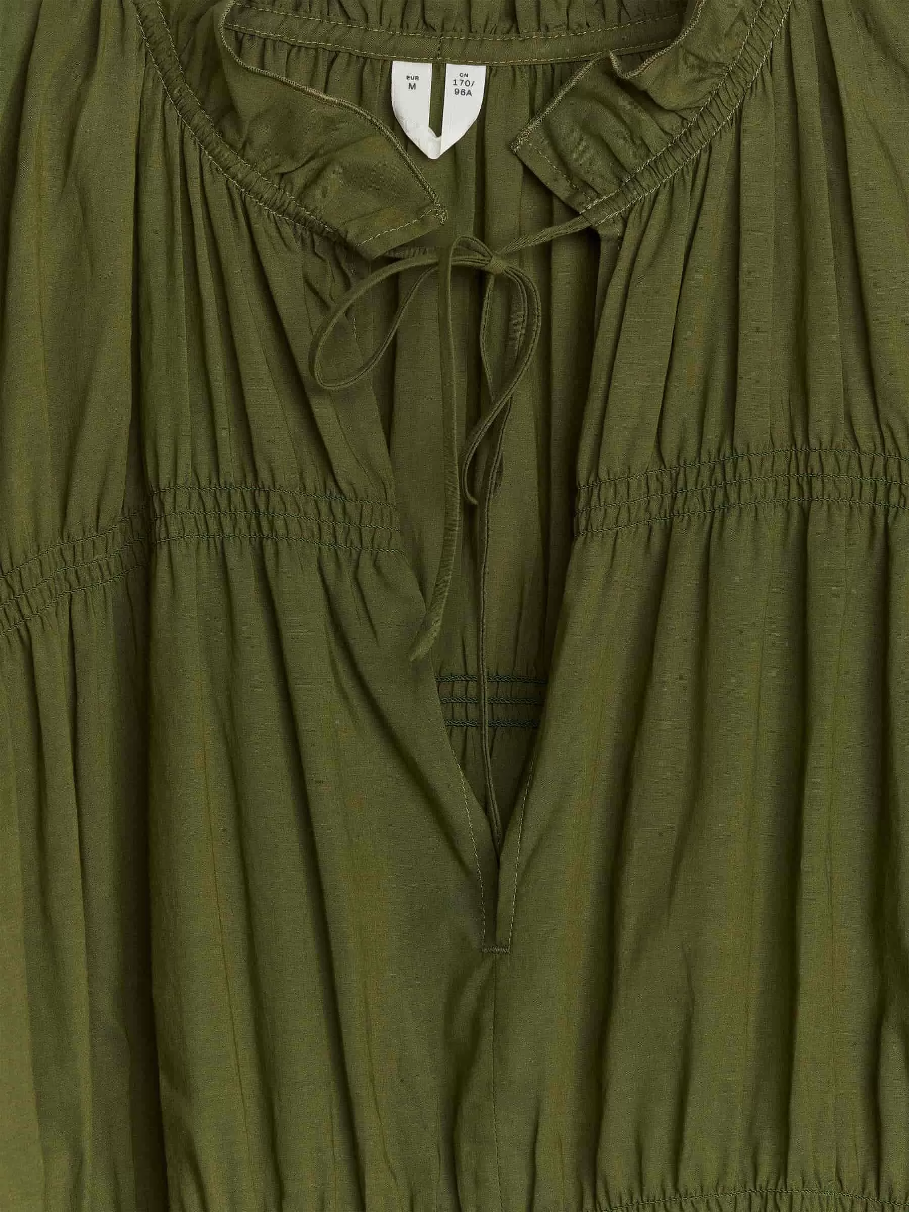 Maxiklänning med långa ärmar och avslappnad passform. Stylad med dragsko i halsen och elastiska smockdetaljer.