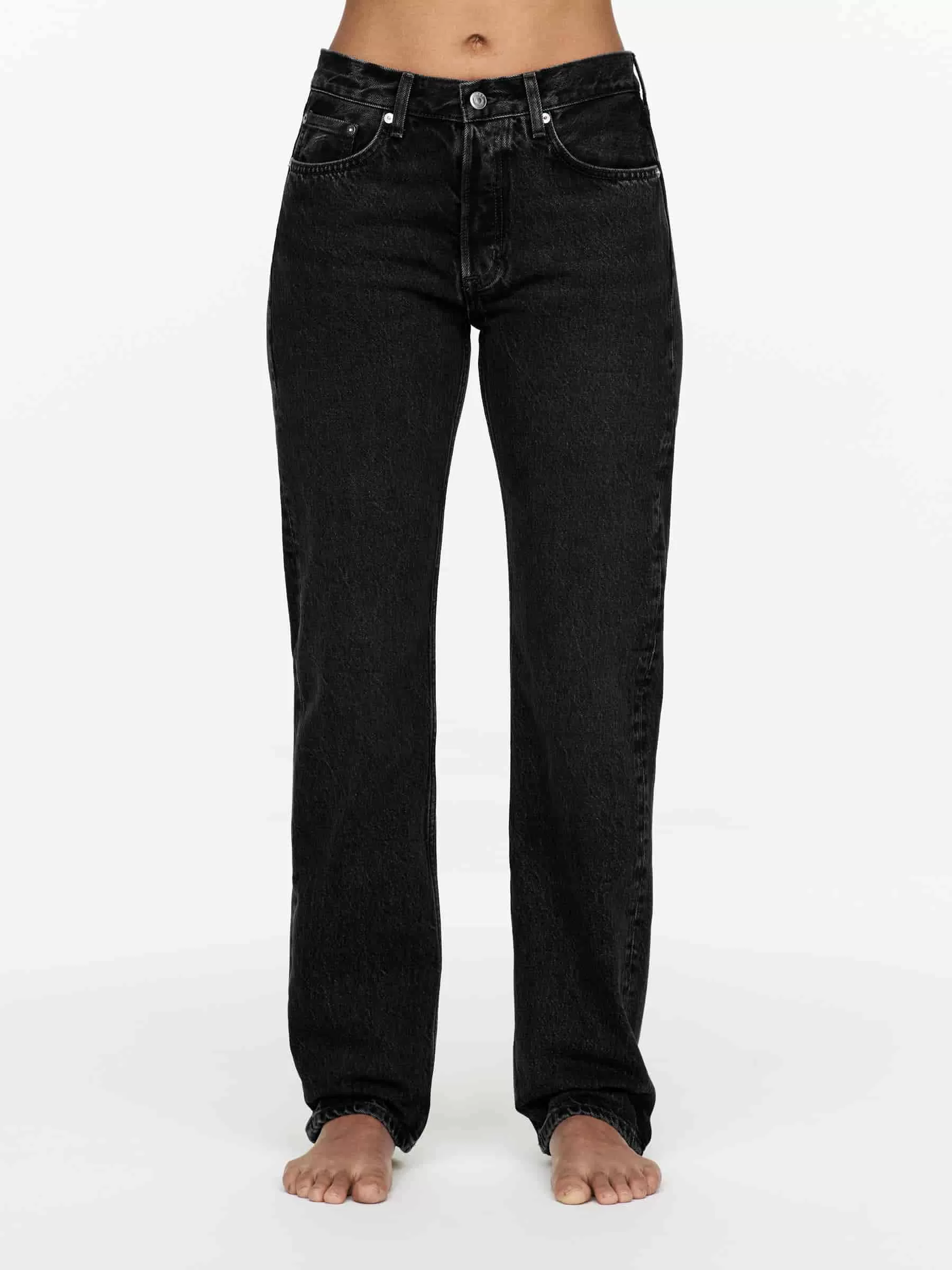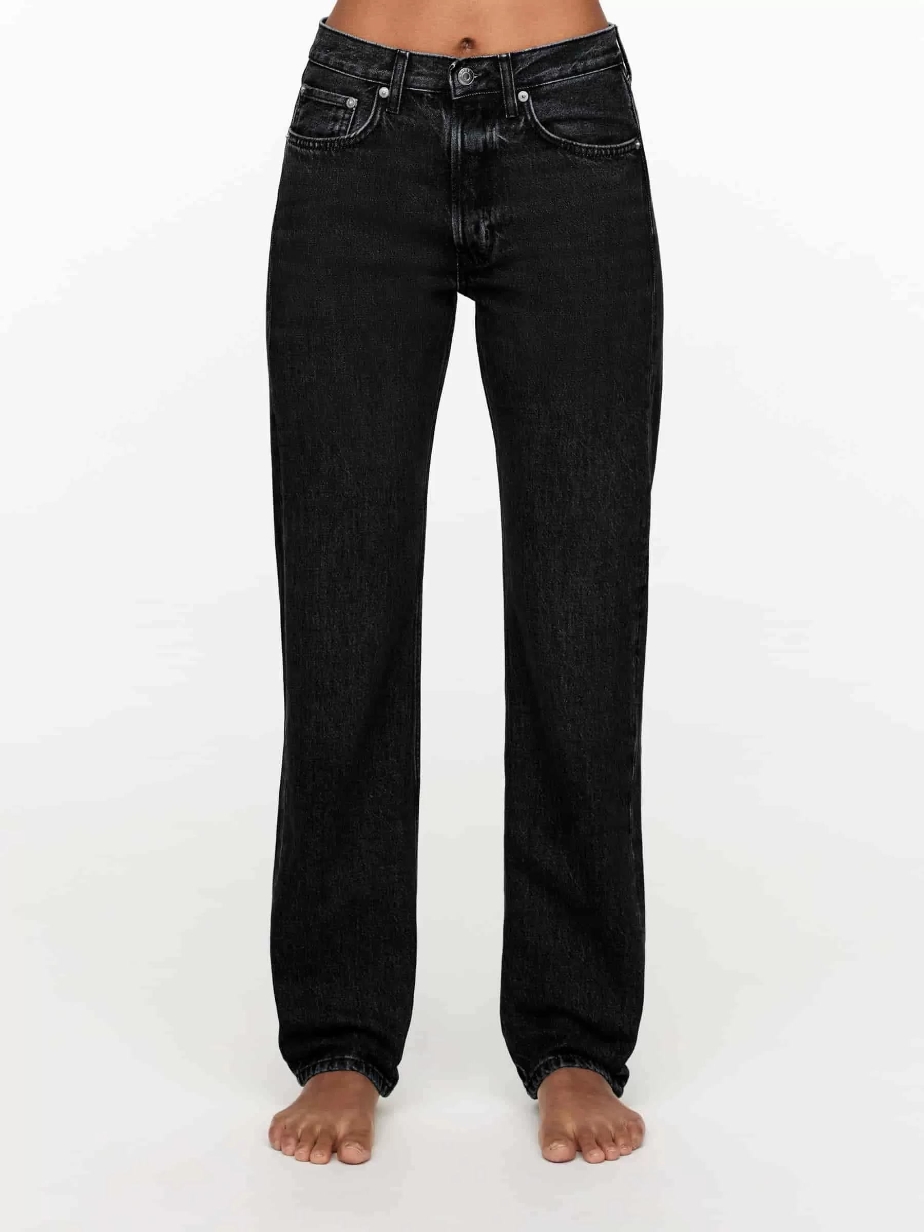 SNOW är skuren av non-stretch denim och har en medelhög midja, smal passform och raka ben. Knappgylf.