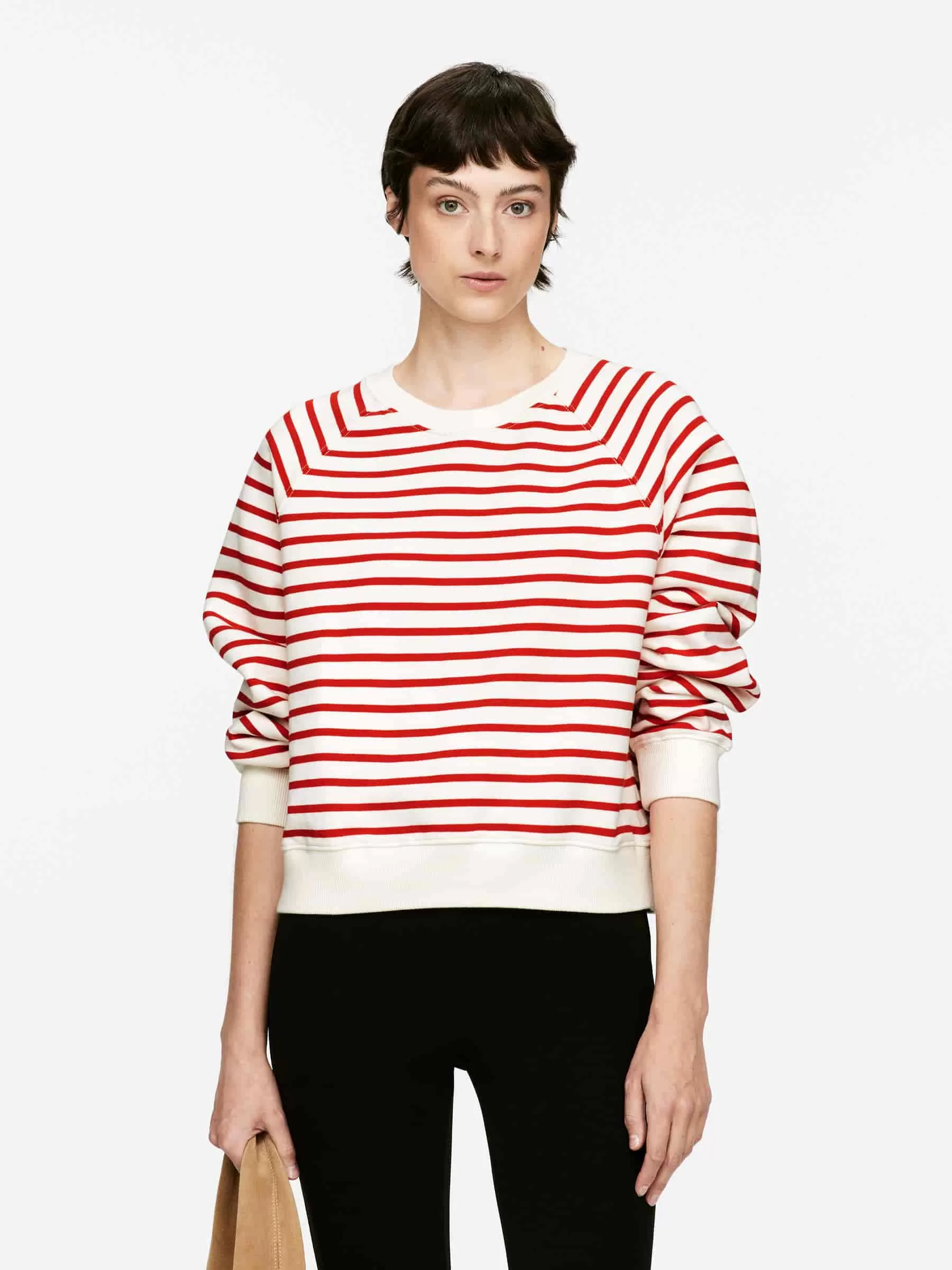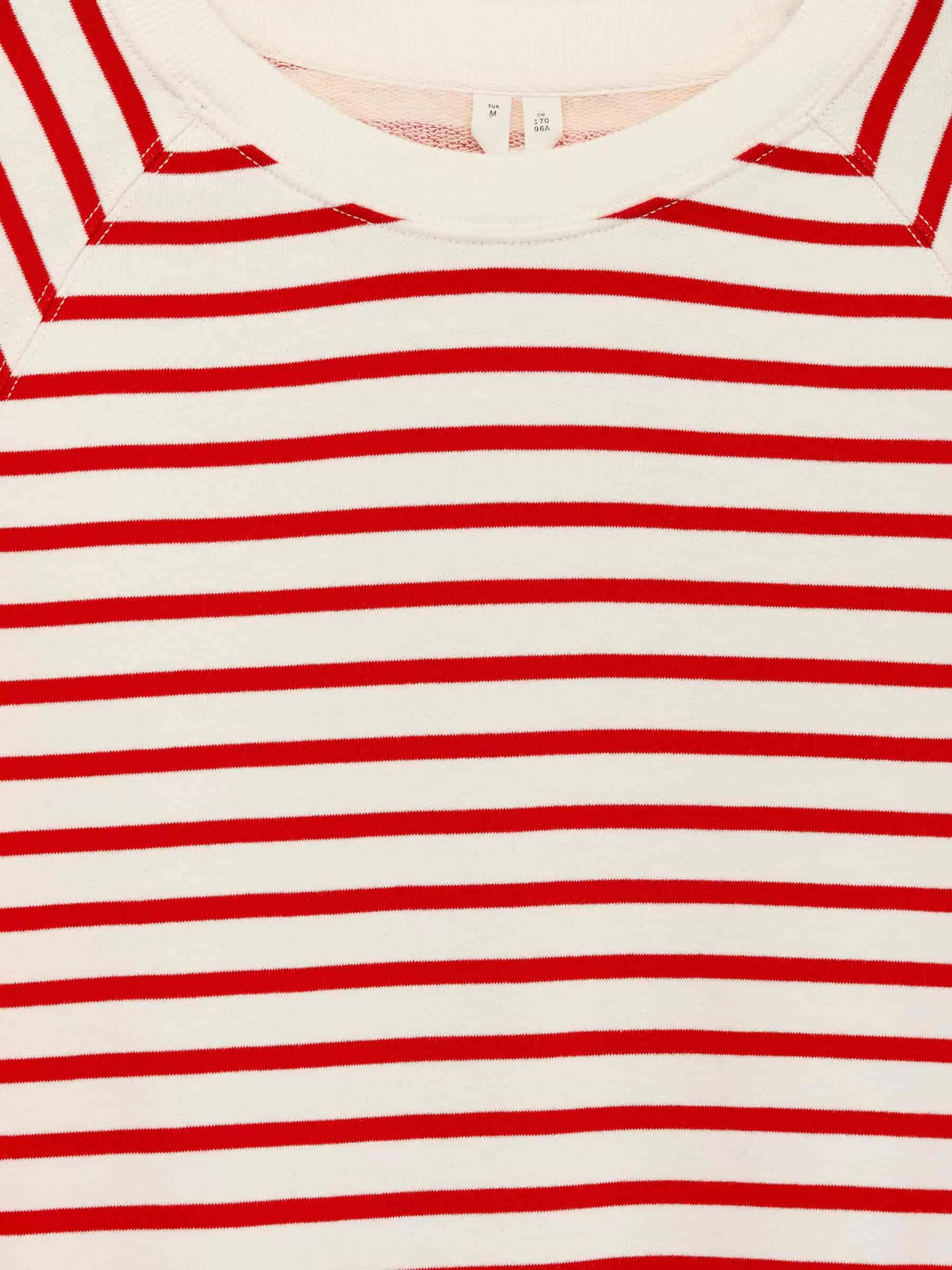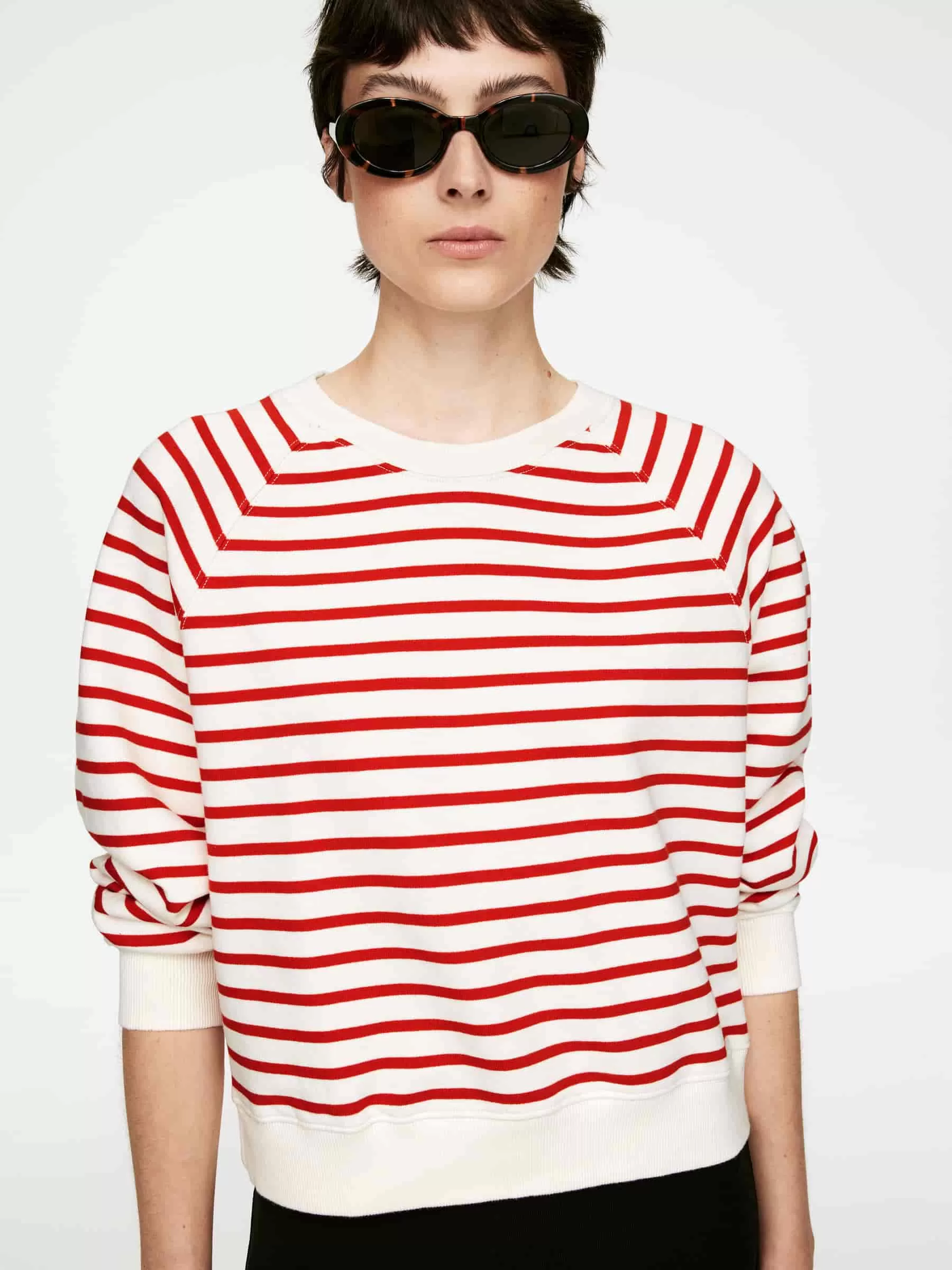 Tröja med rund hals gjord av garnfärgad fransk frottébomull. En lätt beskuren stil med raglanärmar och ribbad kant. Normal passform.