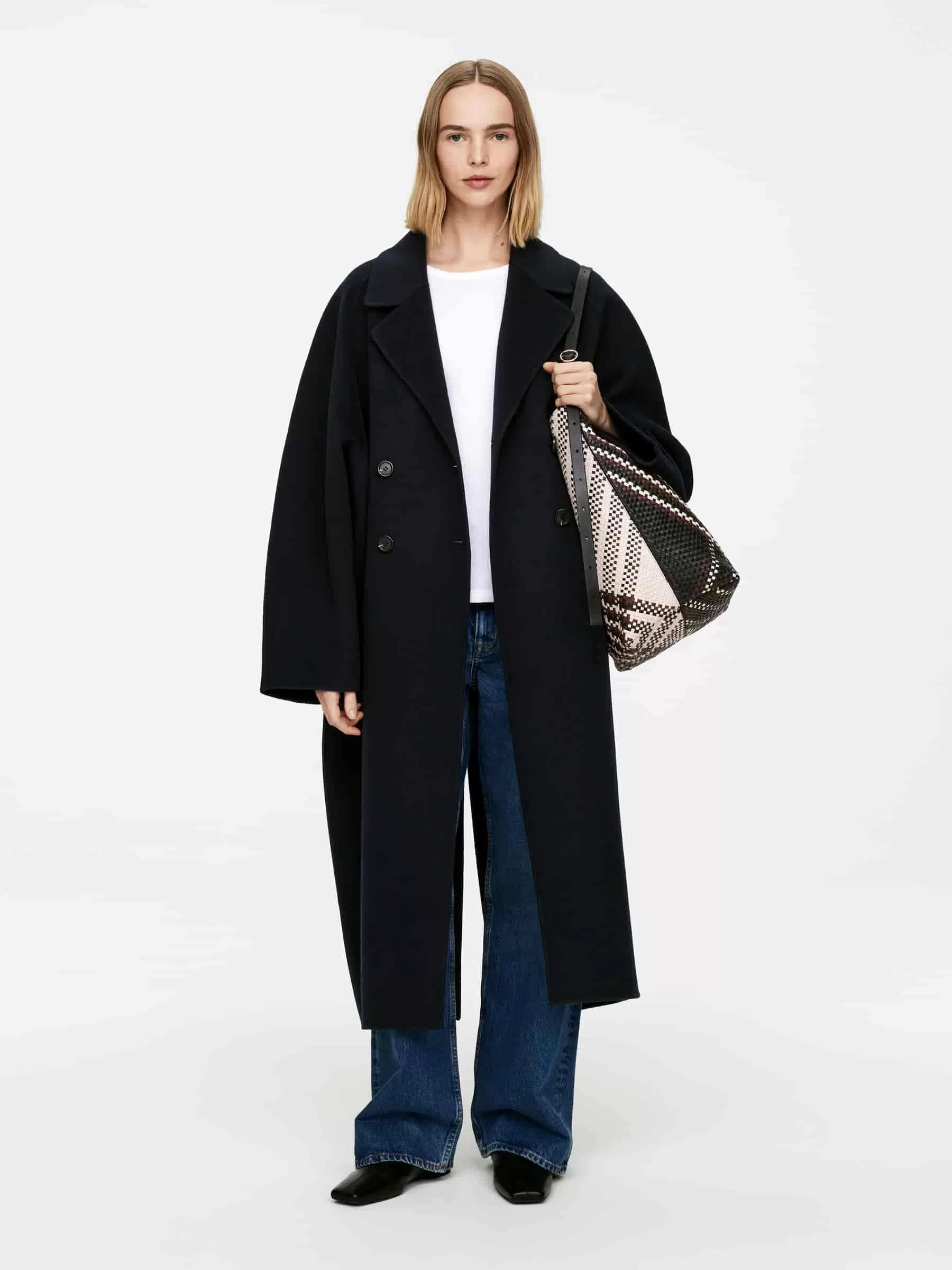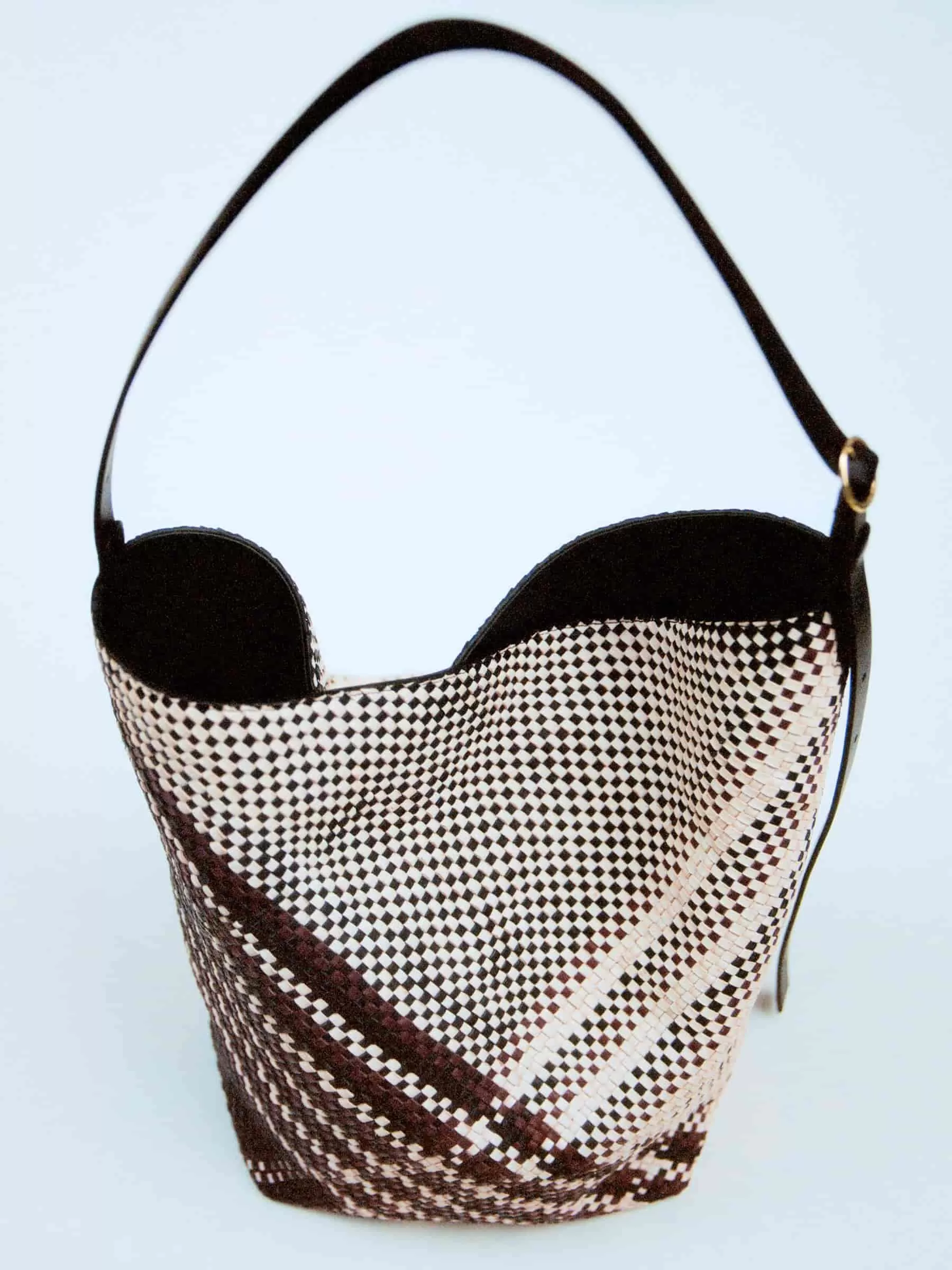 Byggväska i vävt läder med bomullsfoder. Styled med en lång, smal läderrem med hål hela vägen för justerbarhet och ett litet dekorativt runt guldtonat spänne. Väskan kan bäras på axeln eller som crossbody. Magnetstängning. Innerficka med dragkedja. Höjd 37 cm, bredd (överst) 46 cm, bredd (botten) 22,5 cm, djup 20 cm.