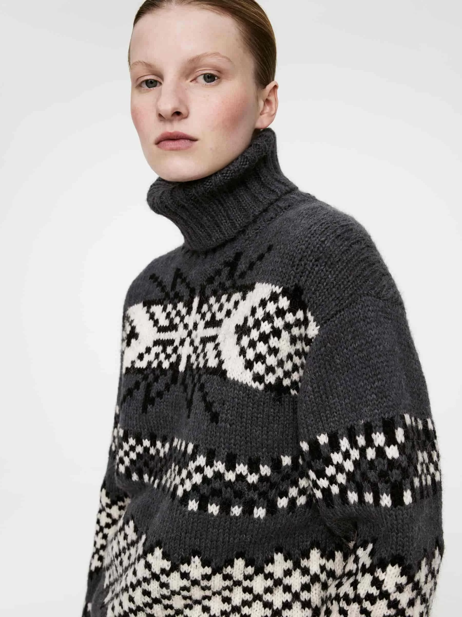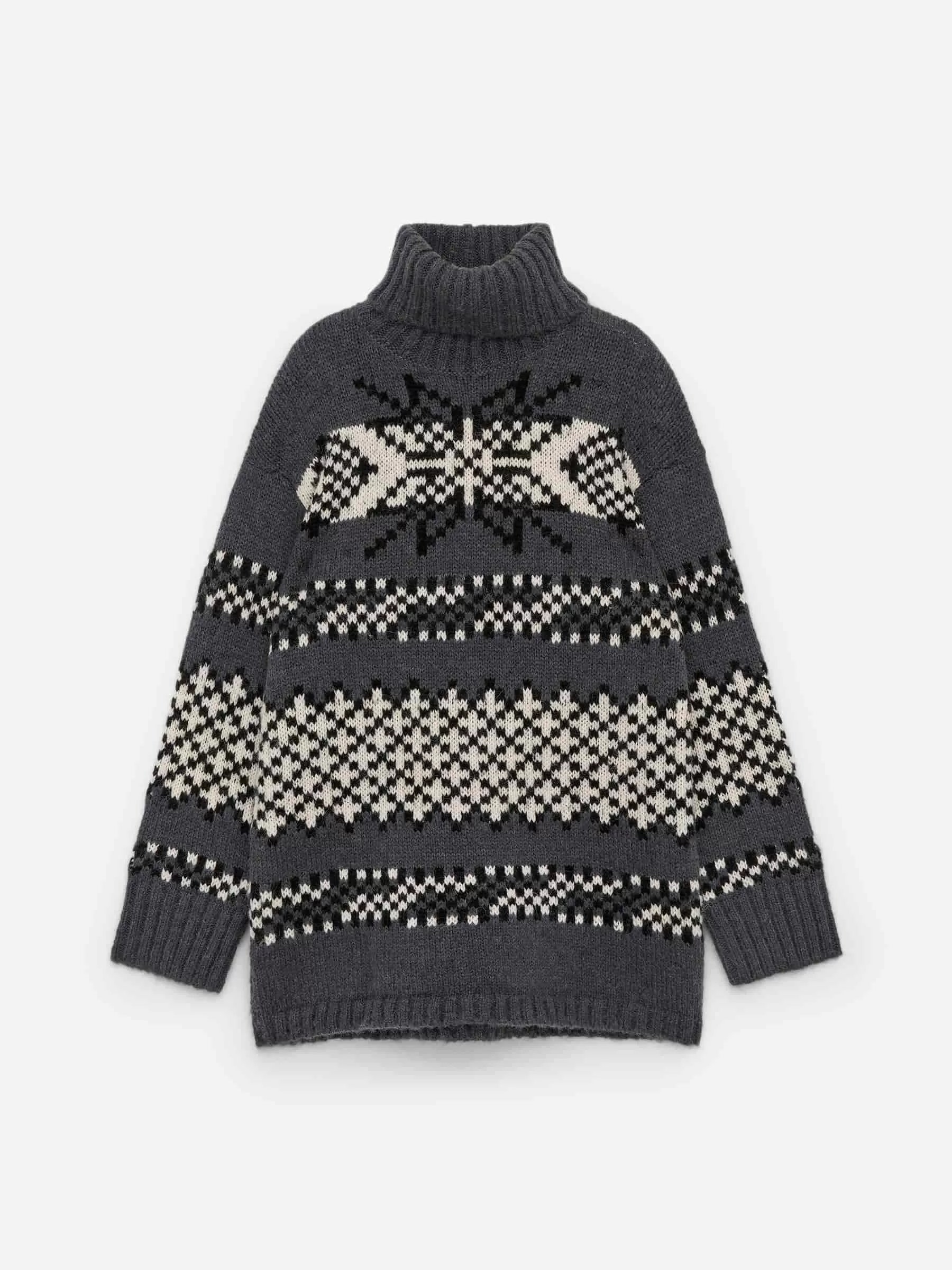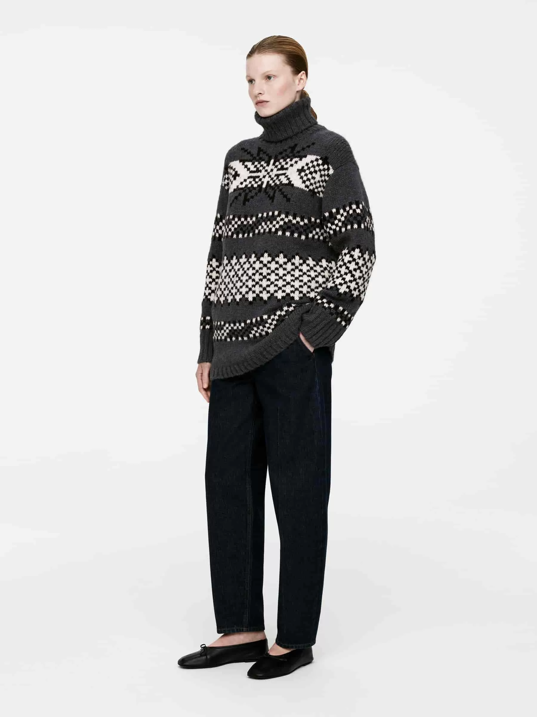 Jacquardstickad tröja tillverkad av en blandning av ull och alpacka. Stylad med rullkrage och ribbad kant. Avslappnad passform. Denna stil innehåller 44 % RAS Alpaca och 56 % RWS-ull (TE-00047206). Produkter certifierade enligt Responsible Wool Standard (RWS) och Responsible Alpaca Standard (RAS) innehåller ull och alpackafiber från gårdar som är oberoende certifierade enligt kraven på djurskydd och markförvaltning.