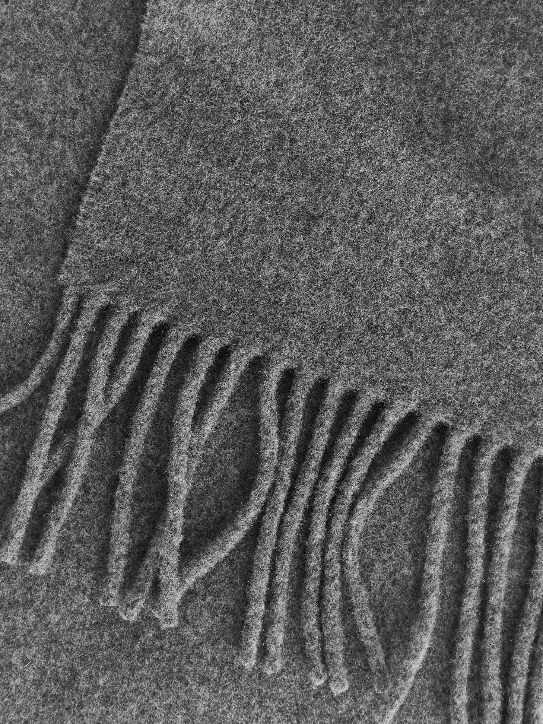 Scarf tätt vävd av ull. Detaljerad med fransar längs de kortare kanterna. Mått 27 cm x 250 cm.