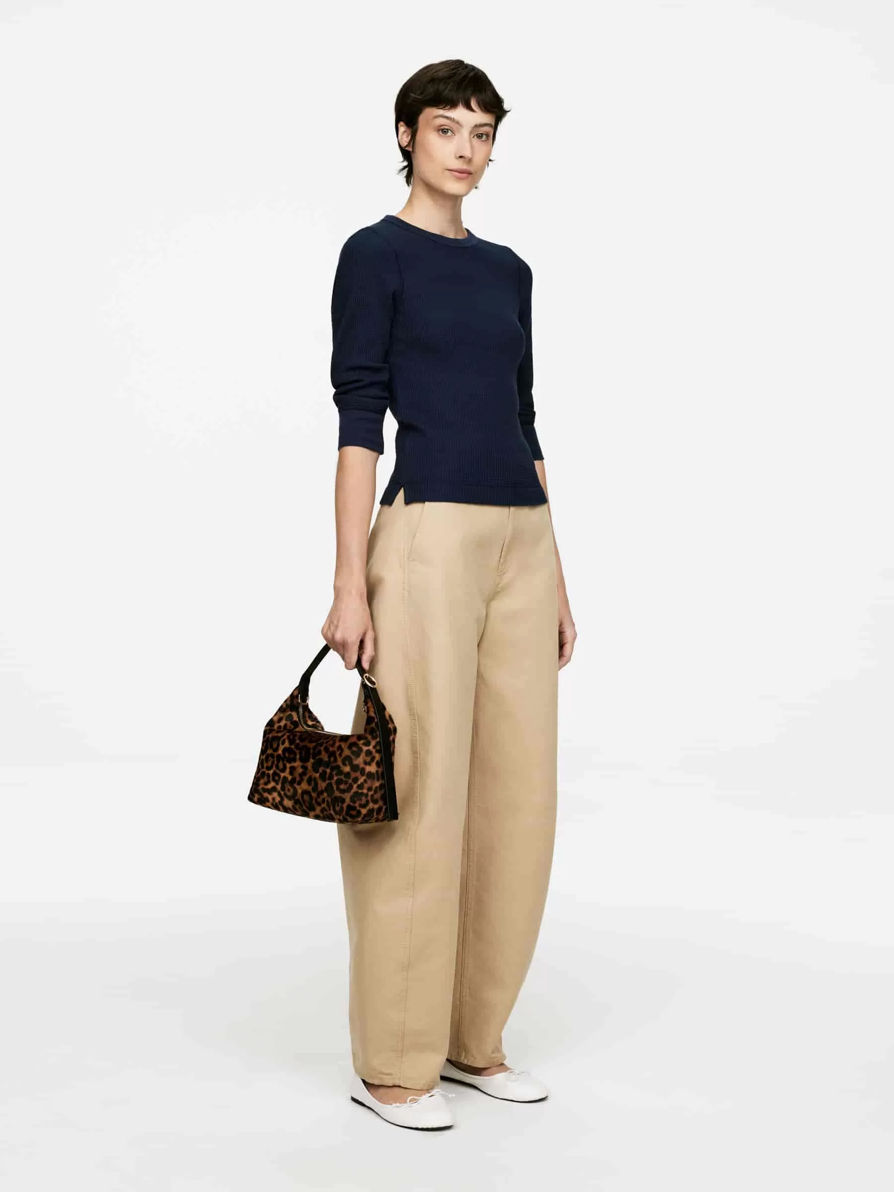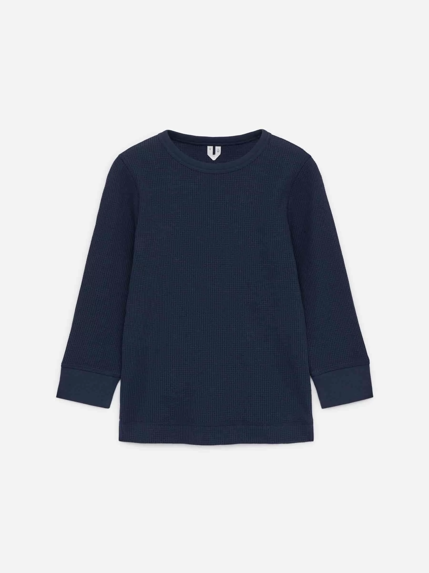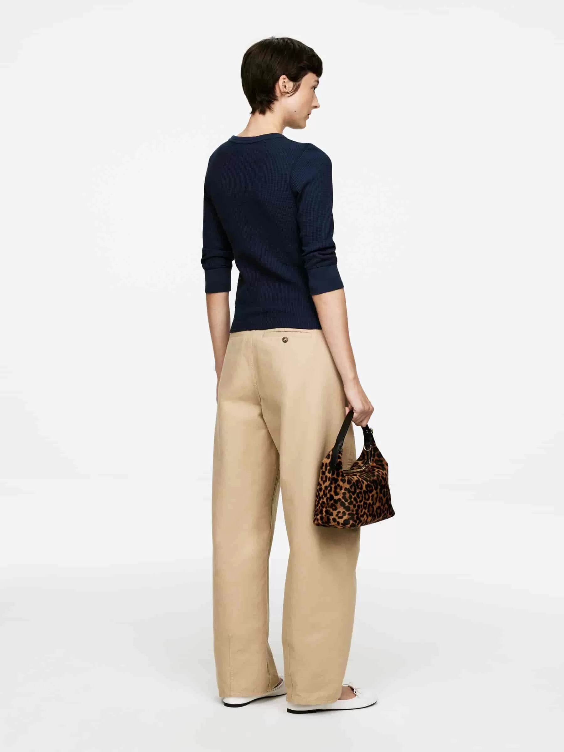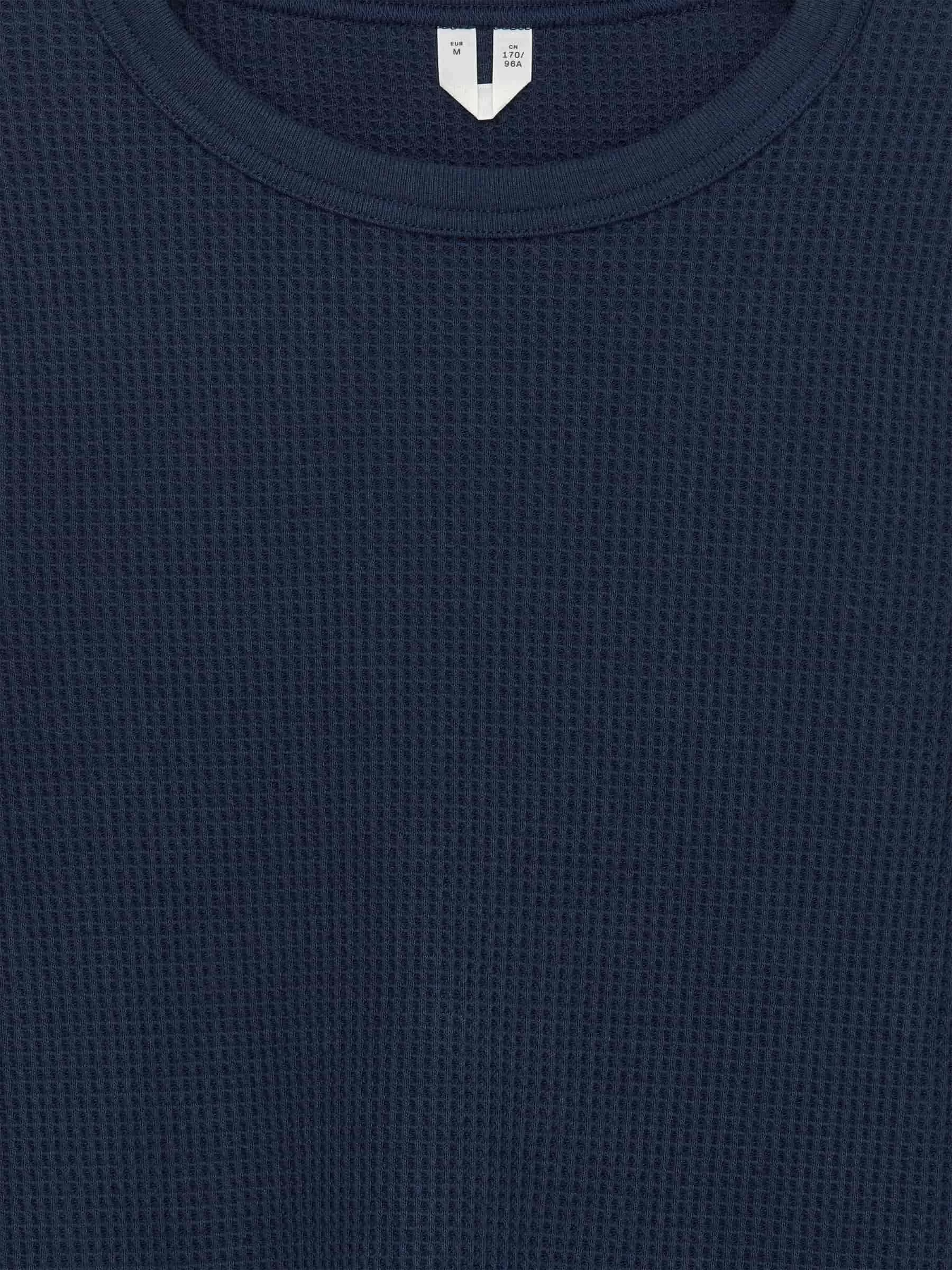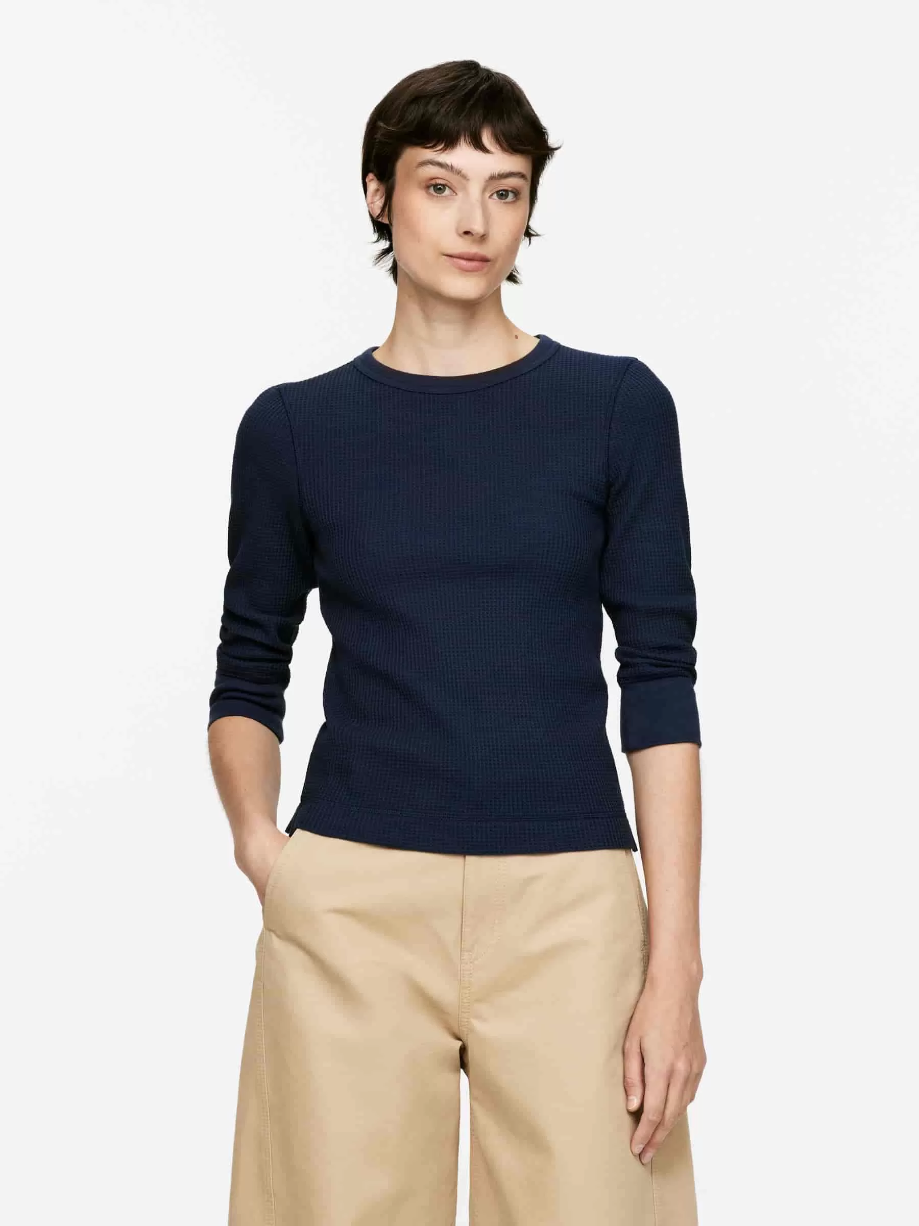 Slim-fit topp gjord av en bomullsjersey med våffelstruktur. En rund halsad stil med 3/4-ärmar och breda, ribbstickade muddar. Kort slits i sidsömmarna.