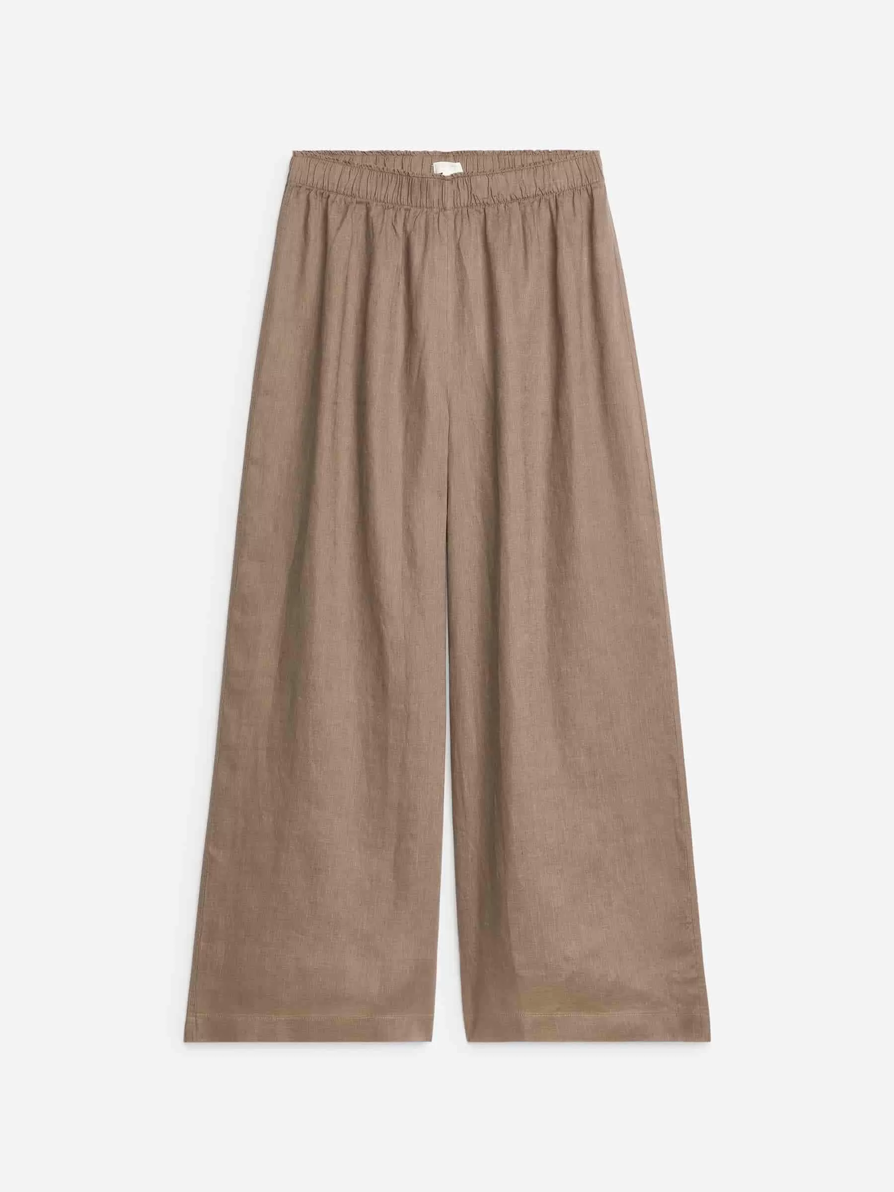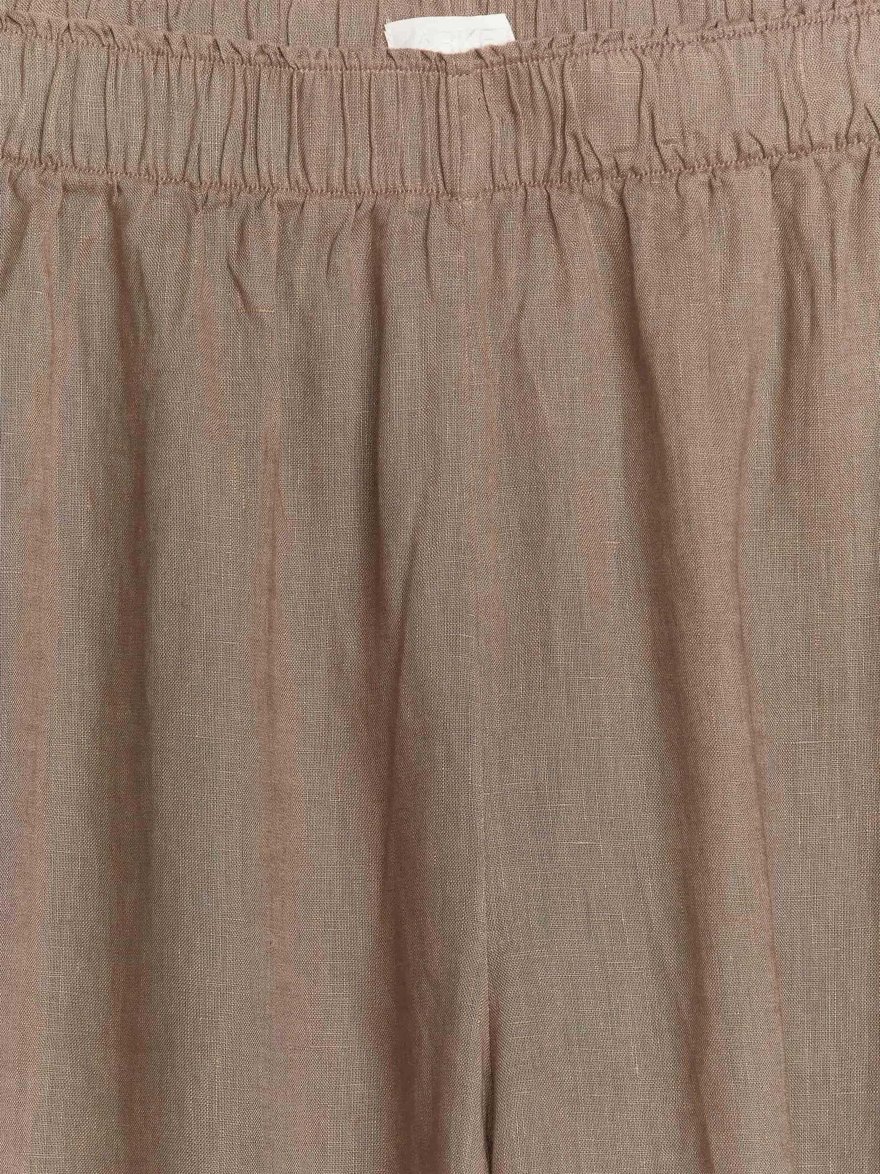 Byxor med vid passform gjorda av rent linne. Detaljerad med breda resår i midjan.