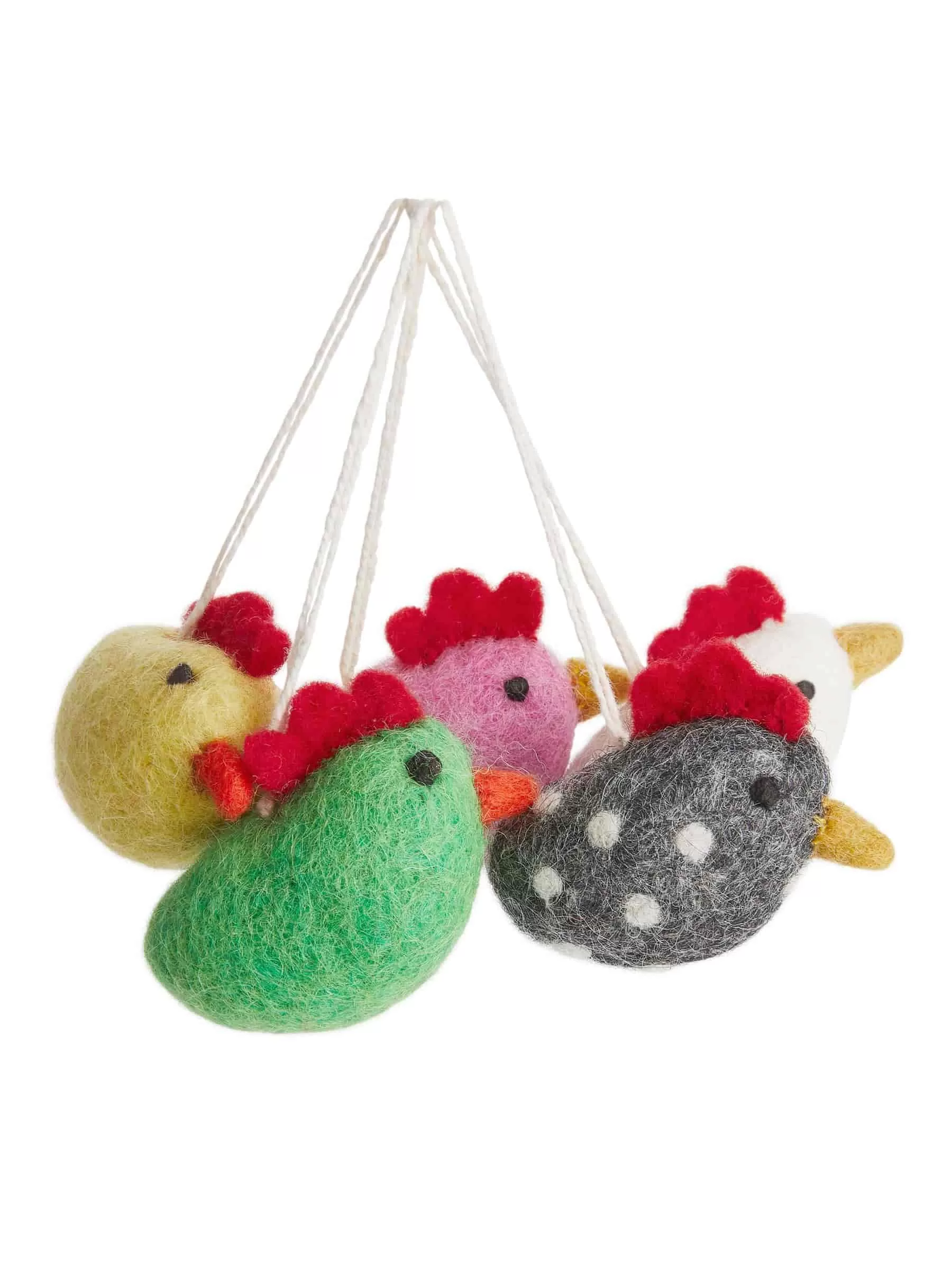 De här festliga dekorationerna är gjorda av tovad ull, handgjorda av små företag på landsbygden i Nepal. I setet ingår fem små kycklingar med hängslingor. Dekorationerna kan enkelt placeras runt om i huset och kan även användas som bordsdekorationer. Designad av det svenska Fairtrade-märket A World of Craft. Cirka 4 cm x 5 cm.