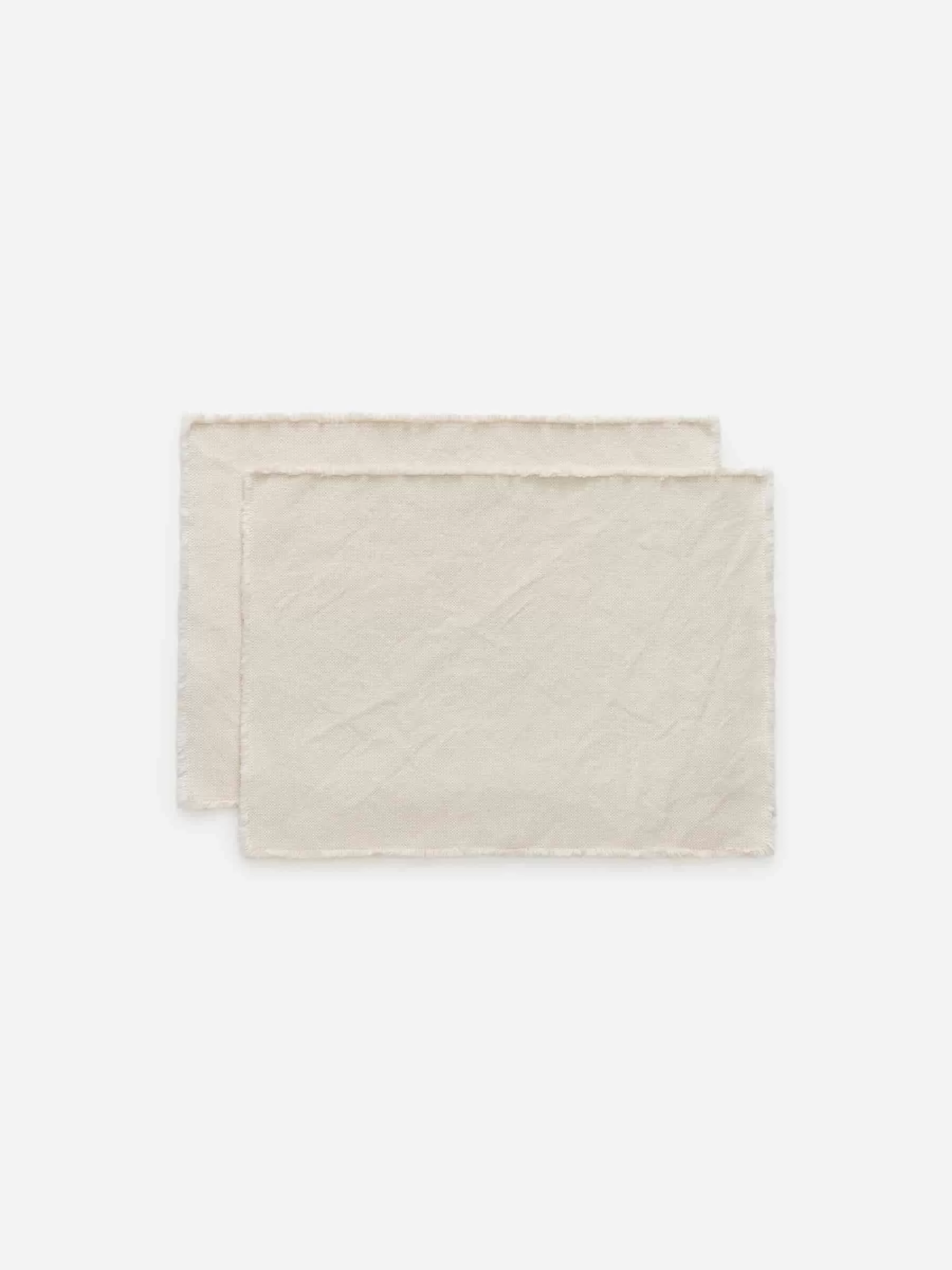 Däckunderlägg med slitna kanter tillverkad av en blandning av bomull och linne. Säljes i ett set om två.
