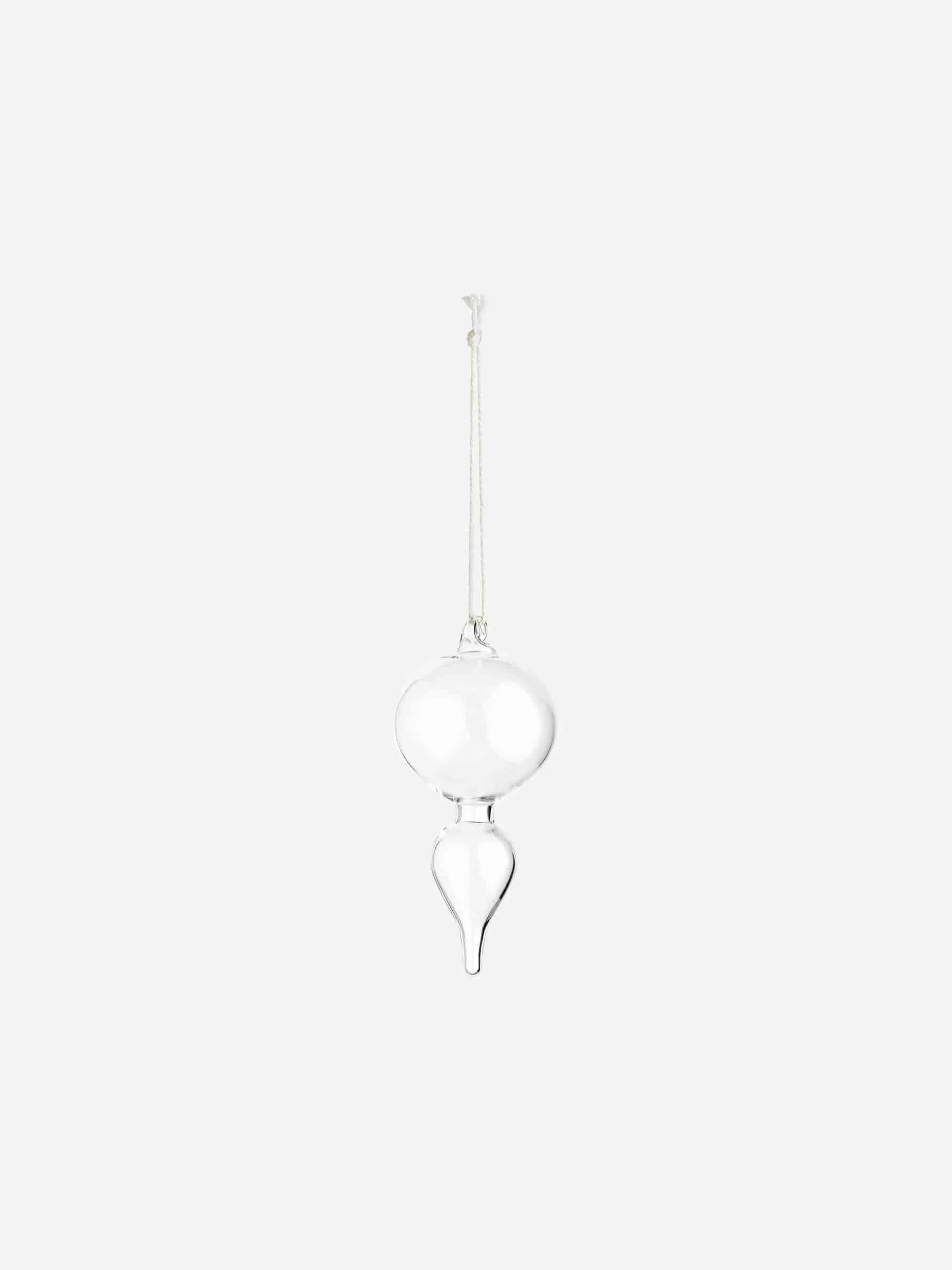 Delikat grannlåt av glas. Snöre för enkel upphängning. Höjd 10,5 cm, diameter 8,5 cm.