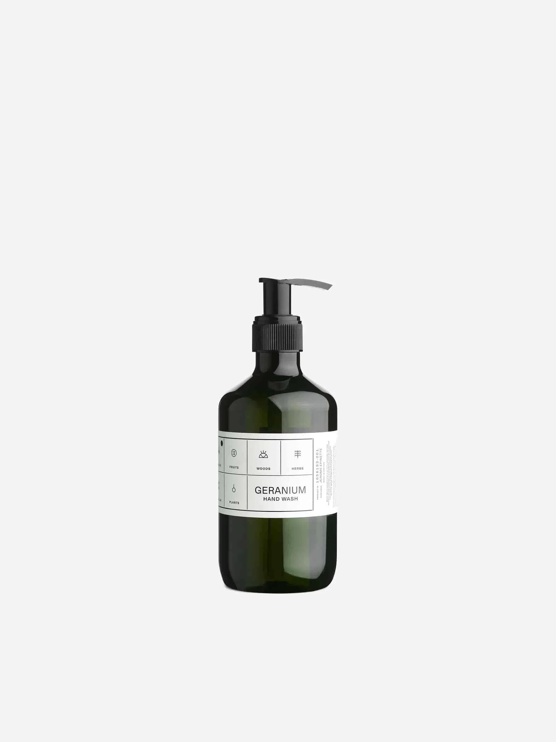 Flytande handtvätt tillverkad i Sverige med ingredienser inspirerade av den nordiska floran. Den är formulerad med hjortronextrakt; Nordiska sockerbetor för återfuktande egenskaper; och björksocker för att återfukta huden. Den löddrar till ett fint lödder som skonsamt rengör huden och gör att den känns mjuk och återfuktad. Geranium har en grön och rosliknande doft med inslag av citrus och mynta. 300 ml.