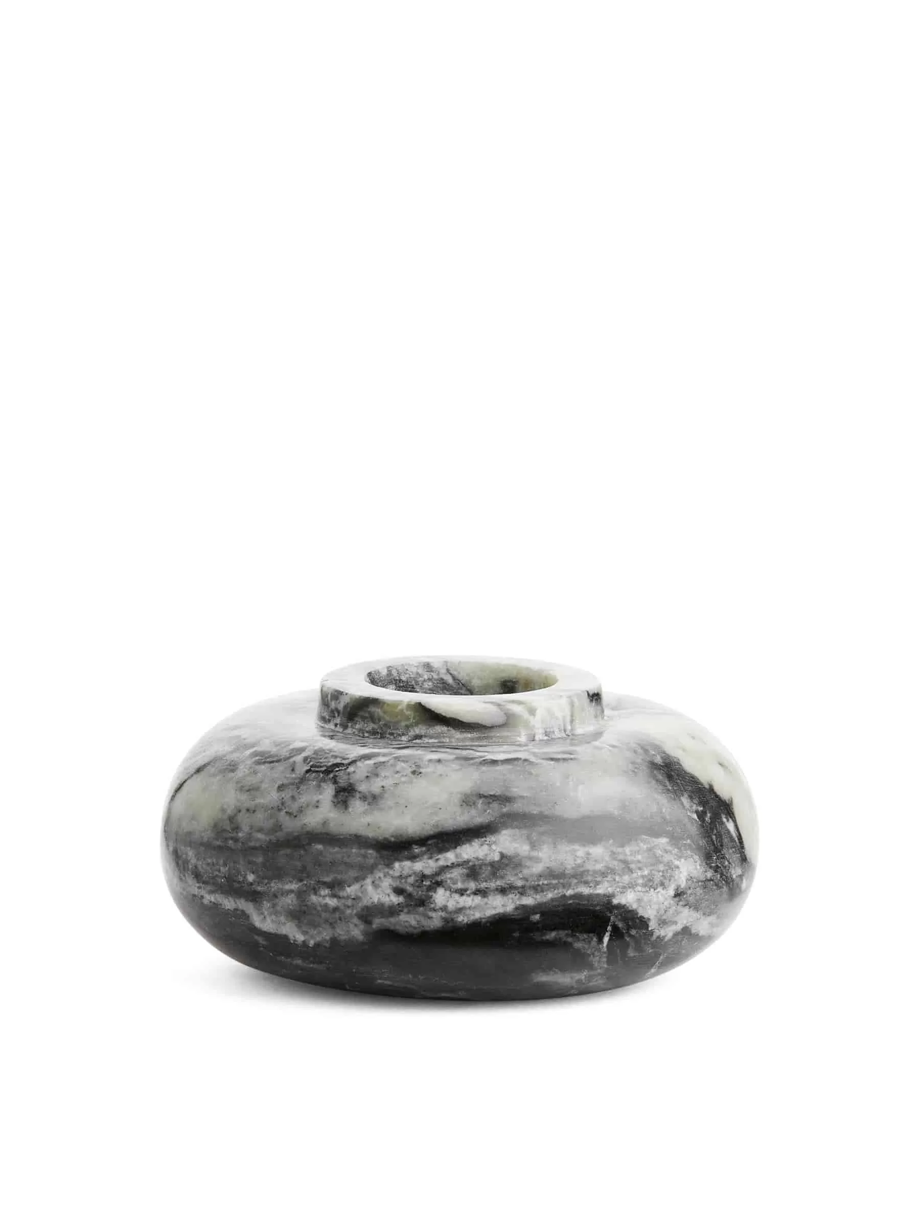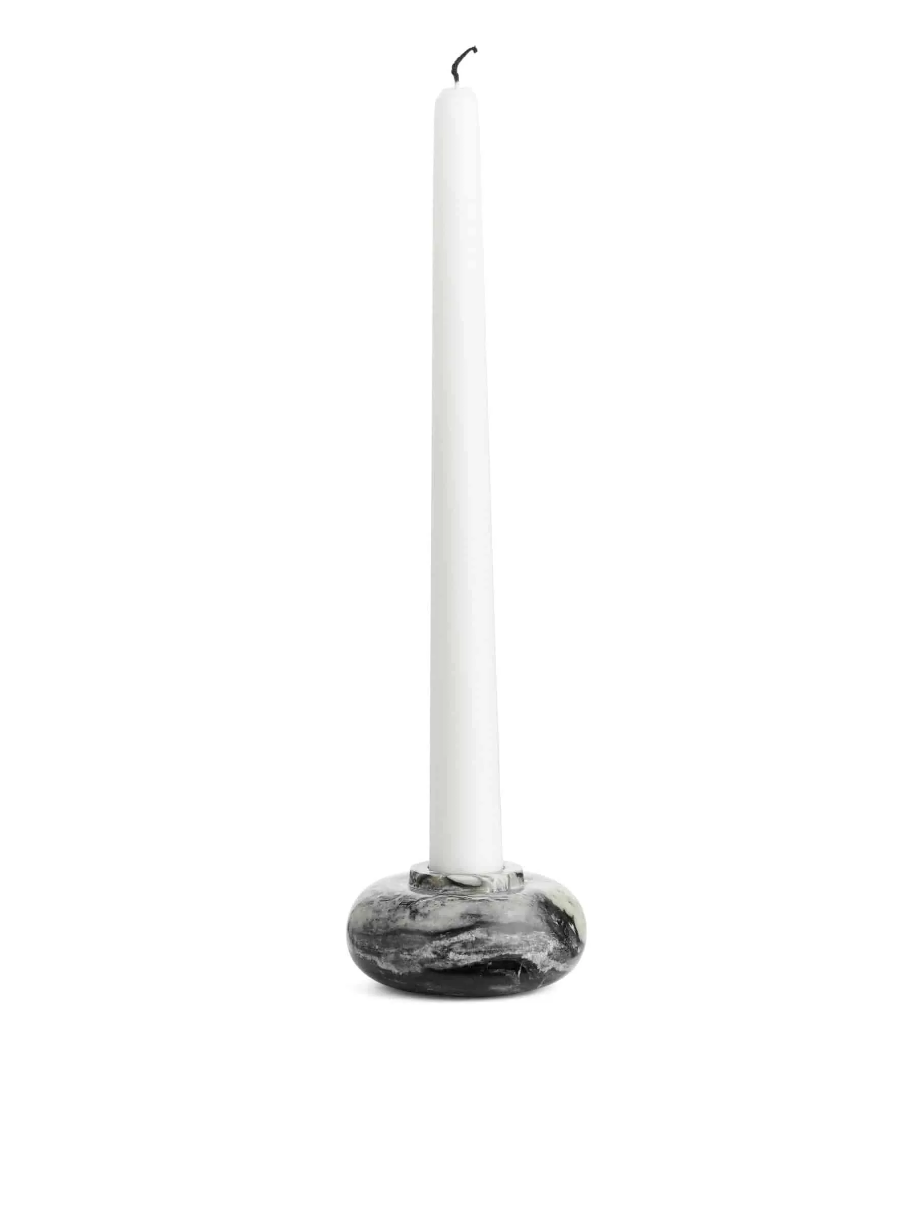 Tung ljusstake av marmor. Stapelbar och kompatibel med andra stilar i samma serie för oändliga arrangemangsmöjligheter. Bredd 6,9 cm, höjd 3,4 cm. Varje del kommer att ha ett unikt utseende på grund av marmorns naturliga variationer.
