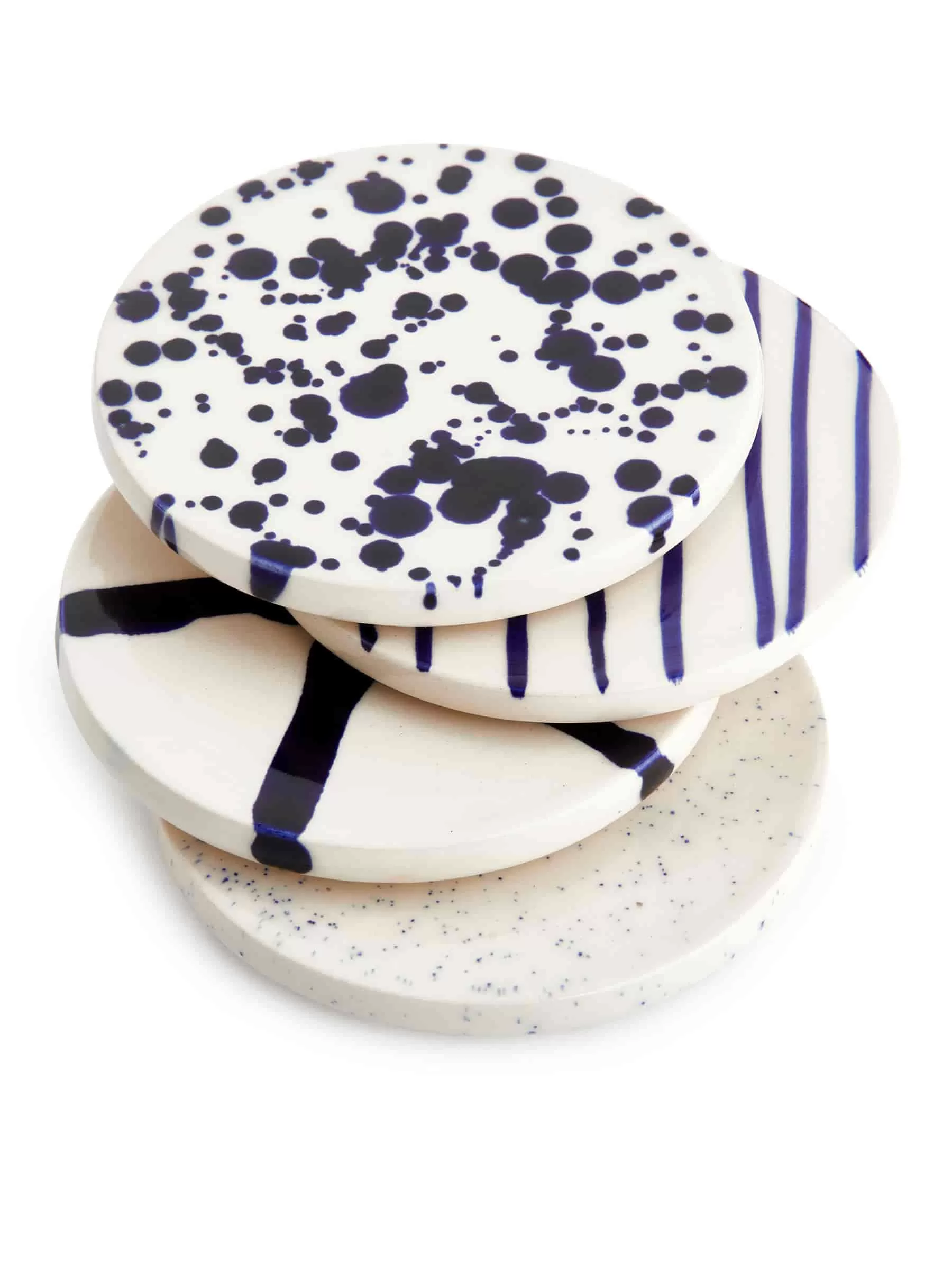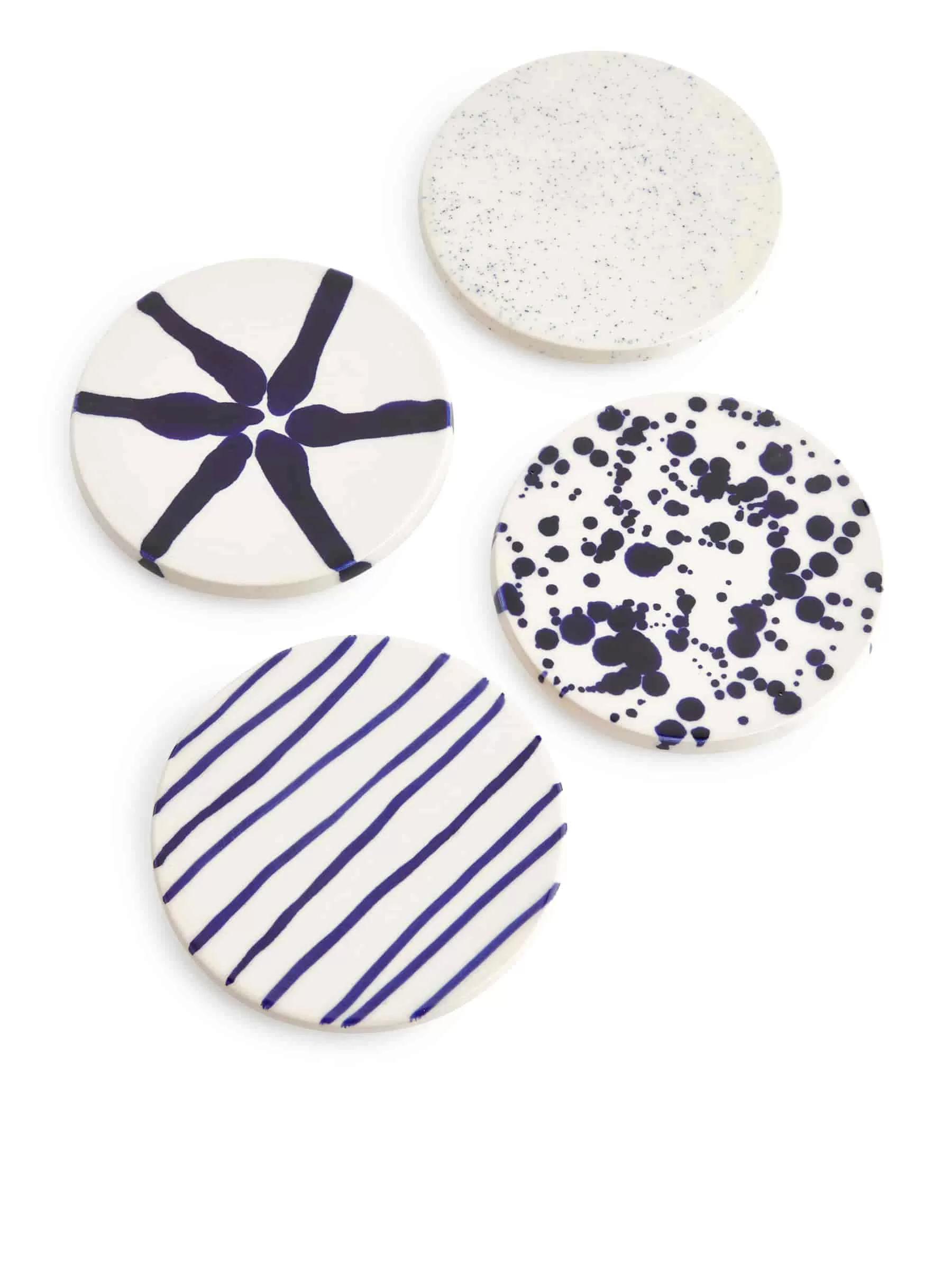 Underlägg gjorda av stengods med ett handmålat mönster. En uppsättning av fyra olika mönster. Diameter 10 cm. Eftersom mönstret är handmålat är varje del unik.