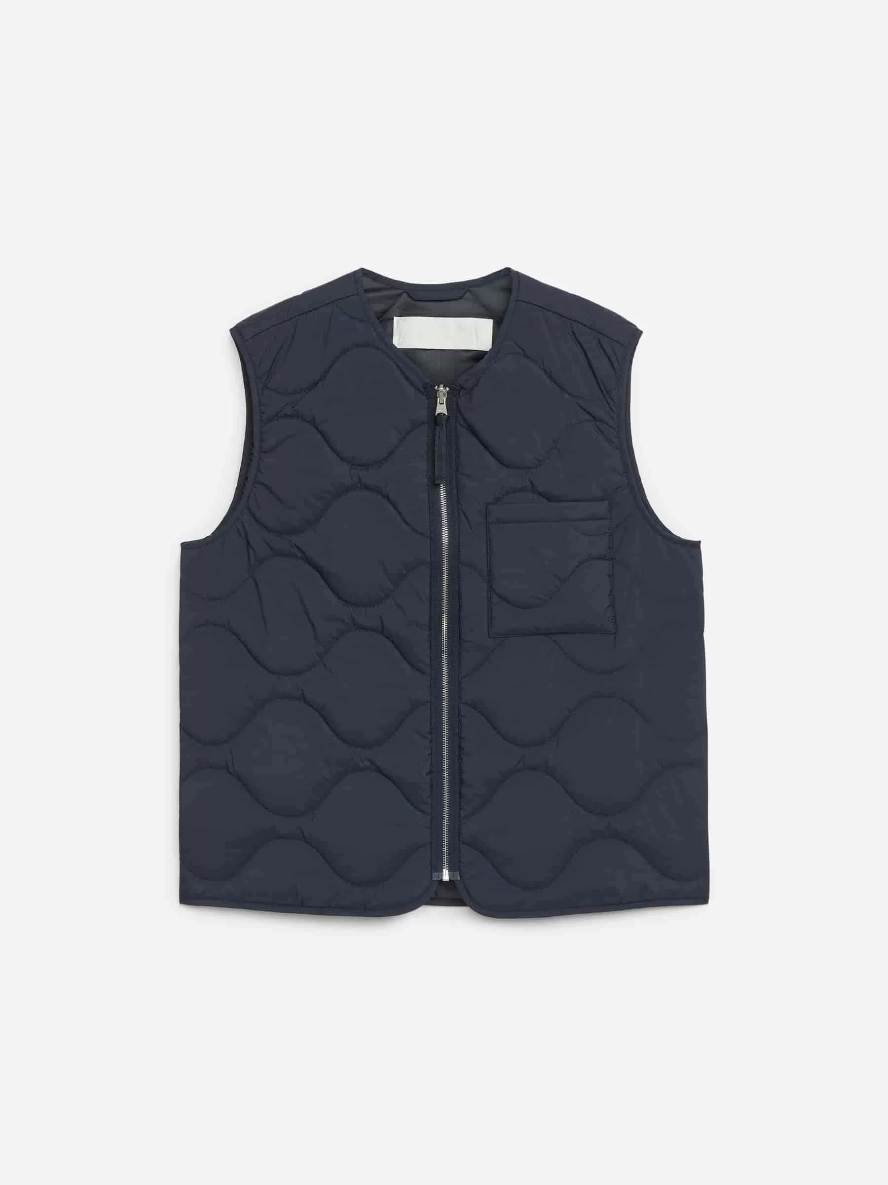 Kompakt vadderad väst med ARKETs signaturlökquiltning. Skaltyget är en ripstop-konstruktion och stoppningen erbjuder lätt isolering. Västen är detaljerad med en dragkedja fram, en patchficka på vänster sida och en innerficka. Vindtätt material och vattenavvisande finish. Det här plagget är en del av 2-i-1-serien, ett modulärt ytterplaggssystem som inkluderar skal och isolerande foder speciellt utformade för att knäppas ihop och bilda en helt vadderad kappa.