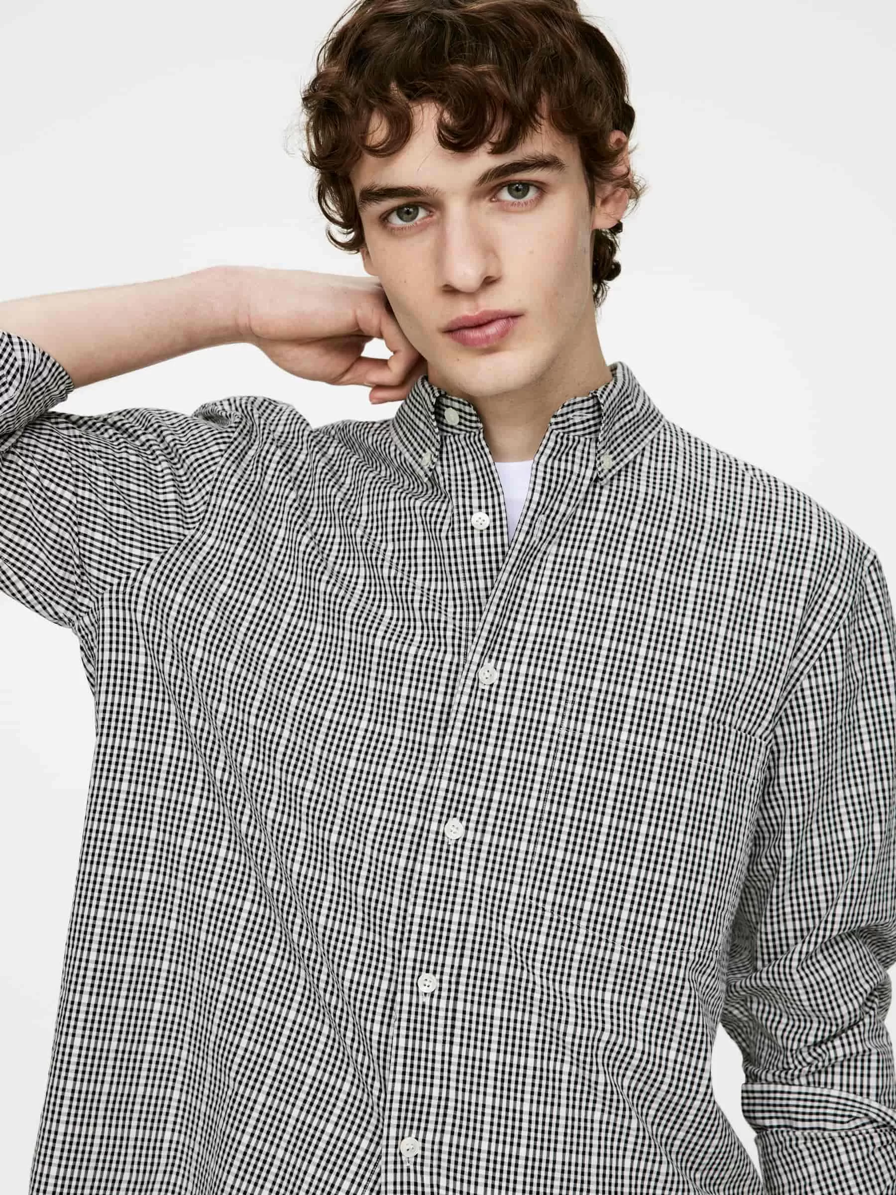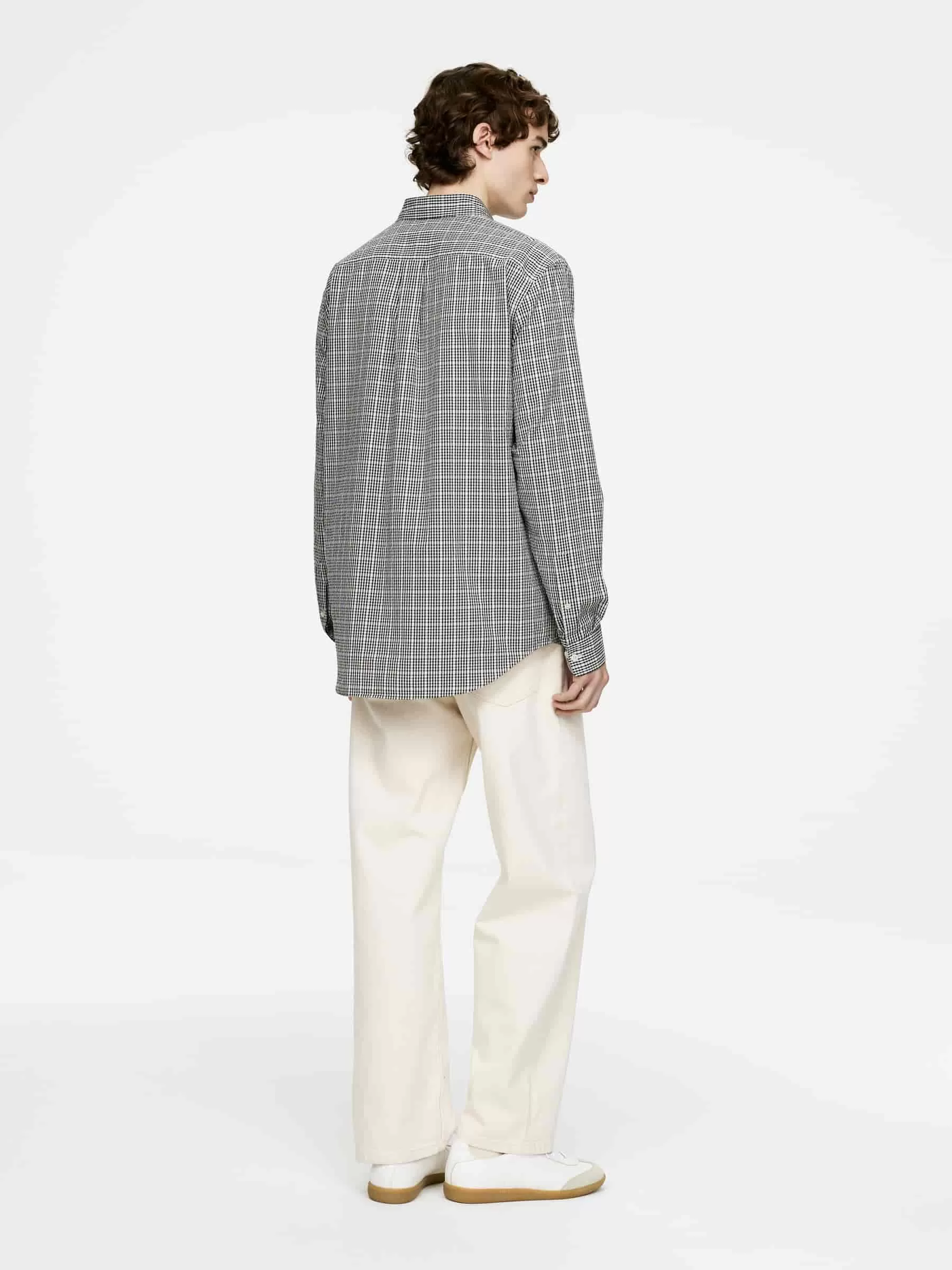 Långärmad skjorta tillverkad av ett tyg av bomull. Klippt för en avslappnad passform och stylad med en button-down krage, knäppning fram och en enkel bröstficka. Böjd fåll.