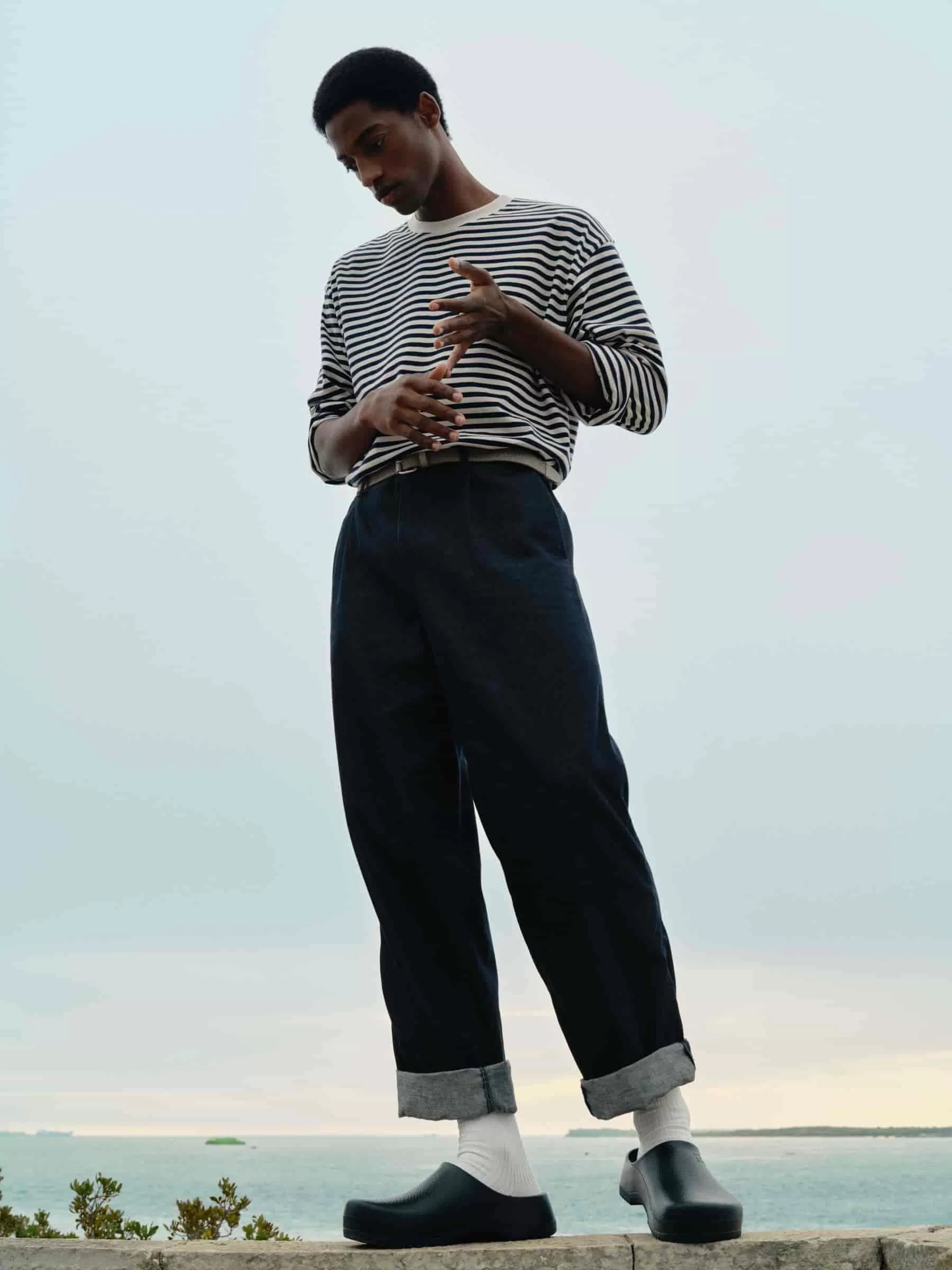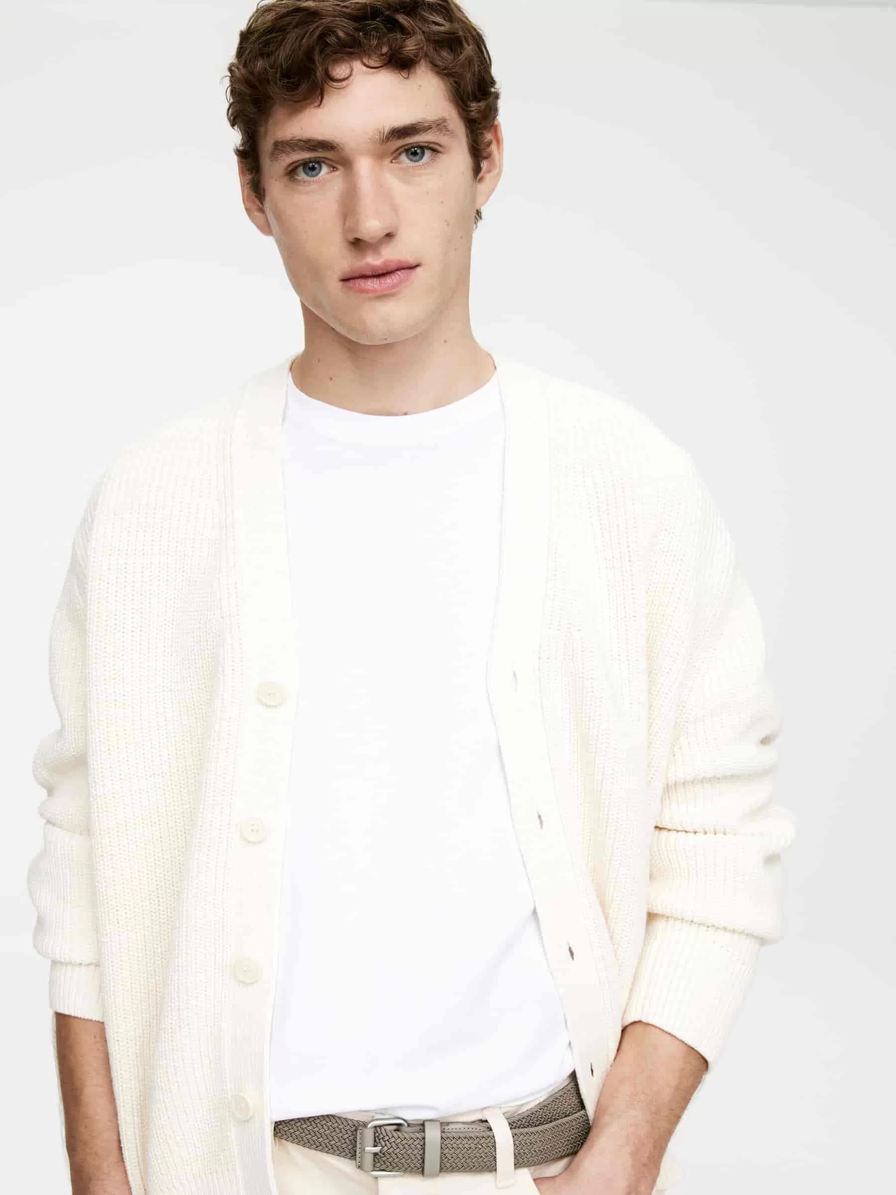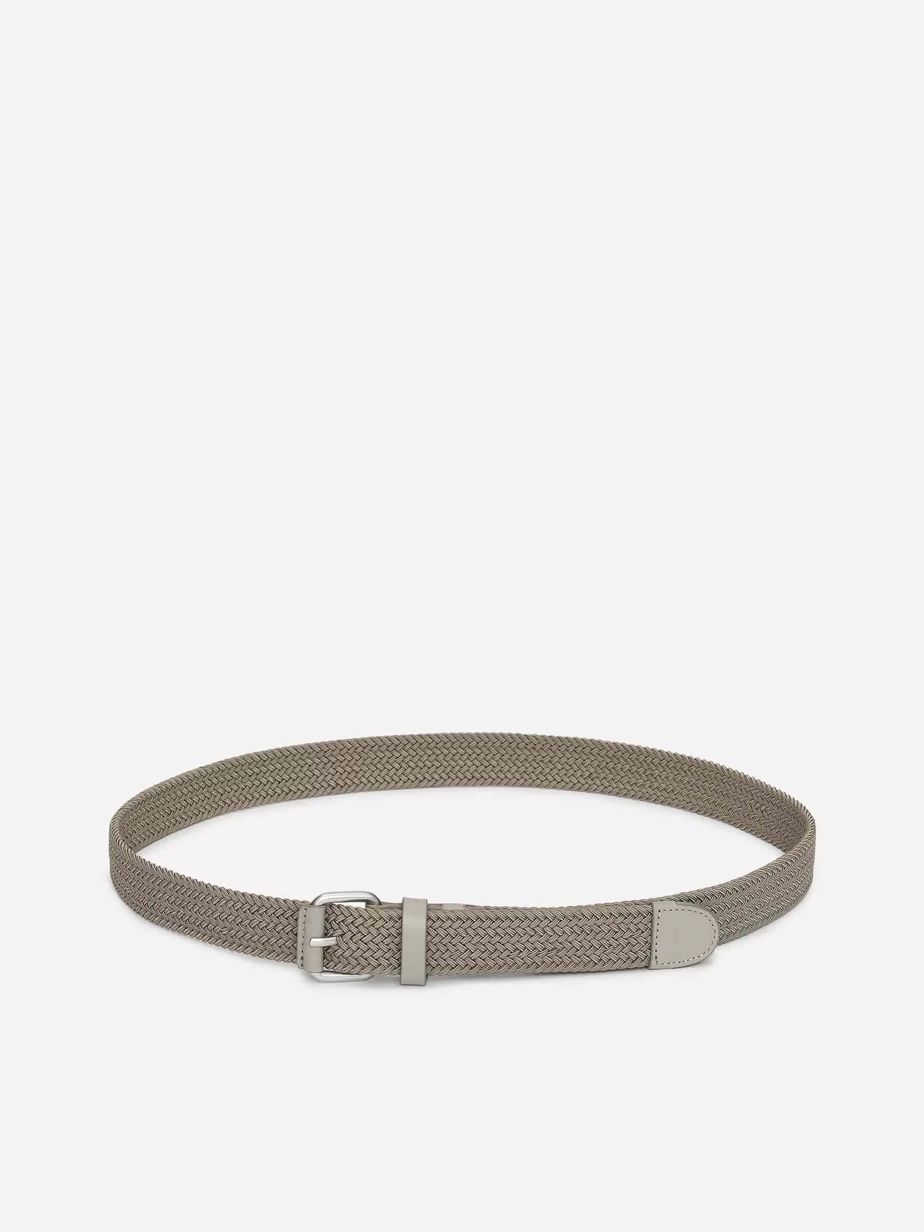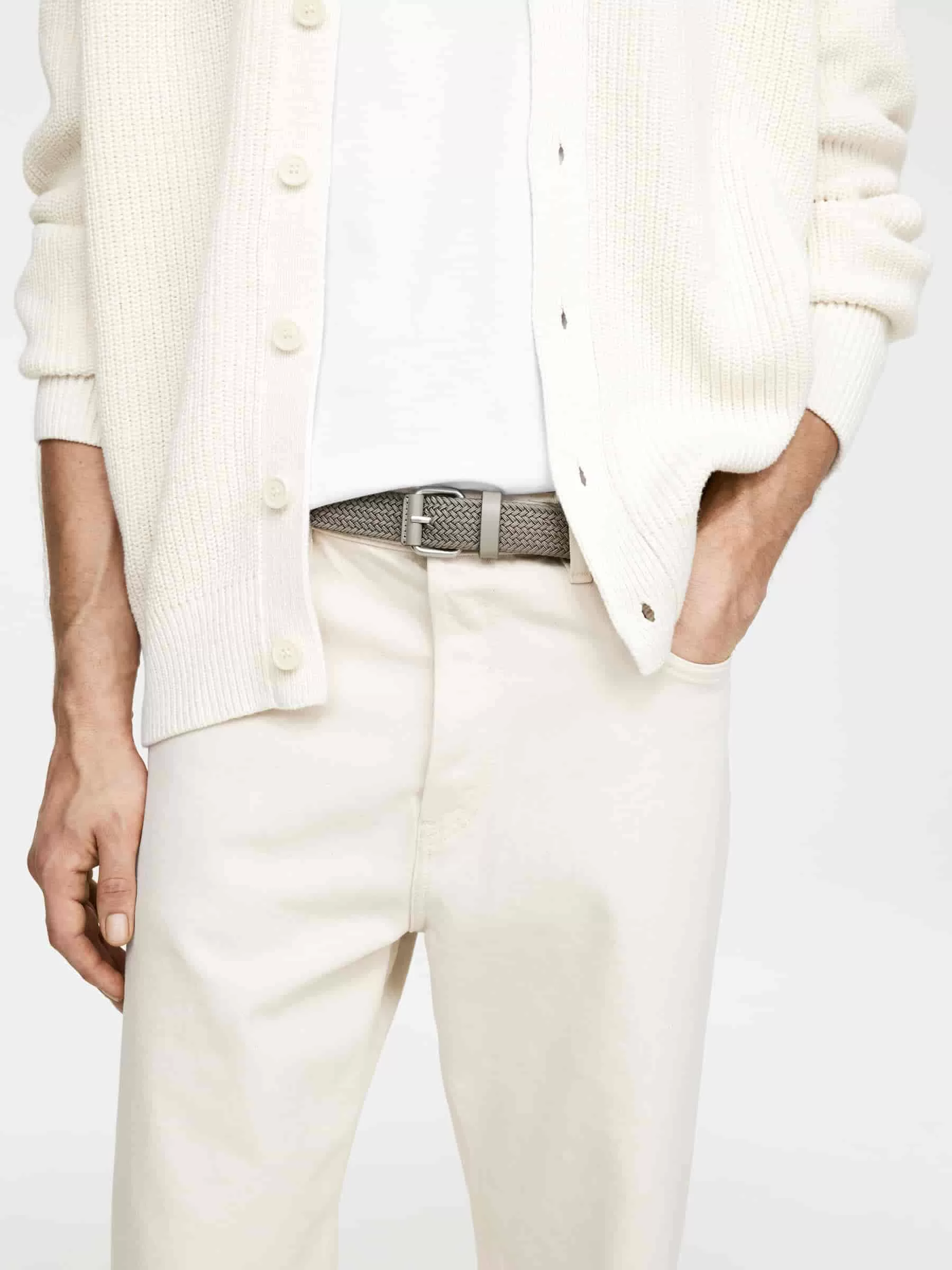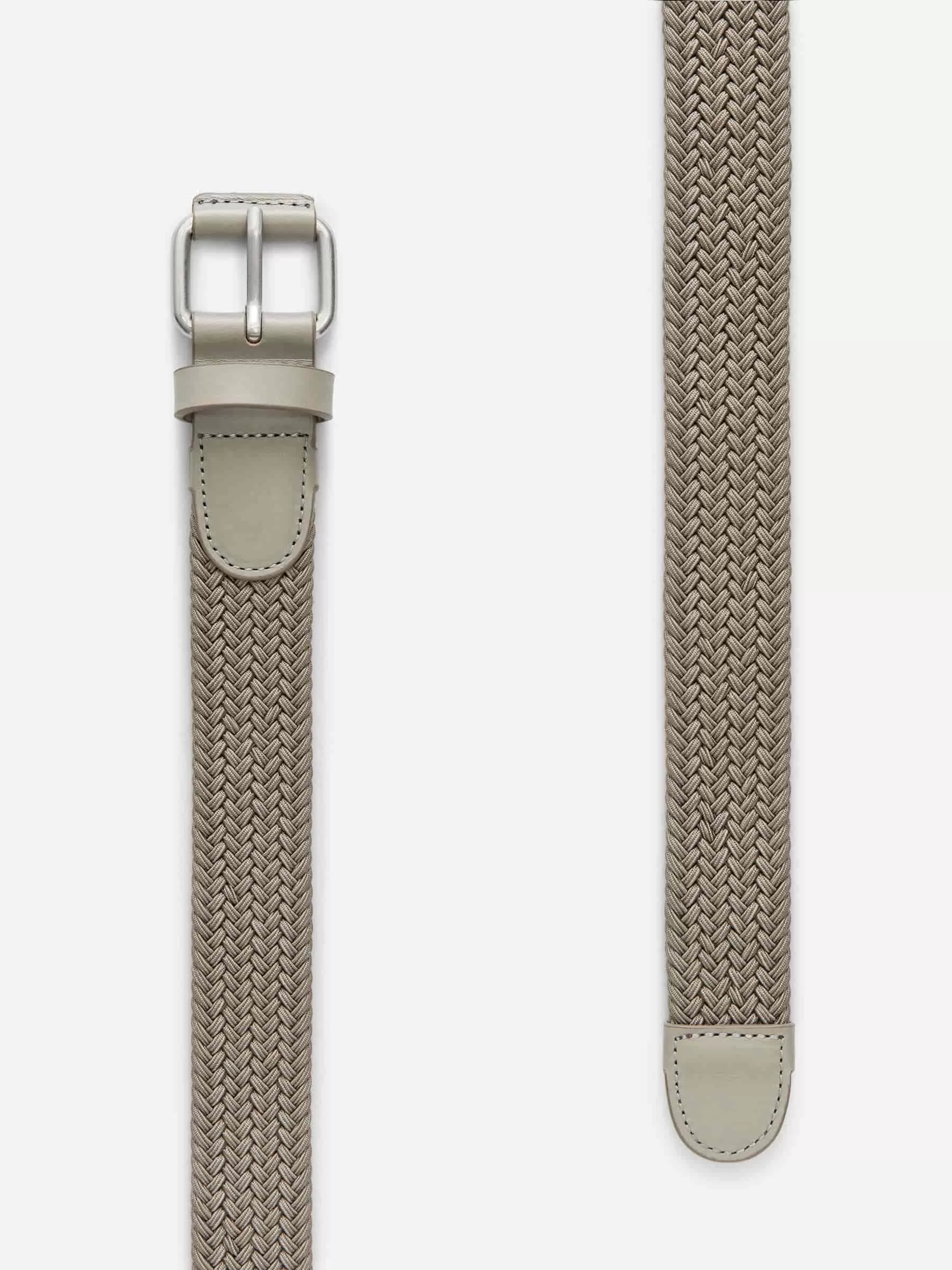 Flätat bälte tillverkat av elastiska snören. Klädd med läderdetaljer. Bredd 3 cm.