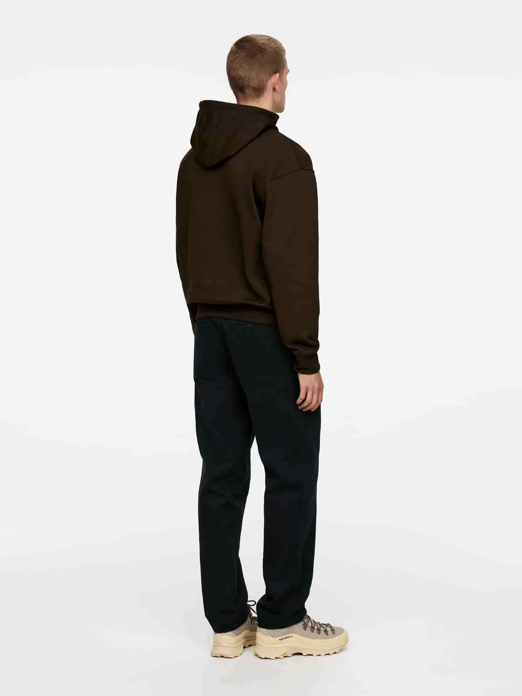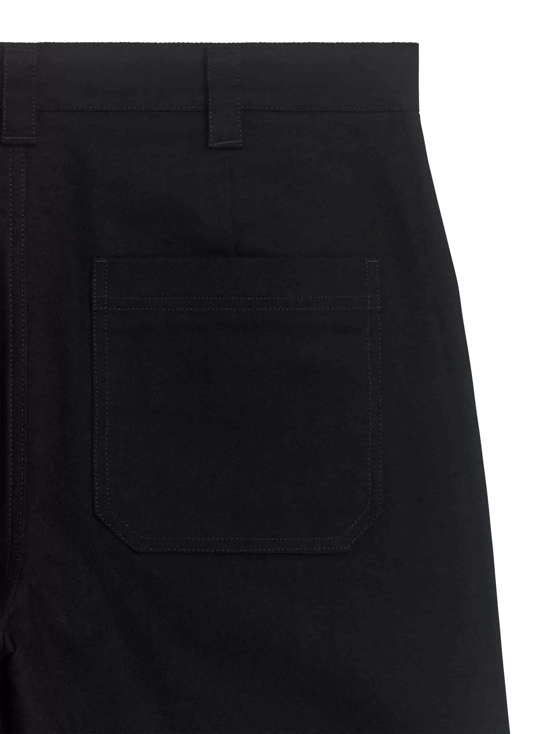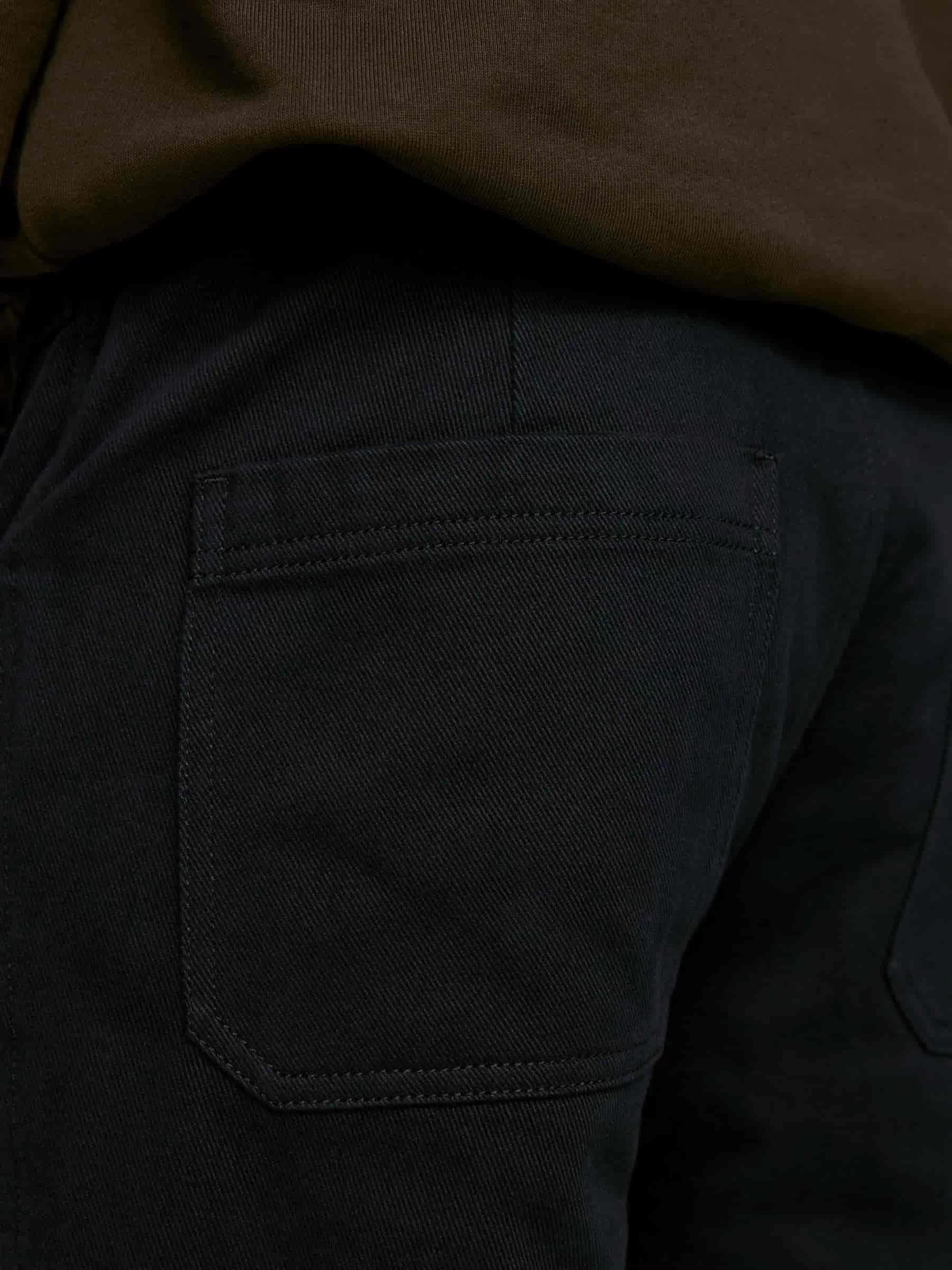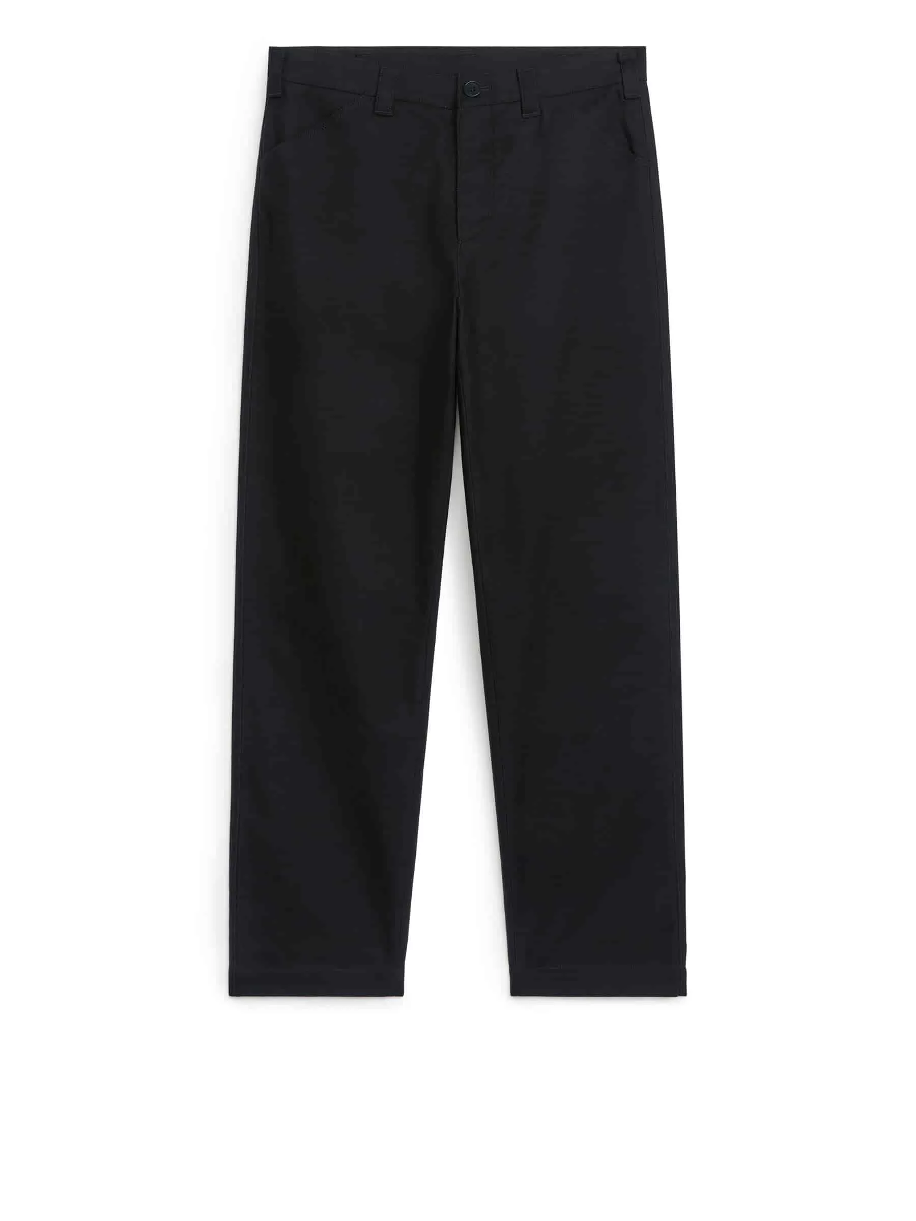 Bomullsbyxa i molskinnstwill med sneda framfickor och lappade fickor bak. Knäppning och gylf med dragkedja.