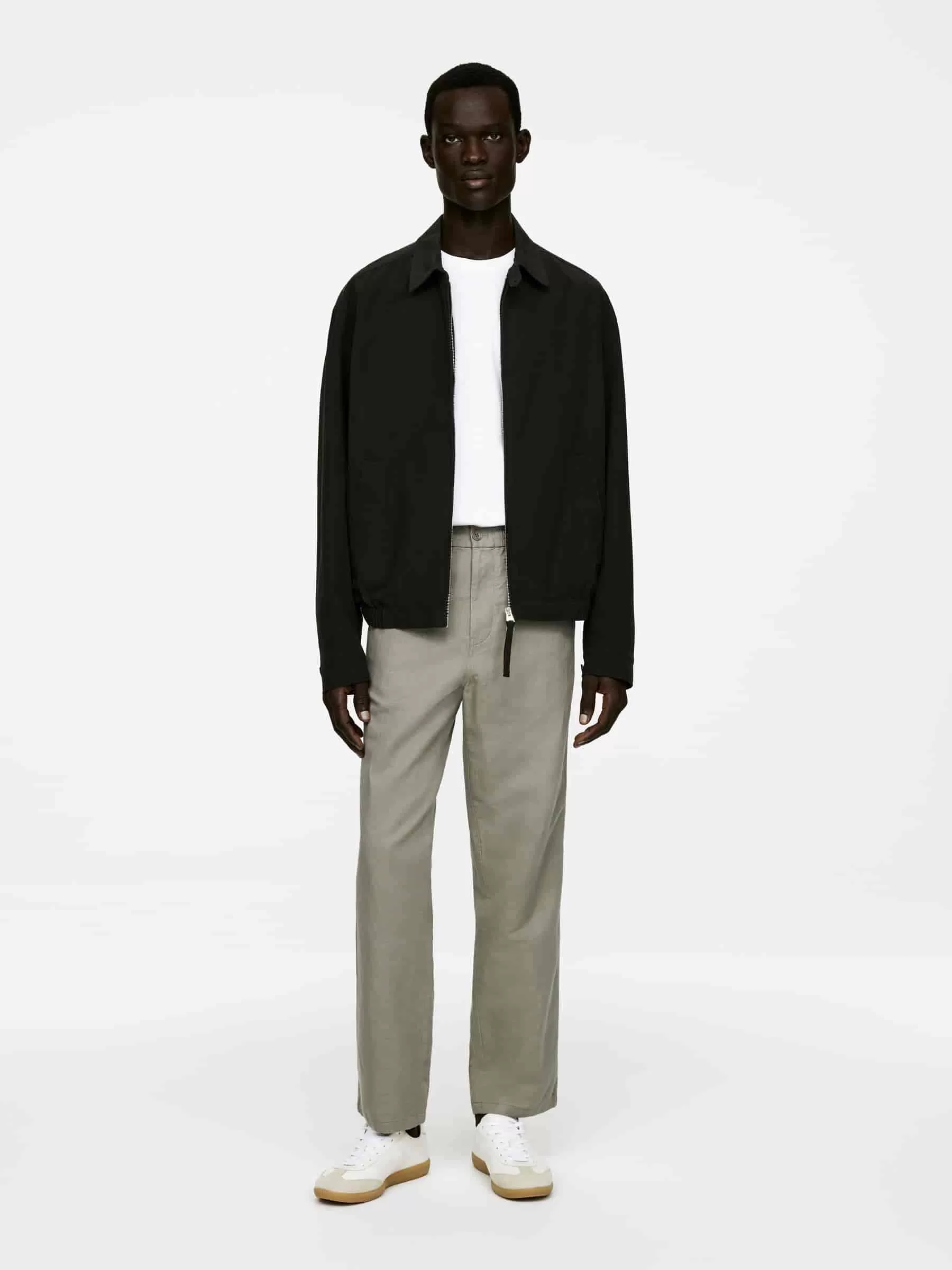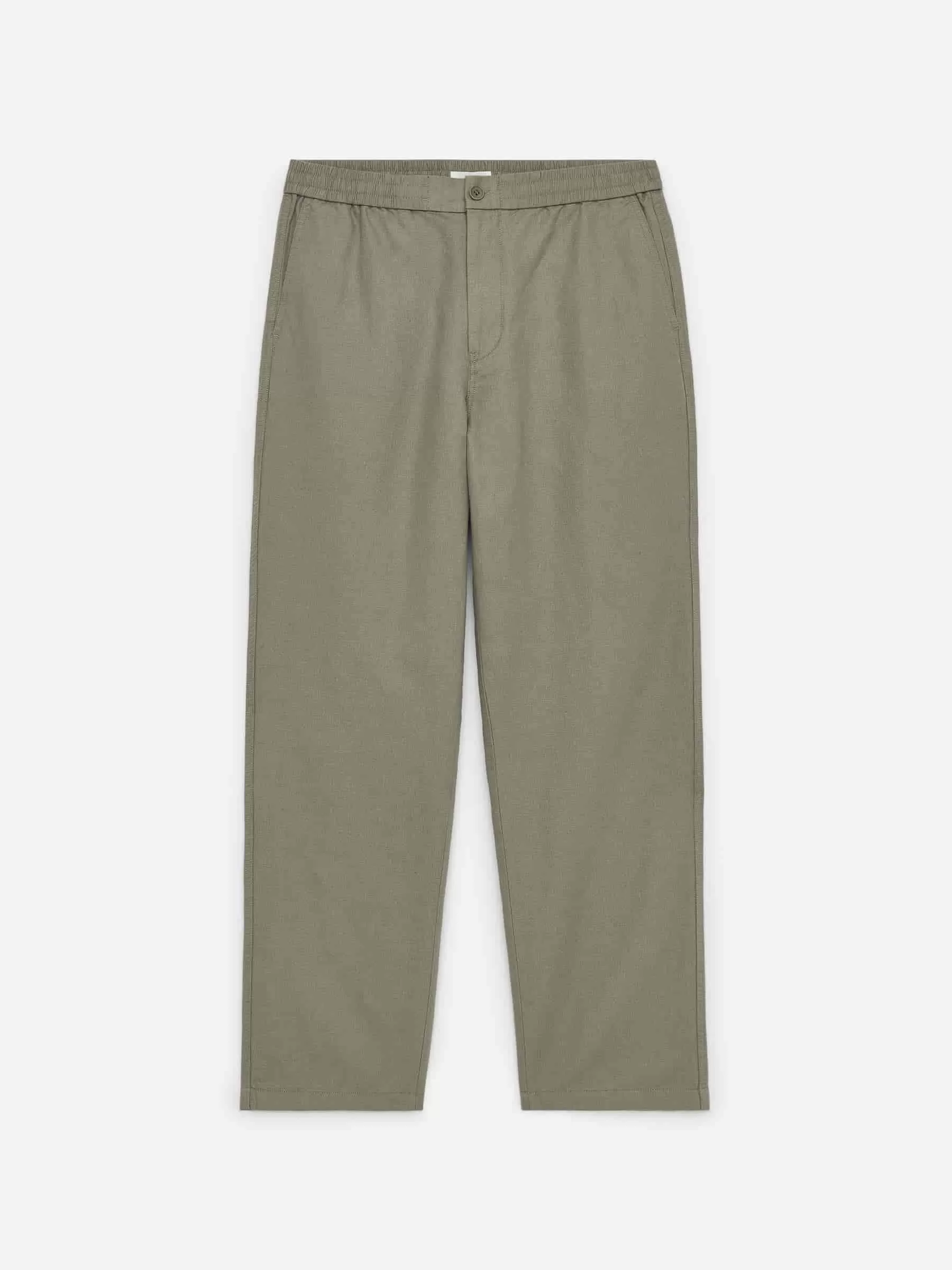Byxor sydda av en linneblandning. Detaljerad med resår i midjan med dragsko på insidan, knappstängning och gylf med dragkedja. Snedställda fickor fram och passpoalfickor bak. Normal passform.