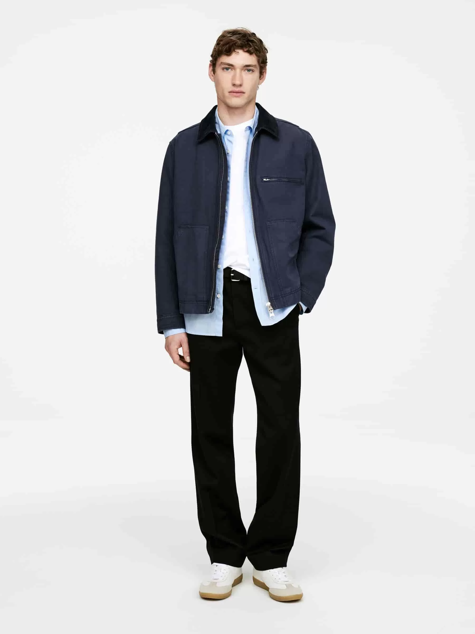 Arbetskläder-inspirerad jacka sydd av bomullscanvas med en krage av manchester. Stylad med dragkedja och ärmslut med knäppning. Detaljerad med en jetficka med dragkedja på bröstet, sneda fickor fram och en innerficka. Normal passform.