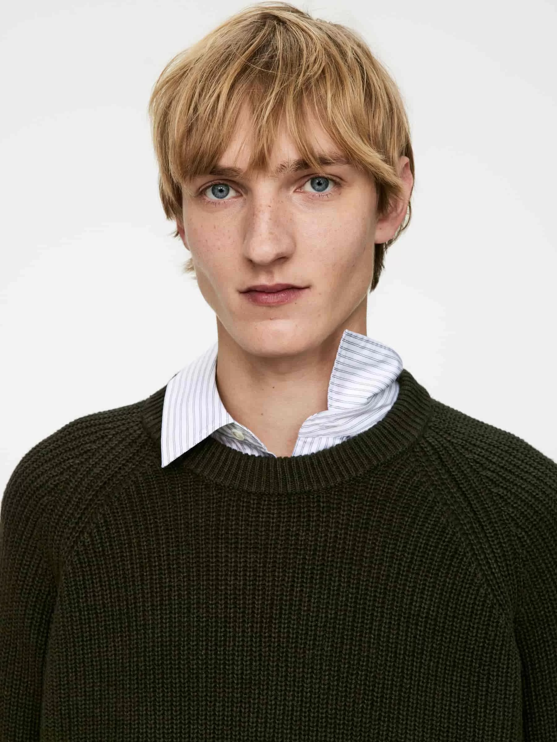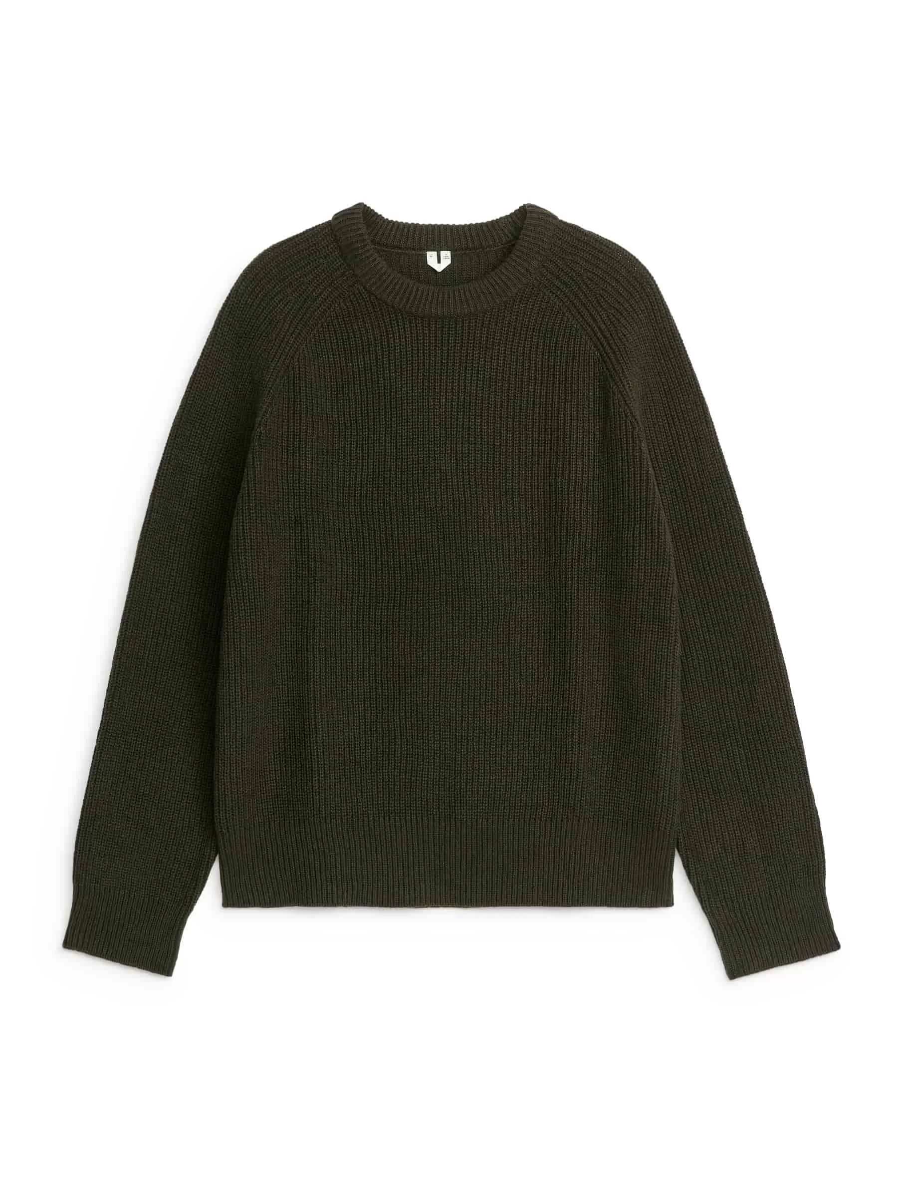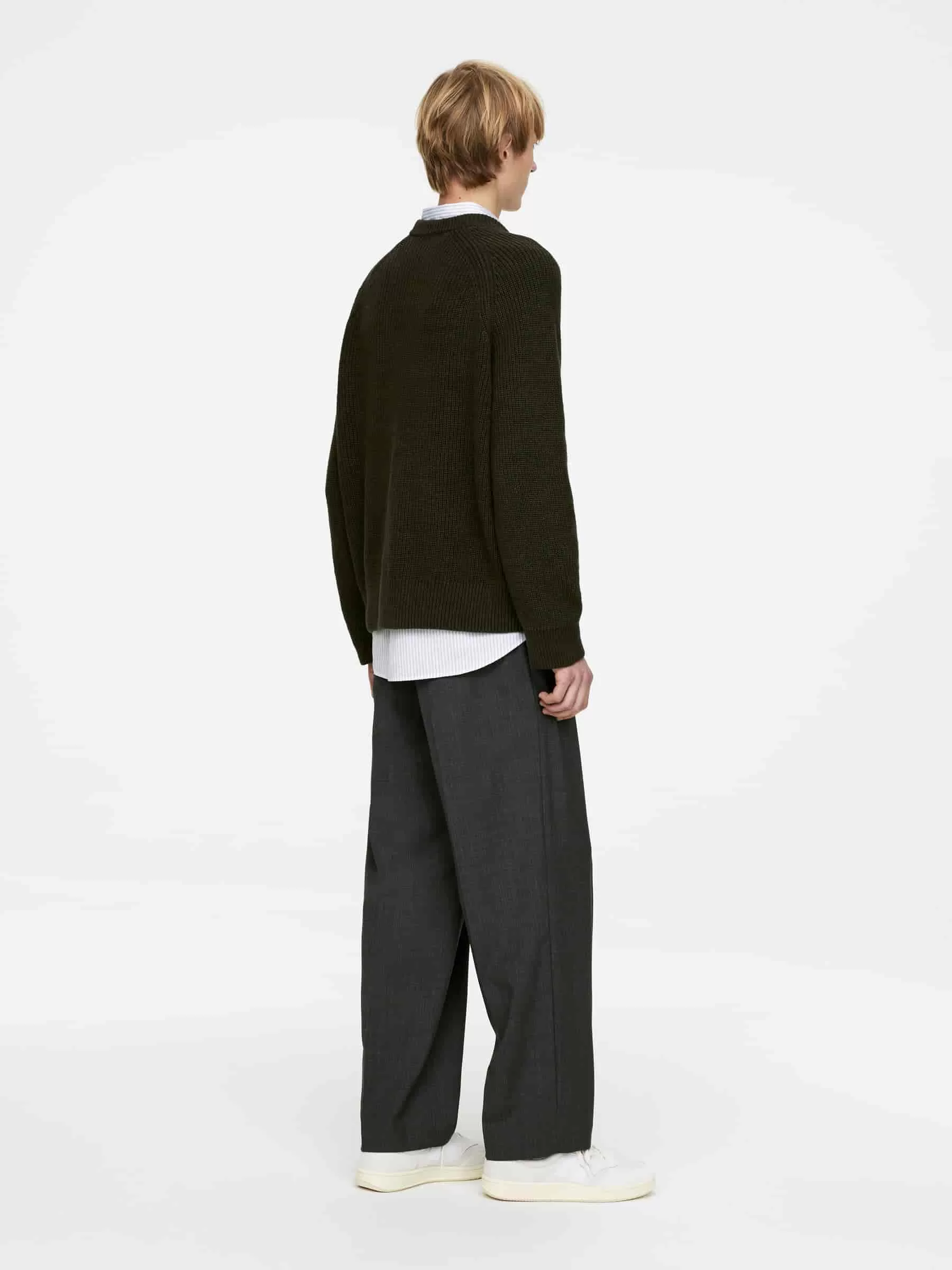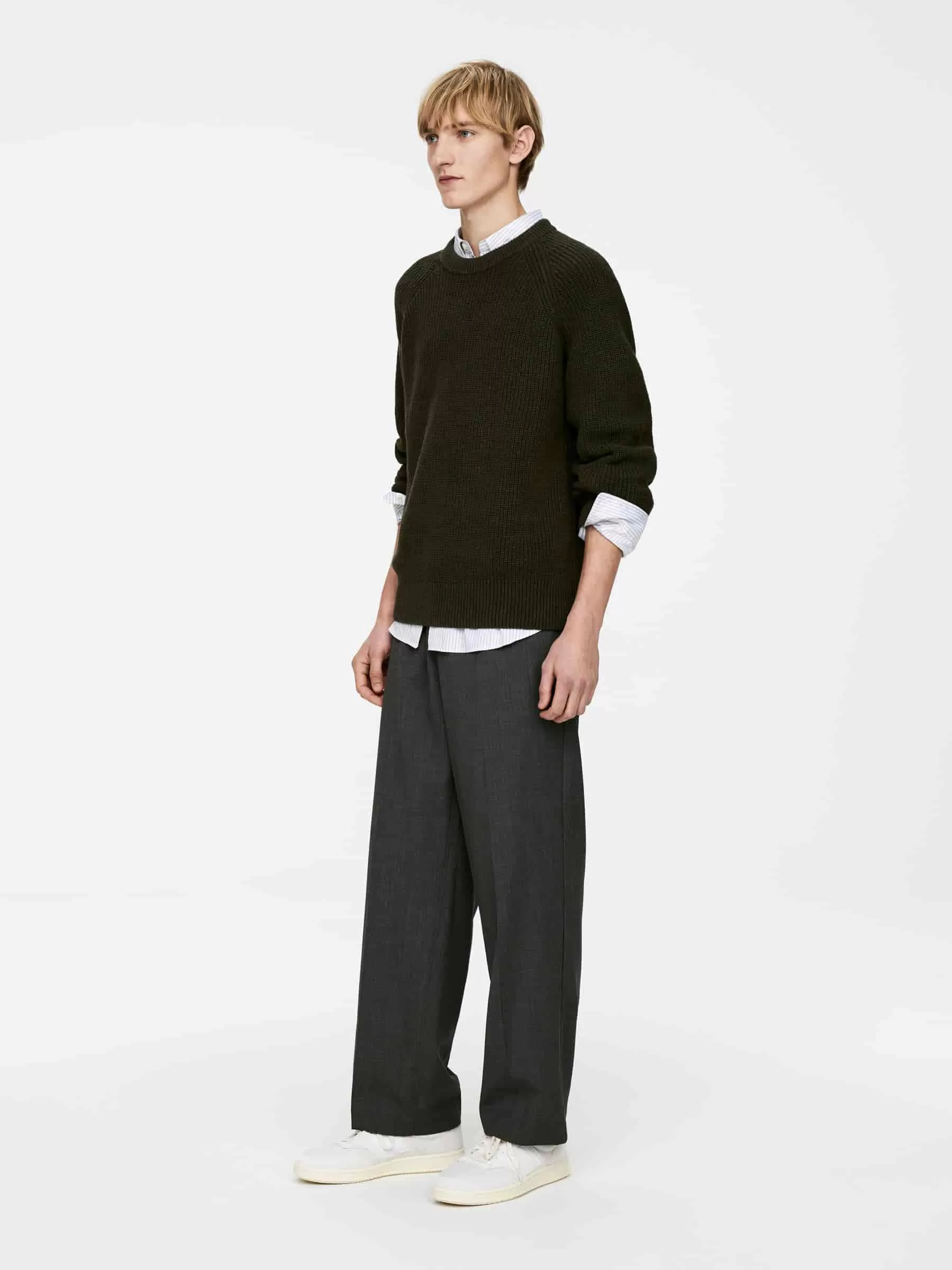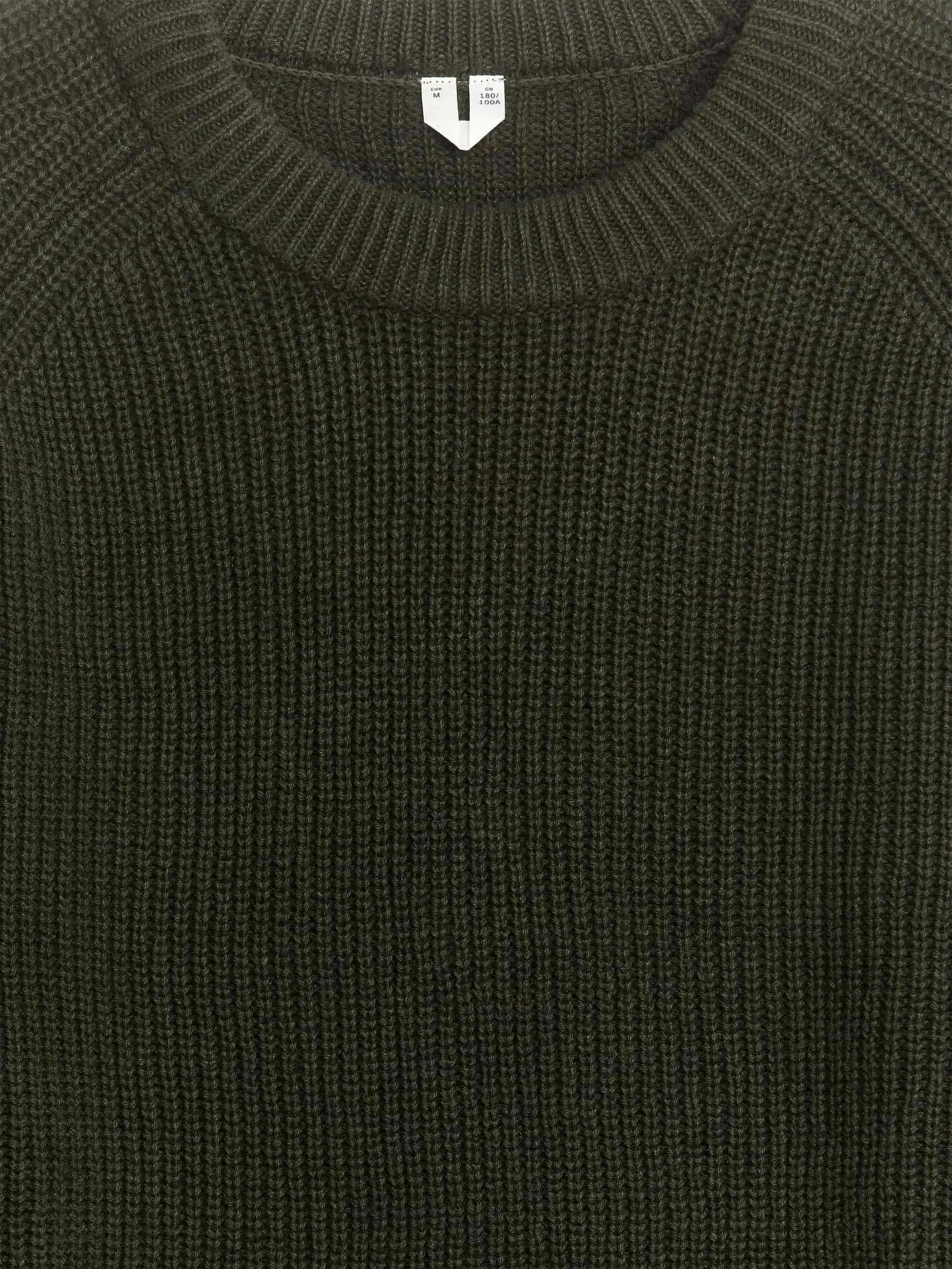 Tröja gjord av en blandning av linne och bomull, stickad i en halvkoftasöm. En crew-neck-stil med en tjock halsringning och raglanskurna ärmar.