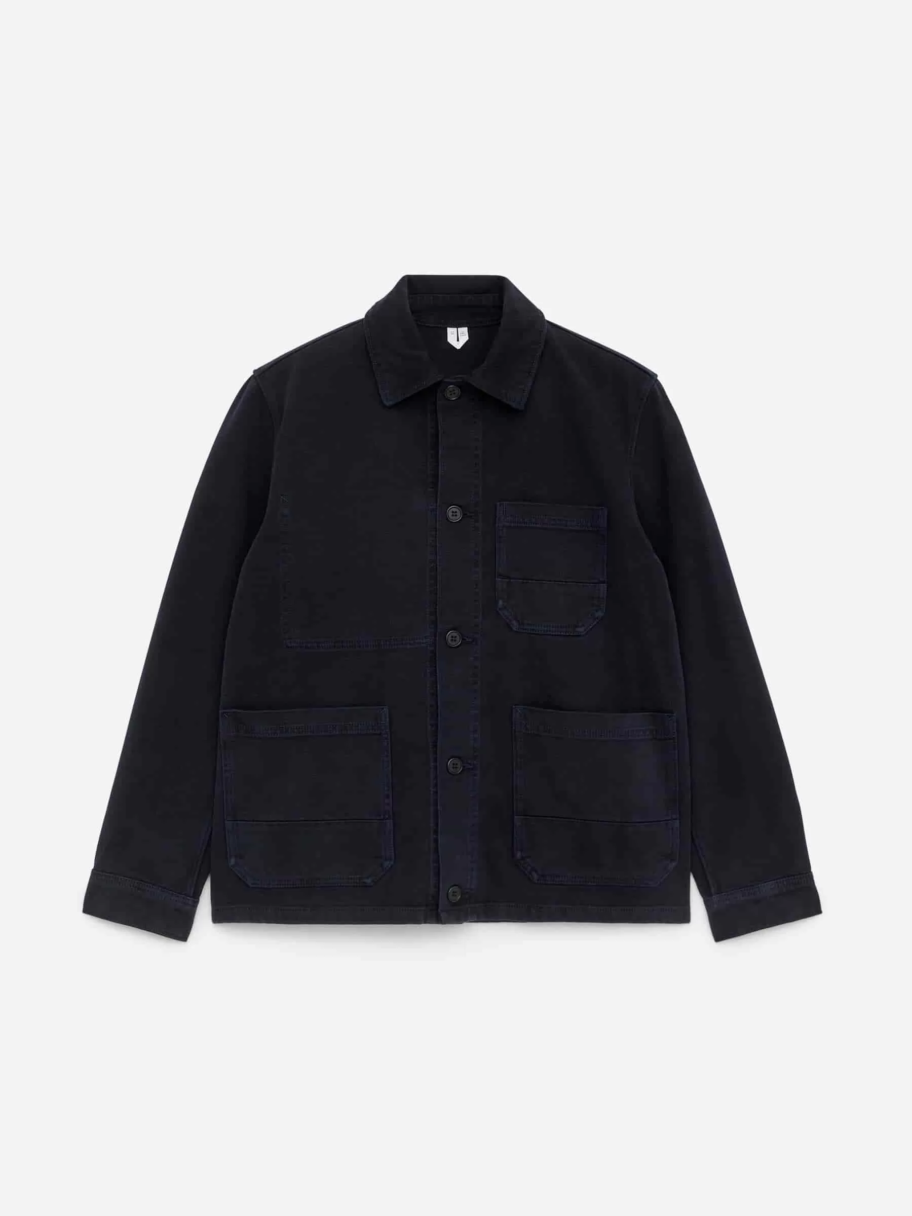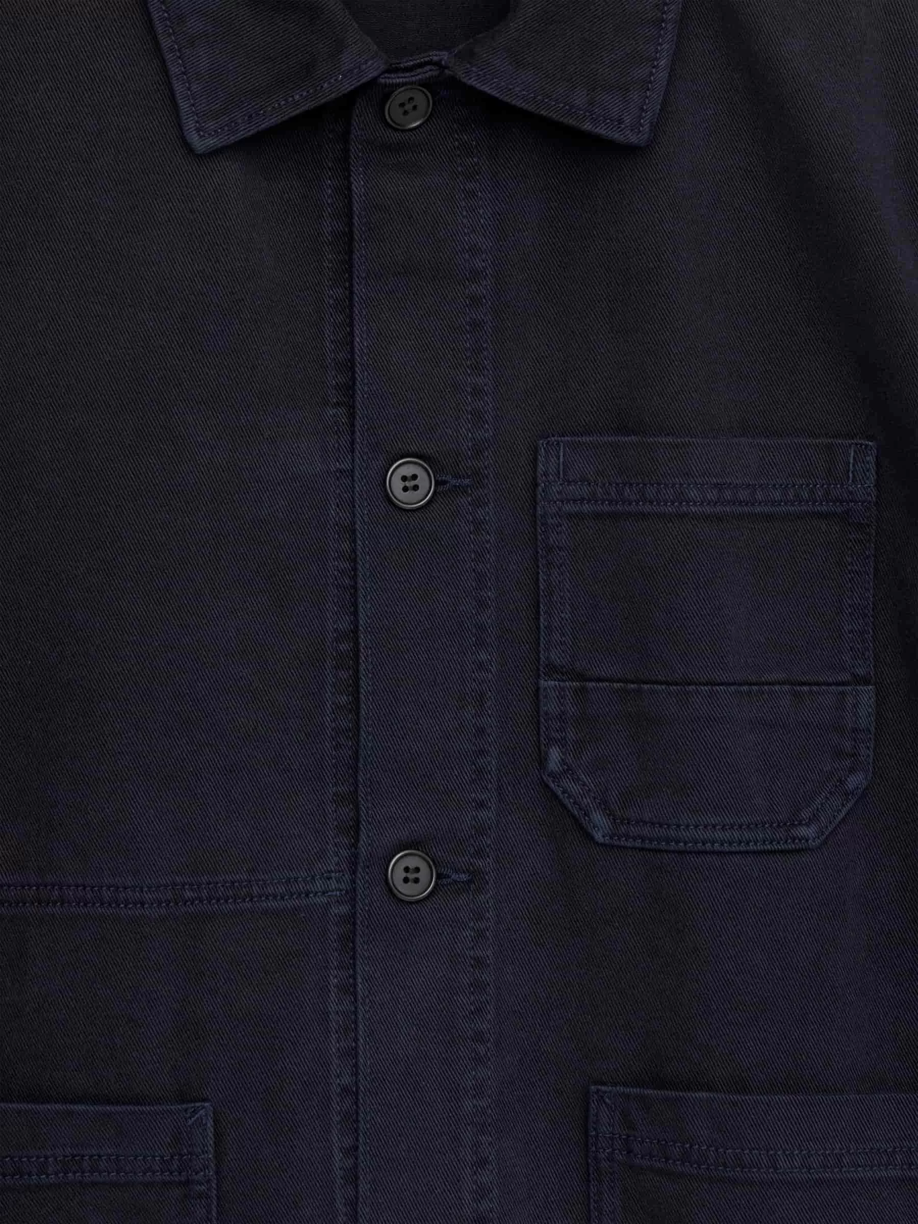 I borstad vänsterhands bomullstwill är den här övertröjan inspirerad av fransk arbetsklädesstil. Med en lätt boxig passform och en knapp framtill har den här versionen ett överfärgat utseende.