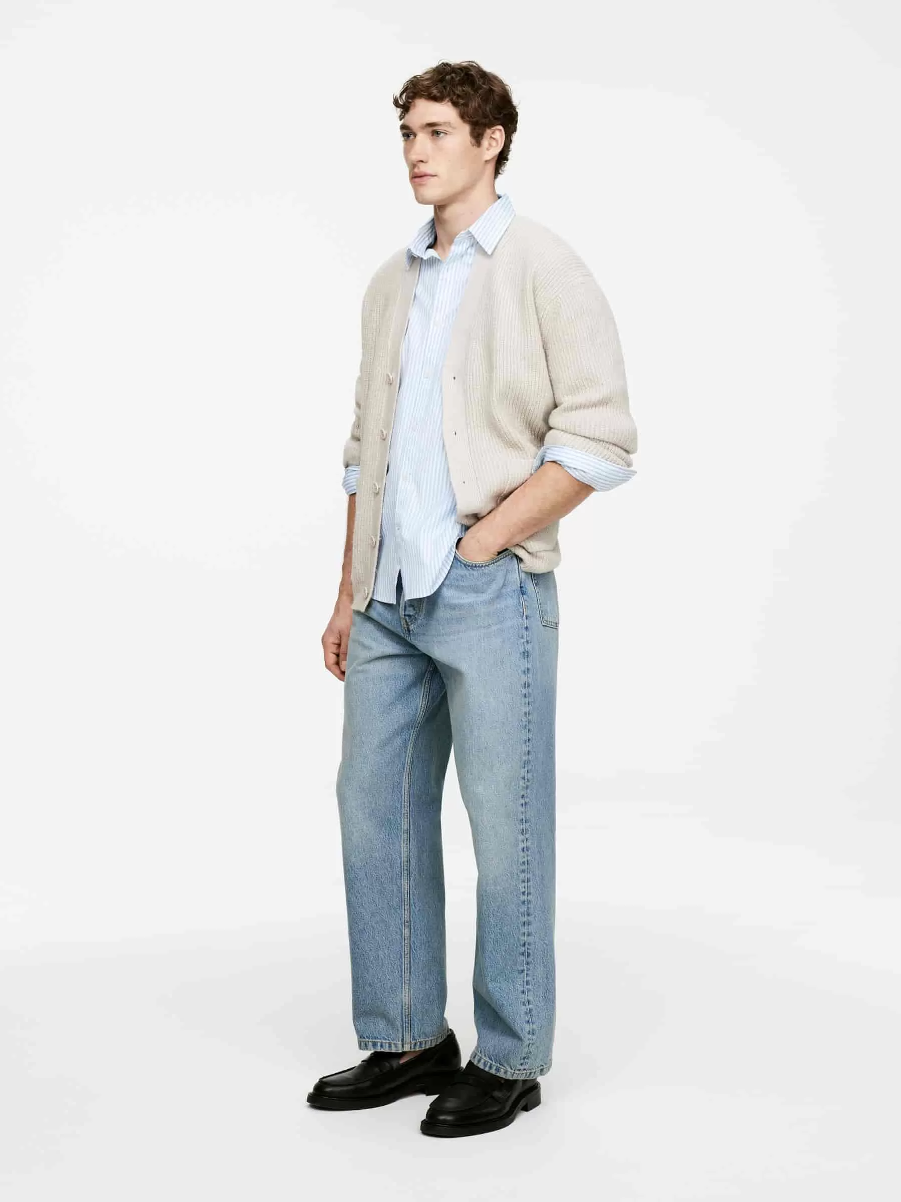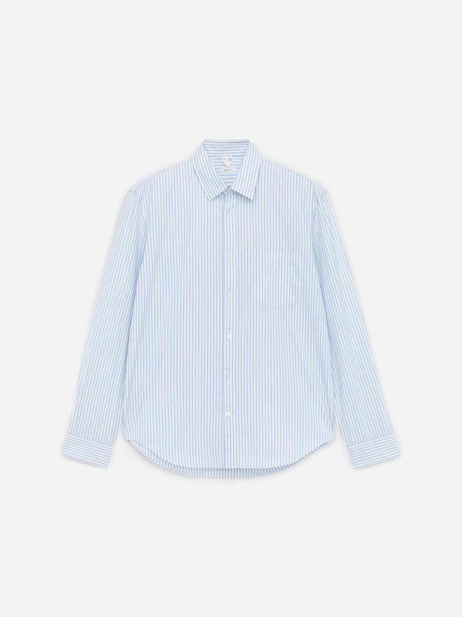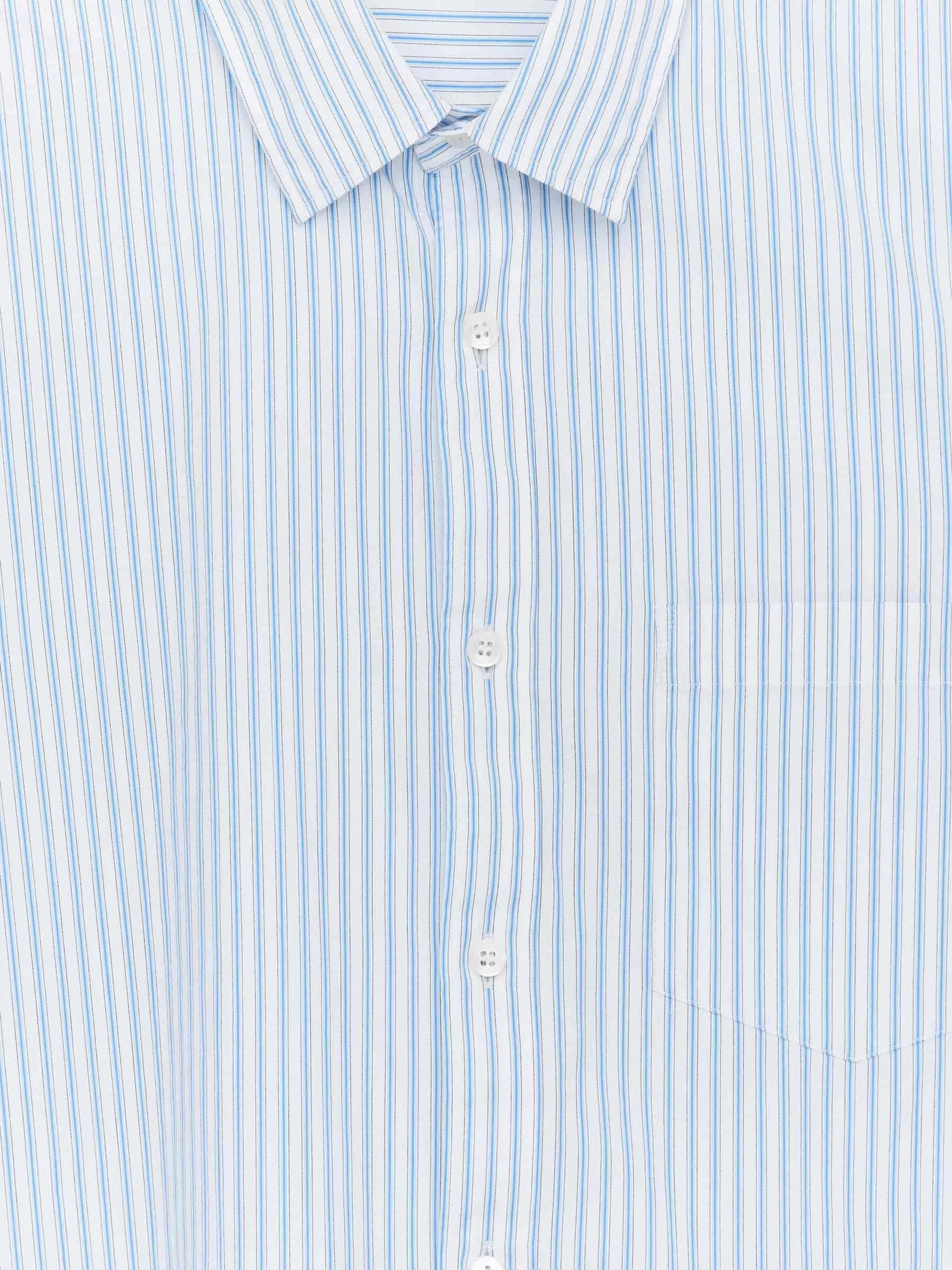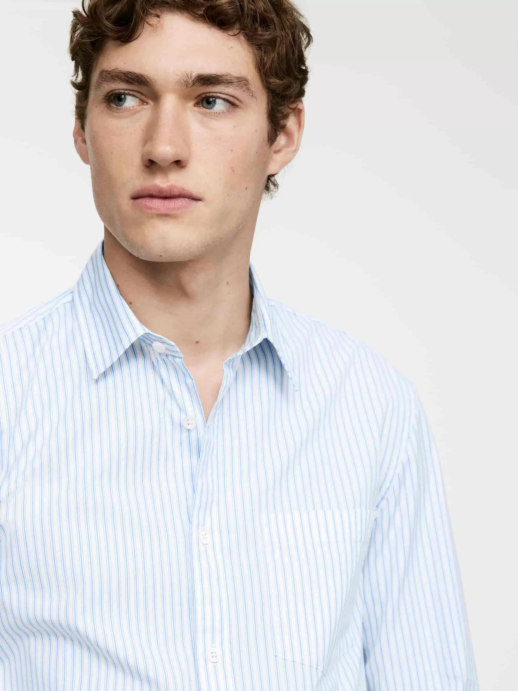 Långärmad skjorta tillverkad av ett bomullspoplintyg med ett mönster av garnfärgade ränder. Stylad med en spetsig krage och en enkel bröstficka. Böjd fåll. Normal passform.