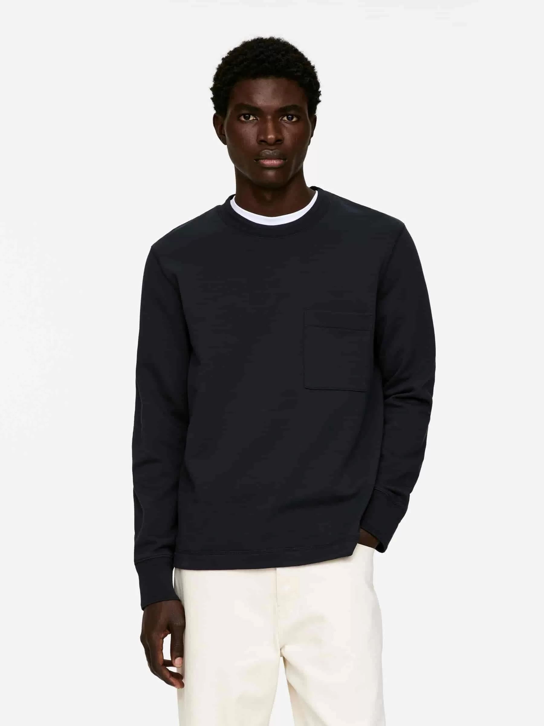 Tröja tillverkad av bomullsfrotté. En crew-neck-stil detaljerad med en bröstficka och ribbstickning vid hals och ärmslut. Rak skuren fåll. Normal passform.