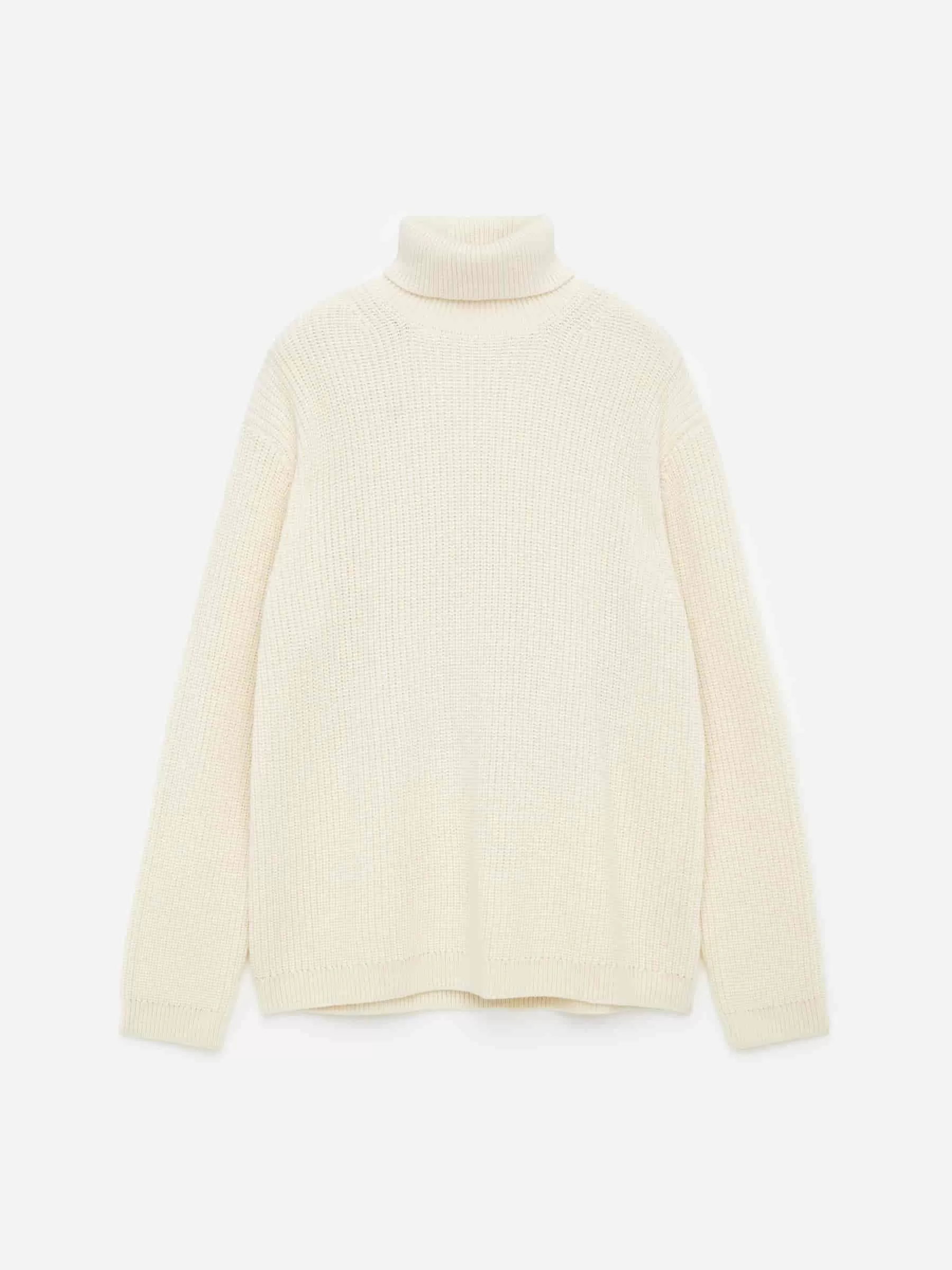 Rullhalsad tröja tillverkad av en ullblandning. Detta är en premium kraftig stickning som är skuren för en avslappnad passform med tappade axlar. Denna bygel innehåller 69 % RWS-ull, certifierad av kontrollförbundet 815571. Produkter certifierade enligt Responsible Wool Standard (RWS) innehåller ullfibrer från gårdar som är oberoende certifierade enligt kraven på djurskydd och markförvaltning.