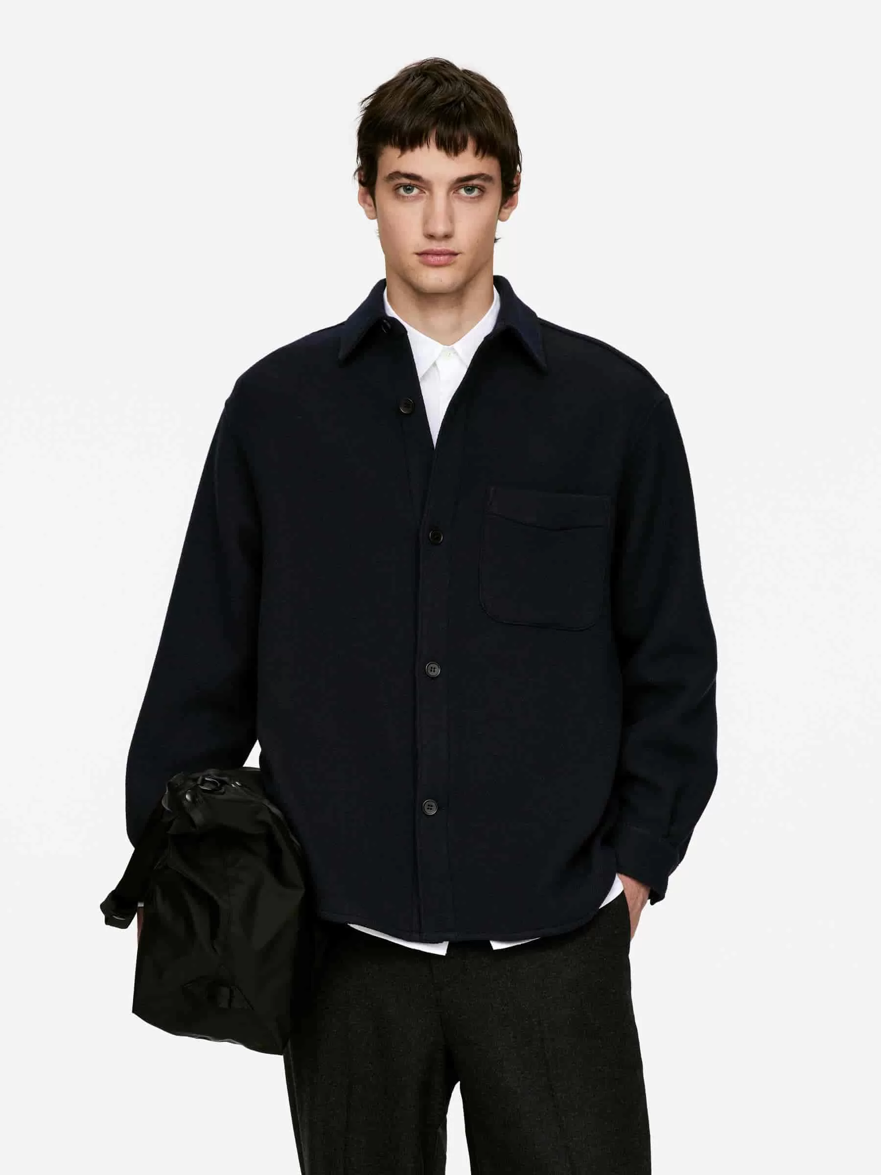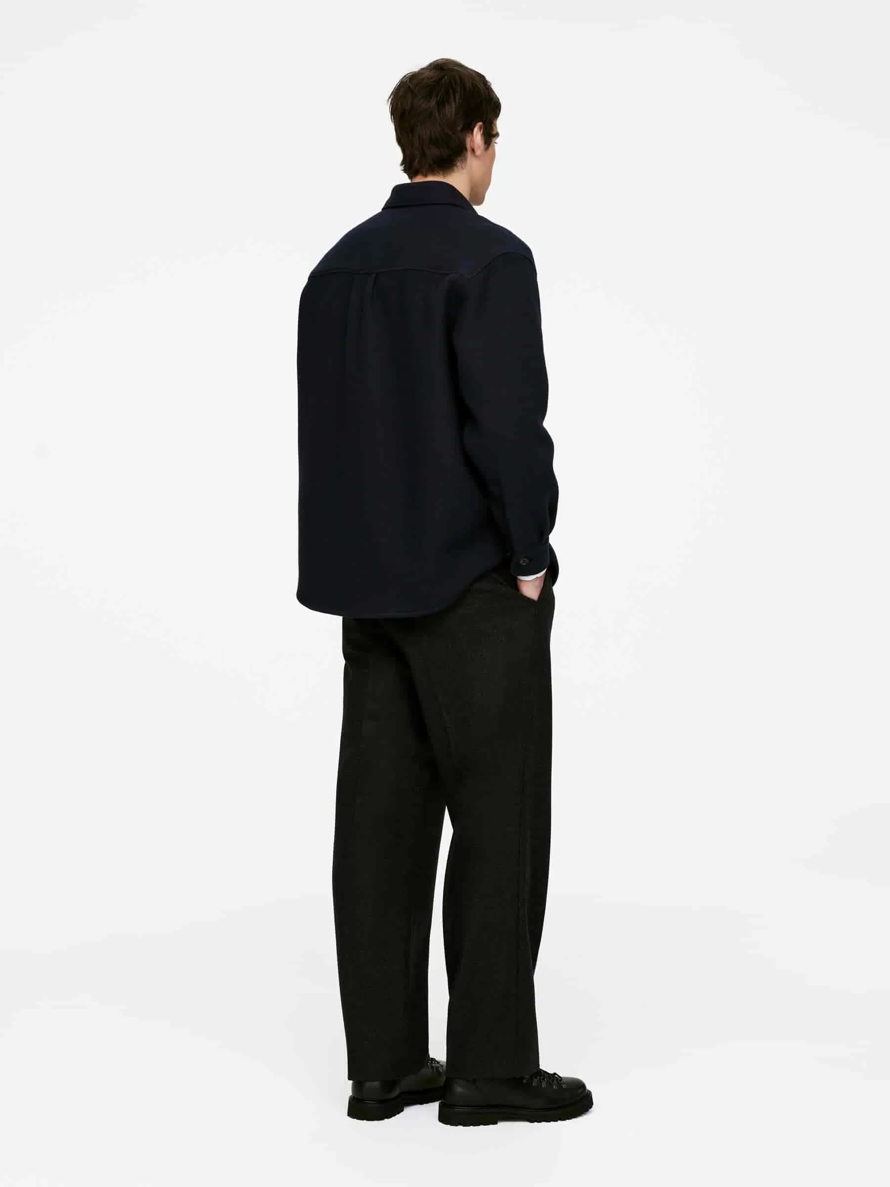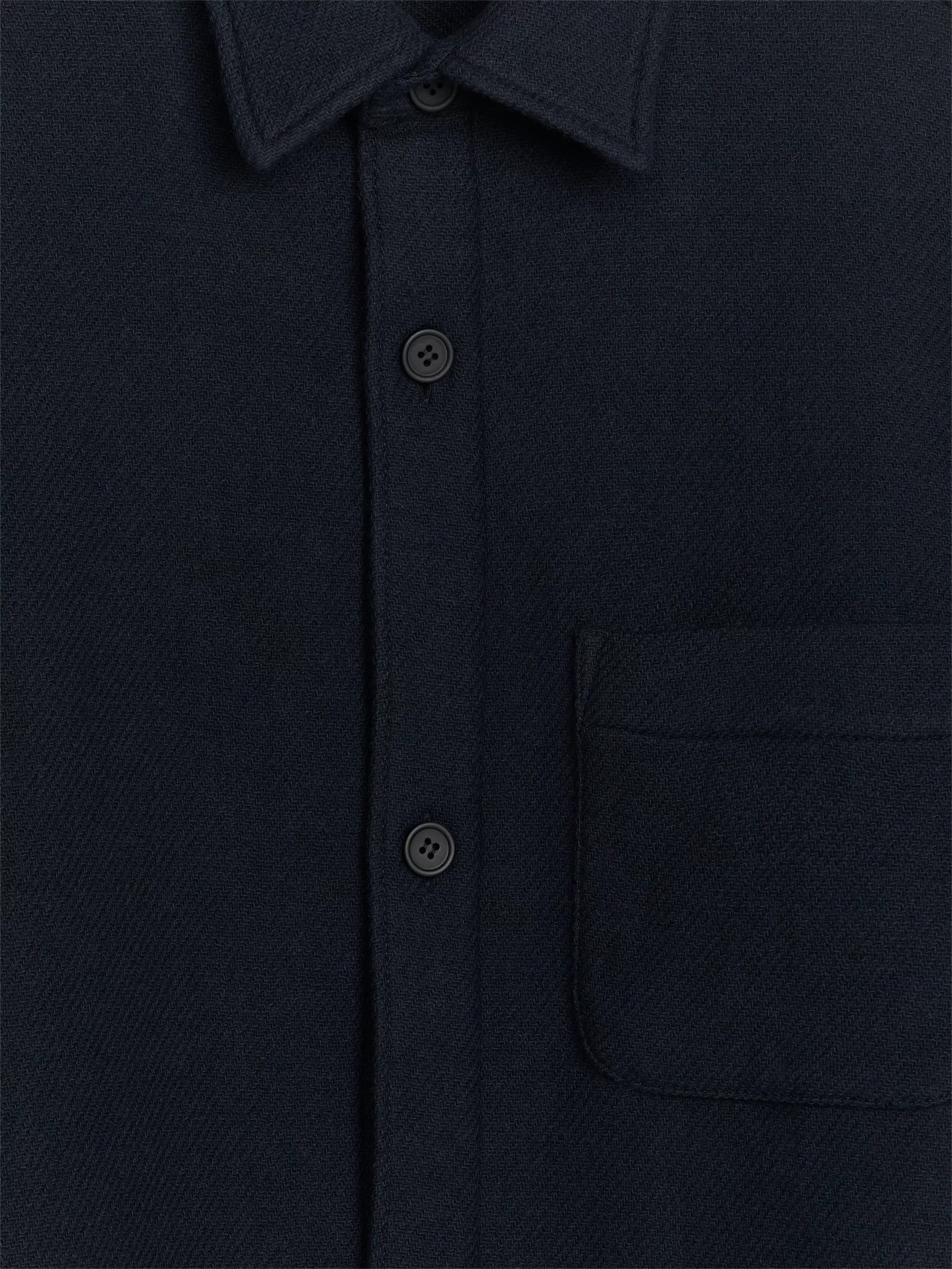 Skjorta sydd av en ullblandning. En lös passform med vanlig krage, knäppning fram med knäppning och en enkel patchficka på bröstet. Bakre ok med ett lådveck under. Manschetter med knäppning. Böjd fåll.