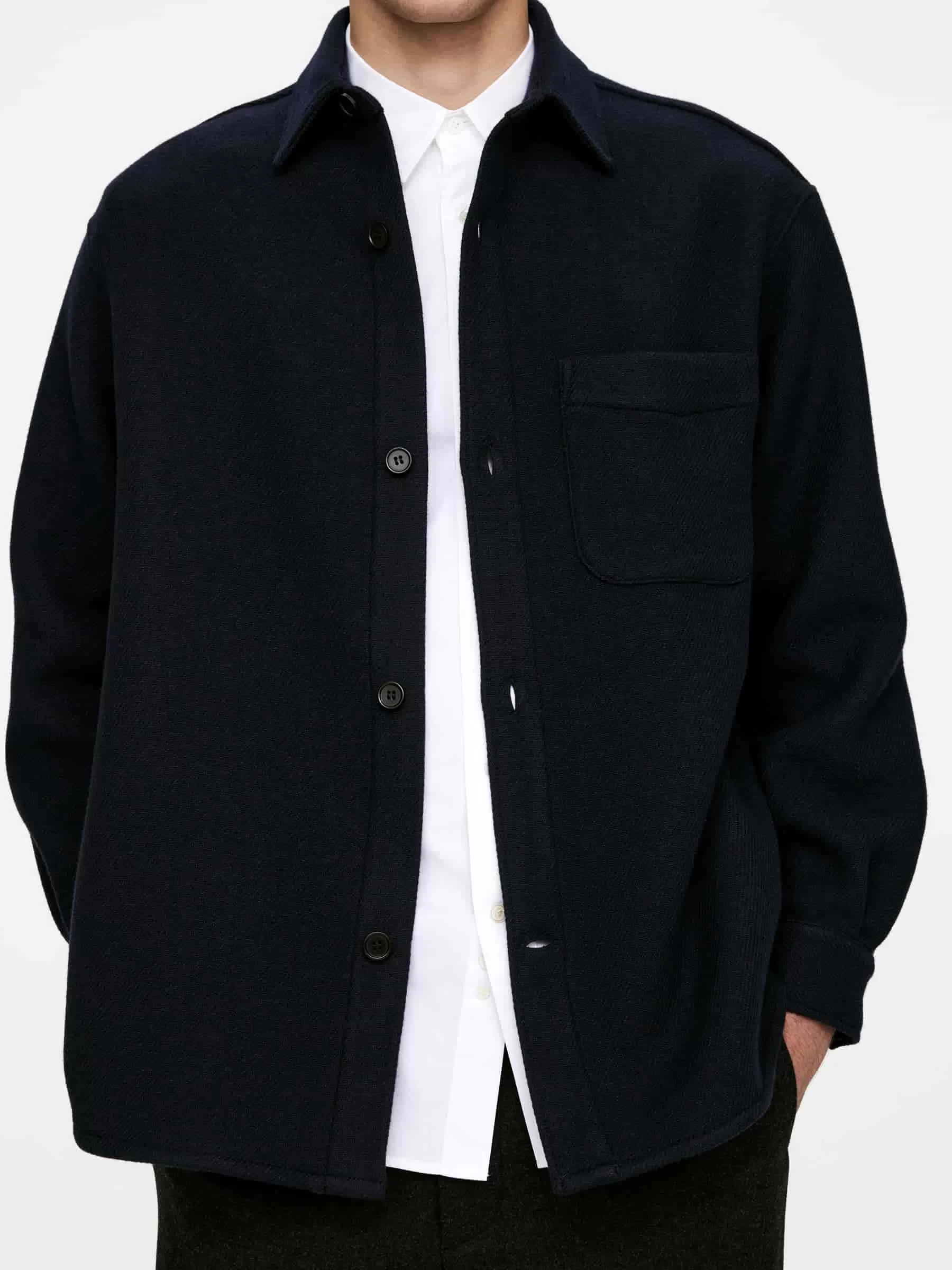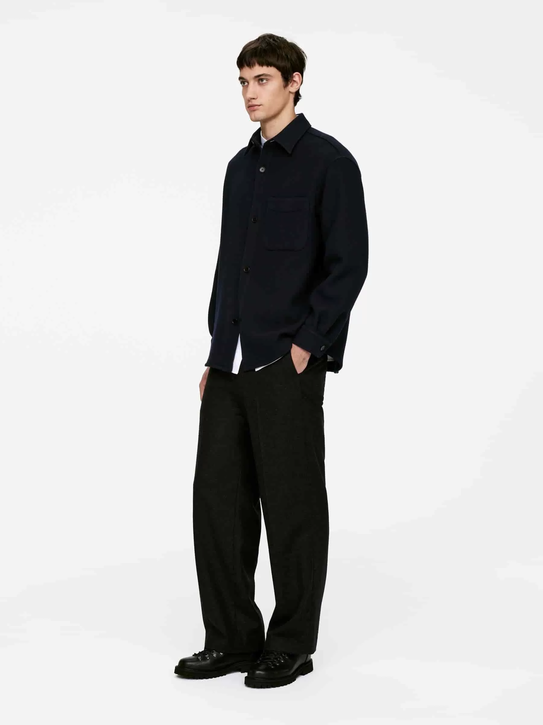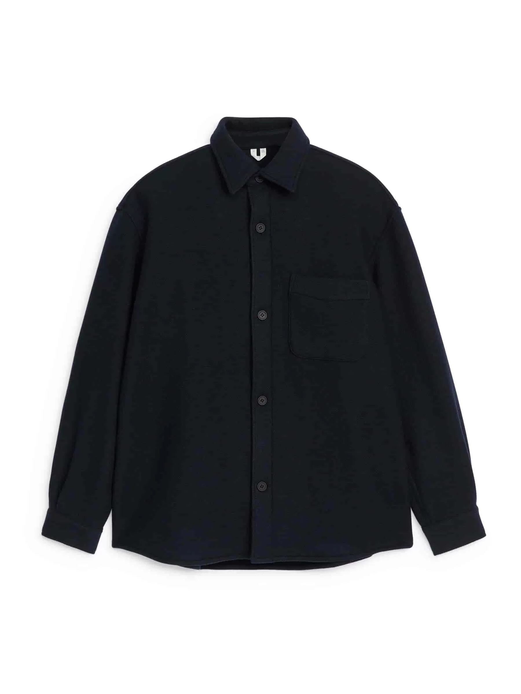 Skjorta sydd av en ullblandning. En lös passform med vanlig krage, knäppning fram med knäppning och en enkel patchficka på bröstet. Bakre ok med ett lådveck under. Manschetter med knäppning. Böjd fåll.