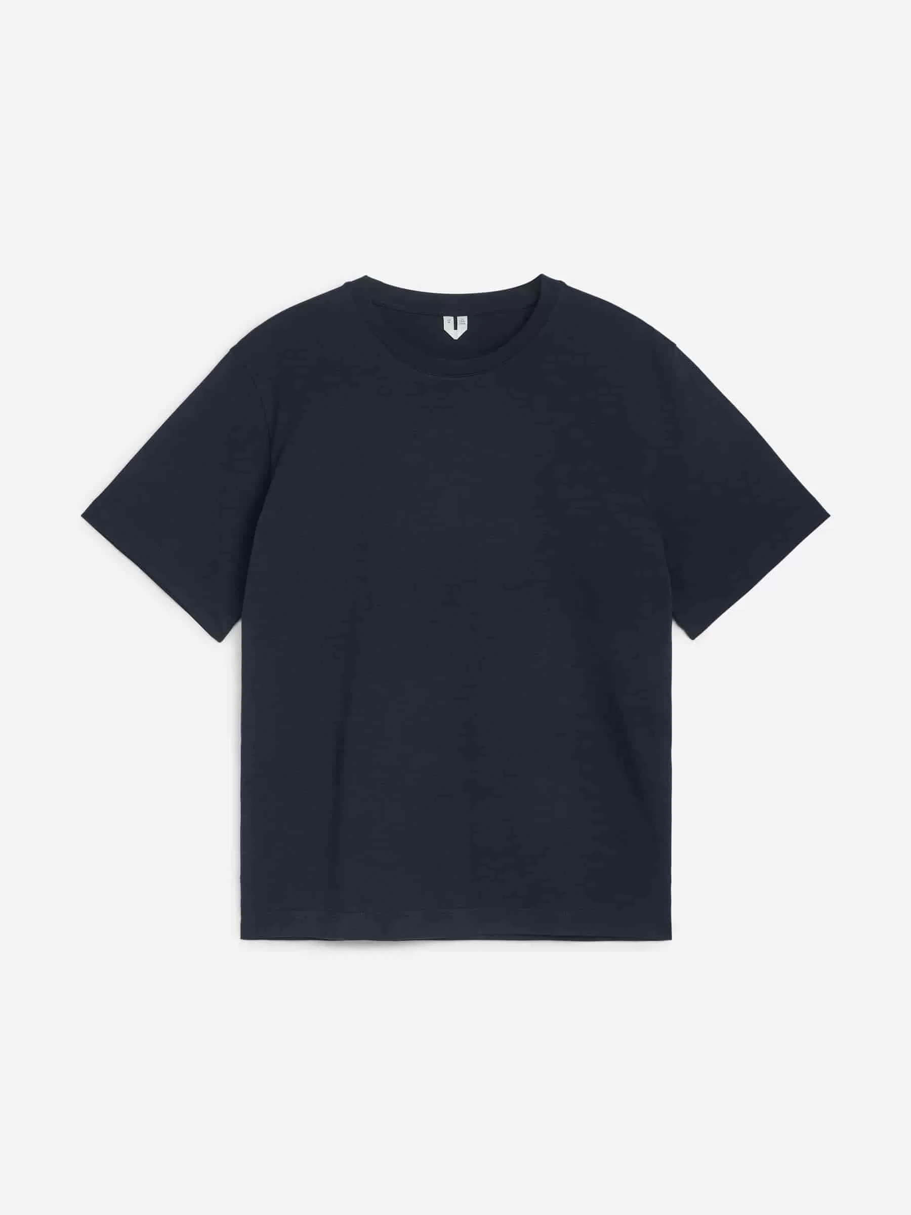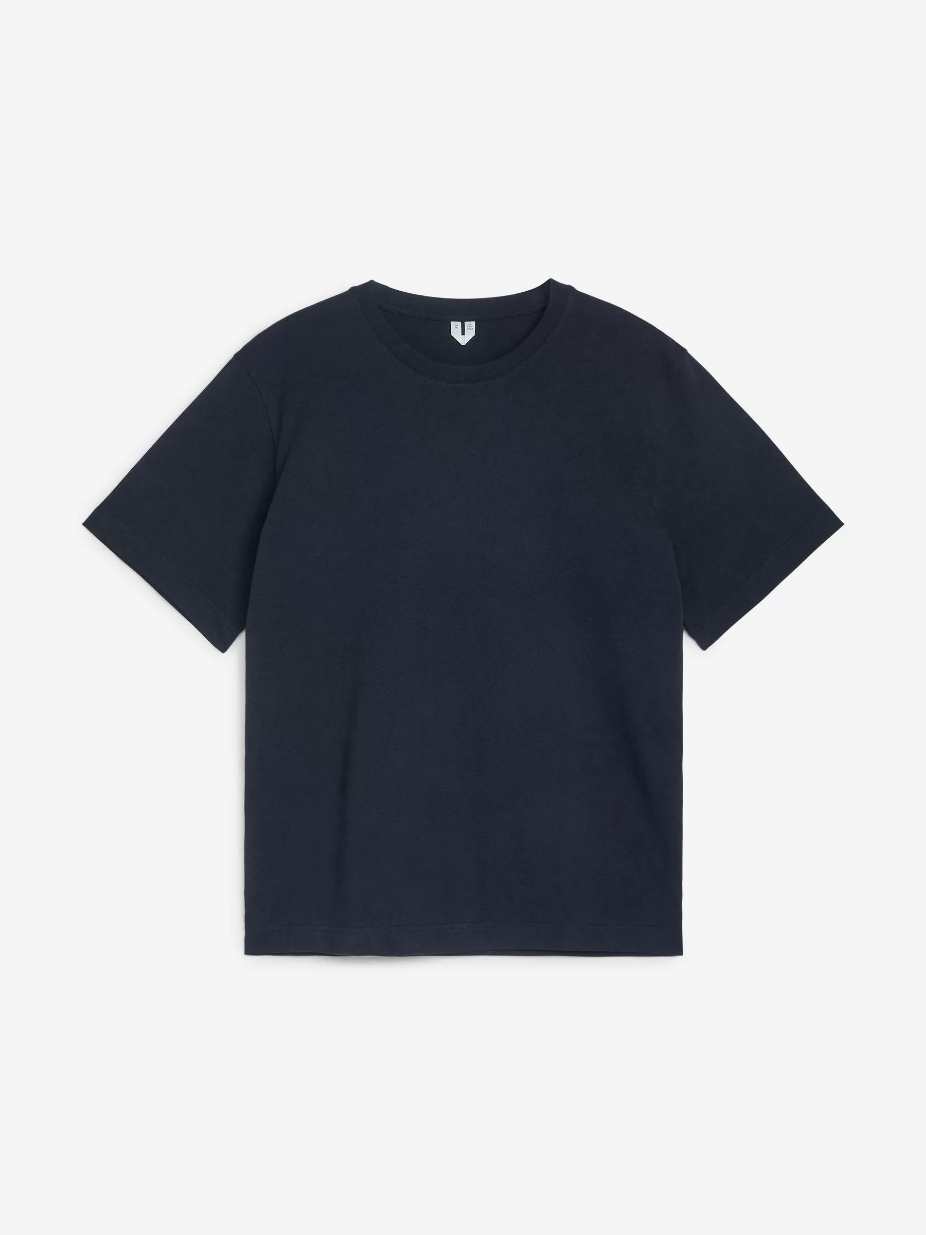 Klassisk T-shirt med rund hals för en normal passform. Den är gjord av 220 GSM singeltröja, vilket indikerar att detta är mellanviktsversionen av ARKETs standard T-shirts.
