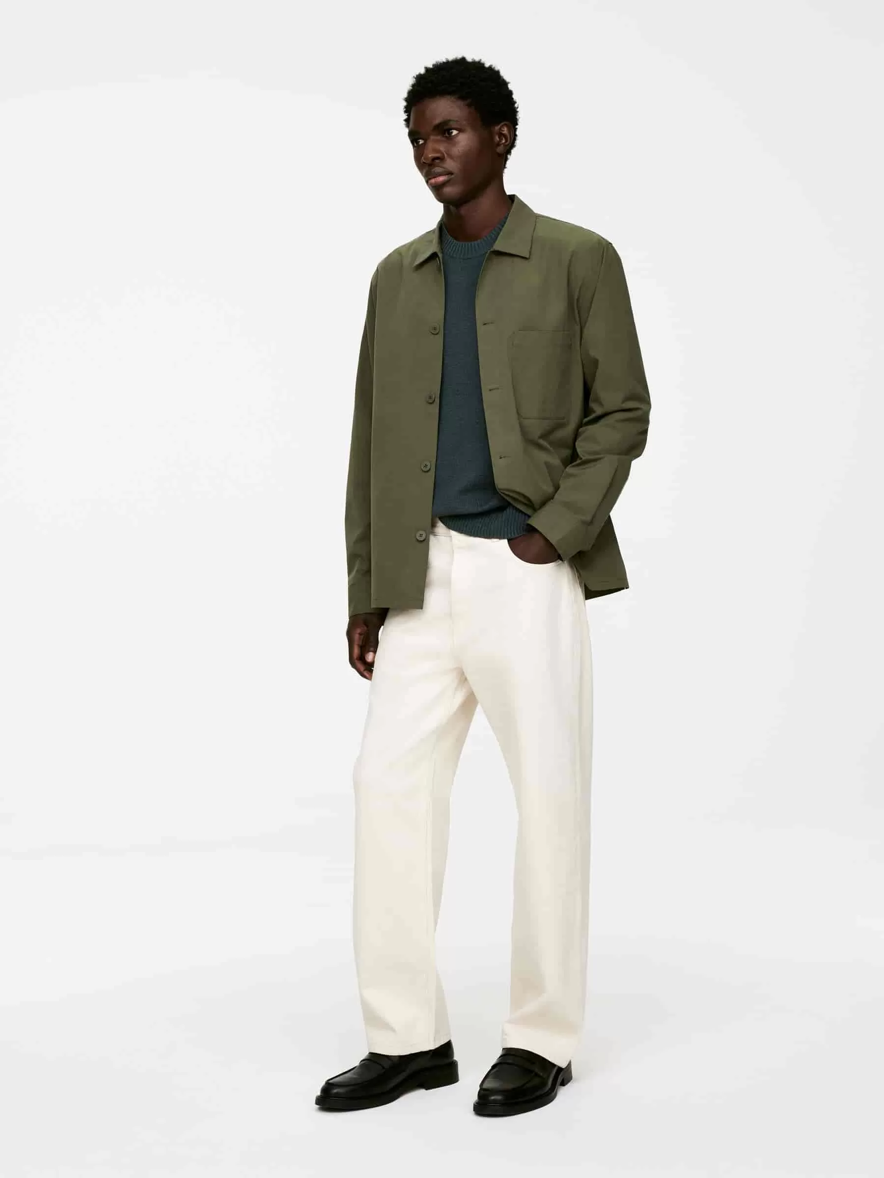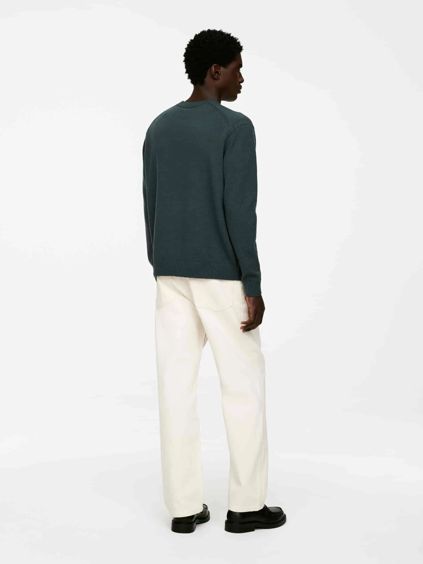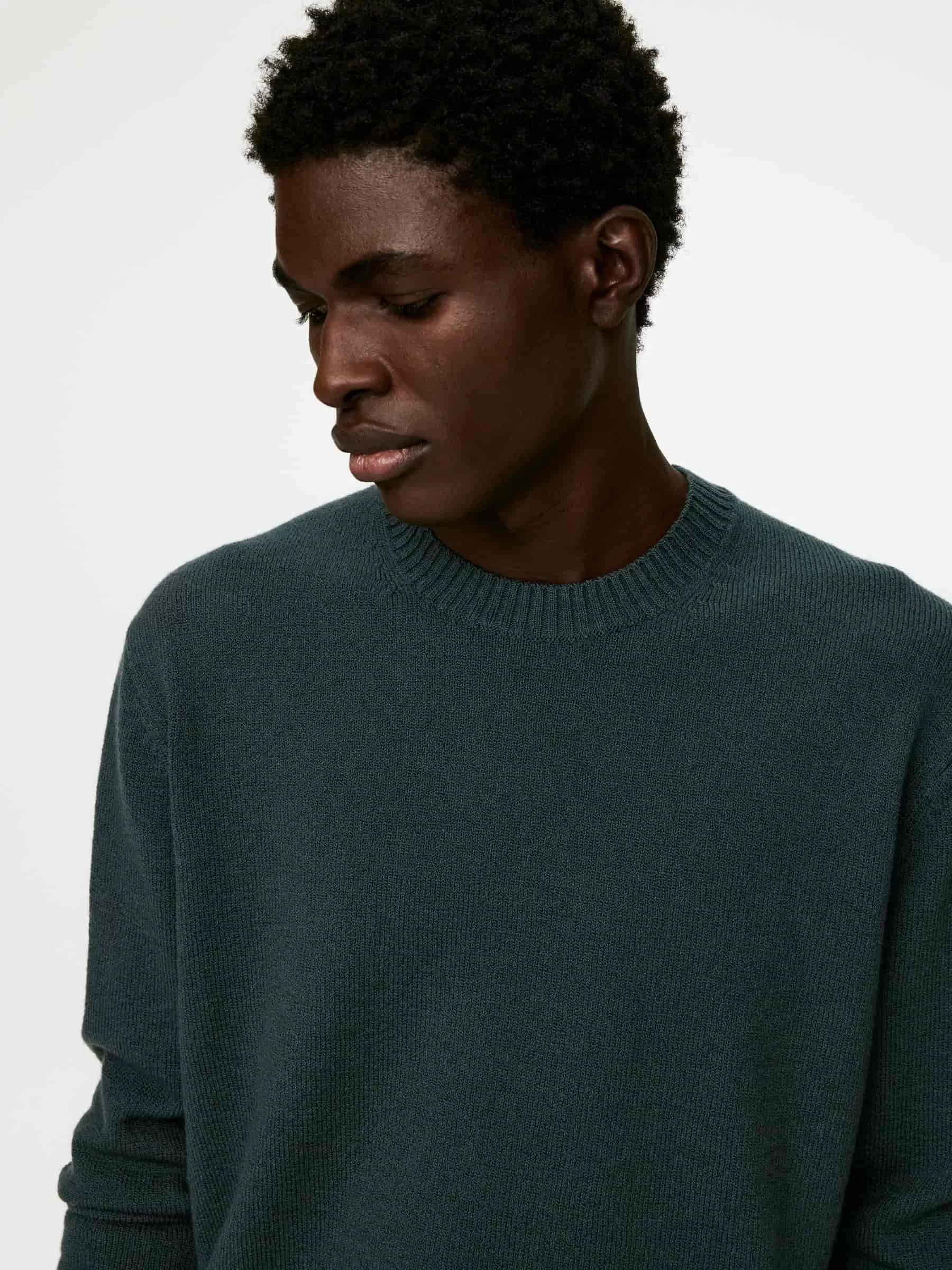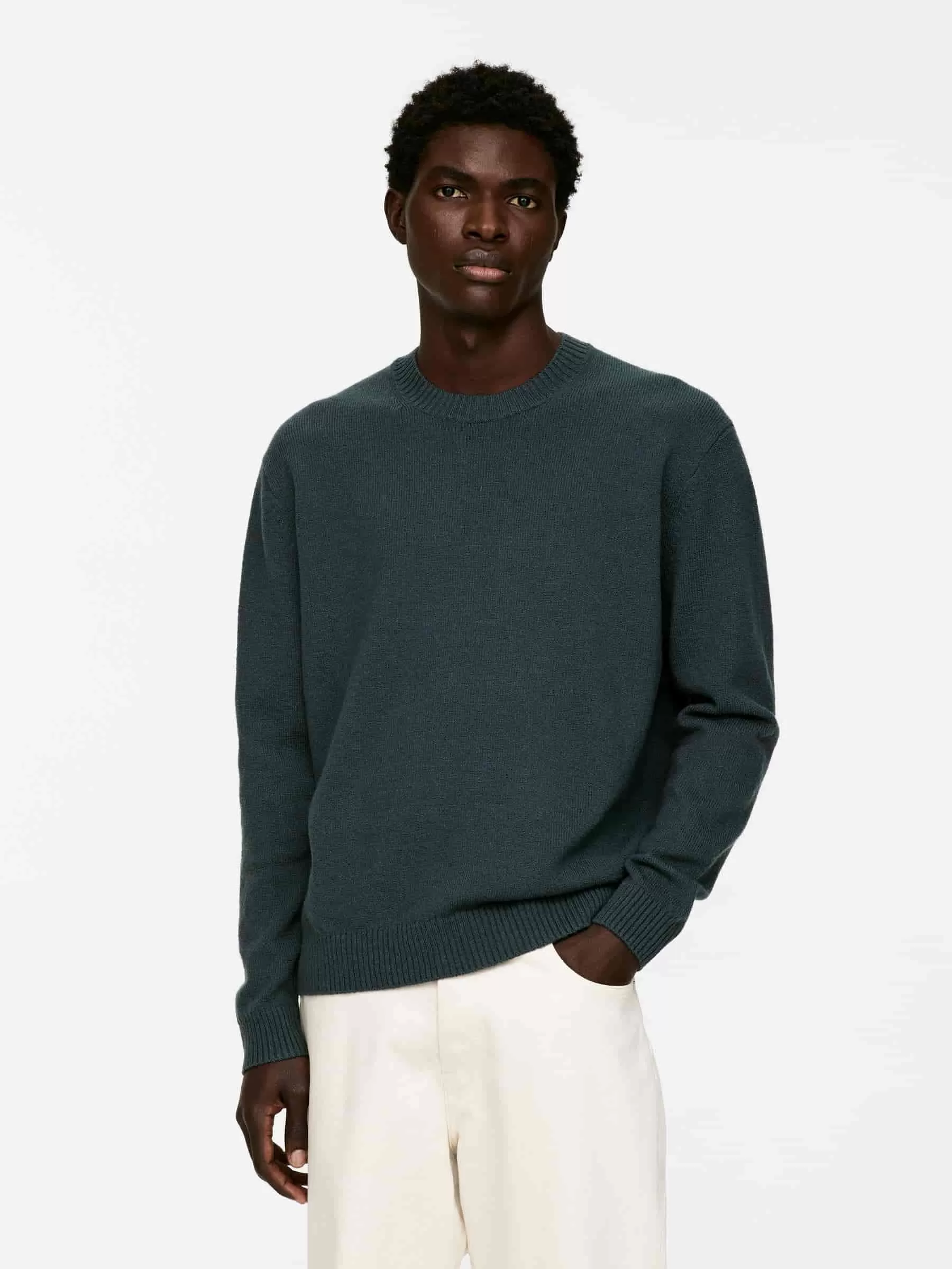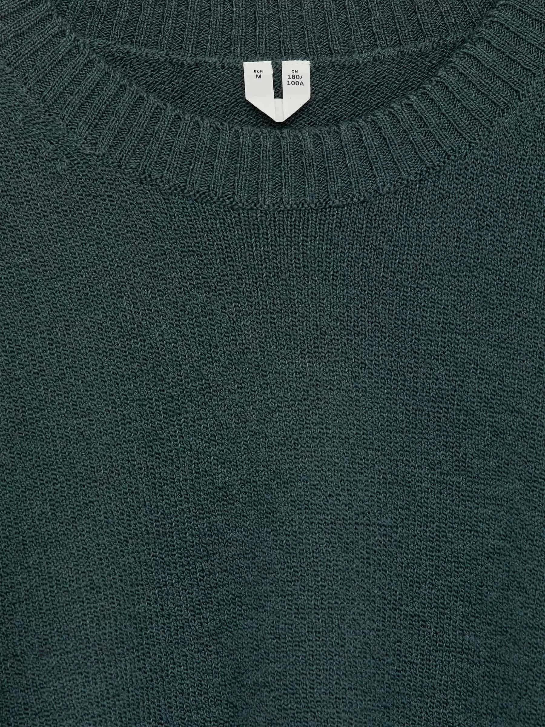 Tröja med rund hals slätstickad av ull-bomullsgarn med en något oregelbunden struktur. Ribbade kanter. Vanlig passform. Stilen innehåller 60% RWS-ull (TE-00047206). Produkter certifierade enligt Responsible Wool Standard (RWS) innehåller ullfibrer från gårdar som är oberoende certifierade enligt kraven på djurskydd och markförvaltning.