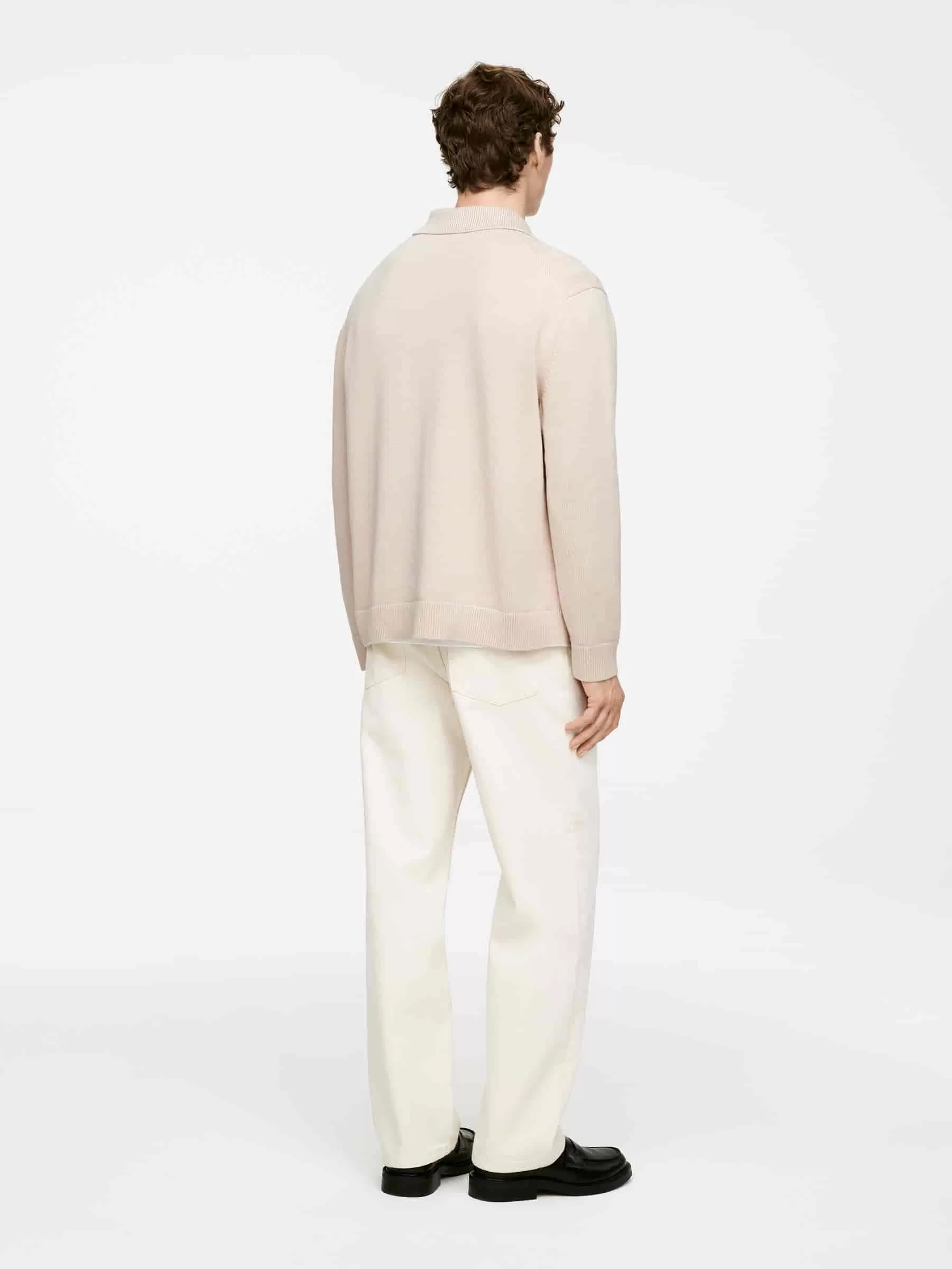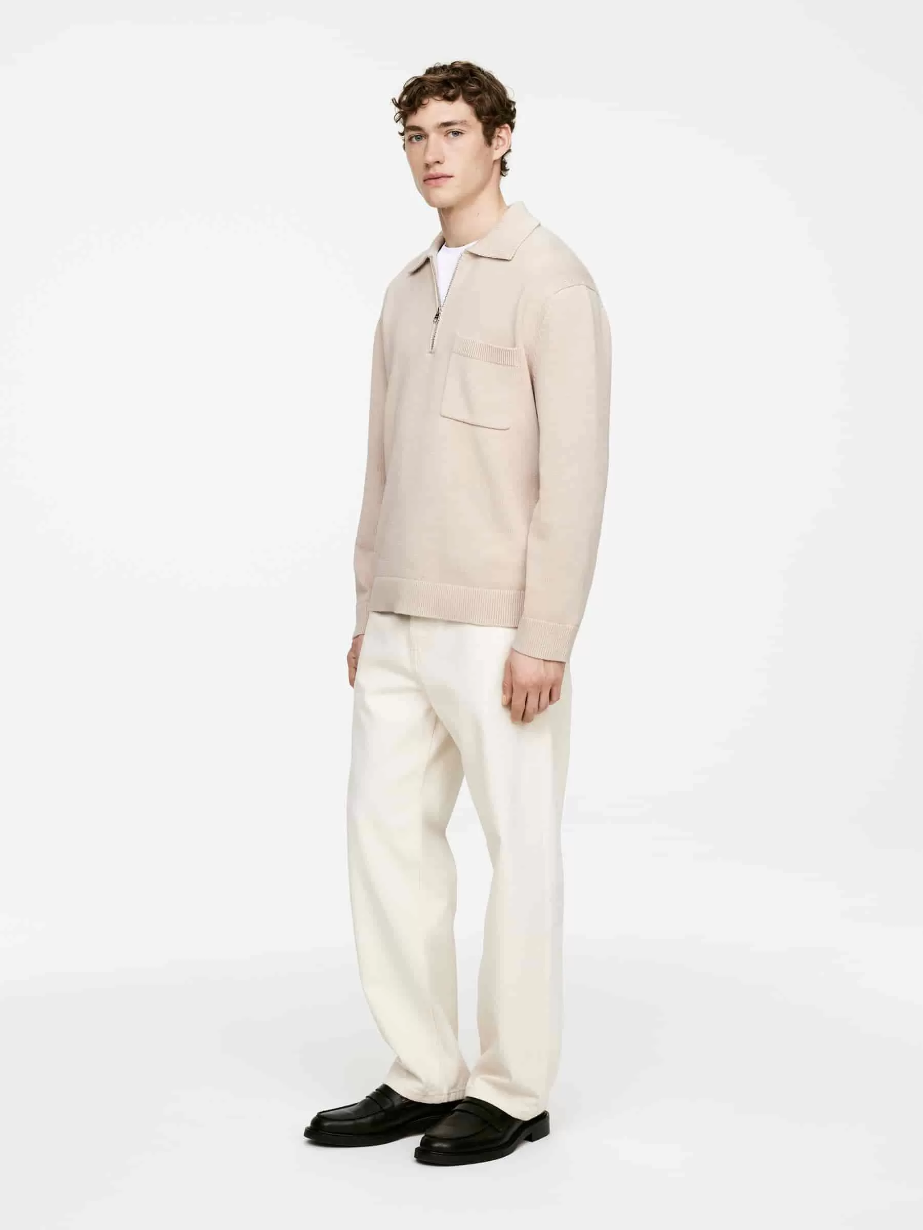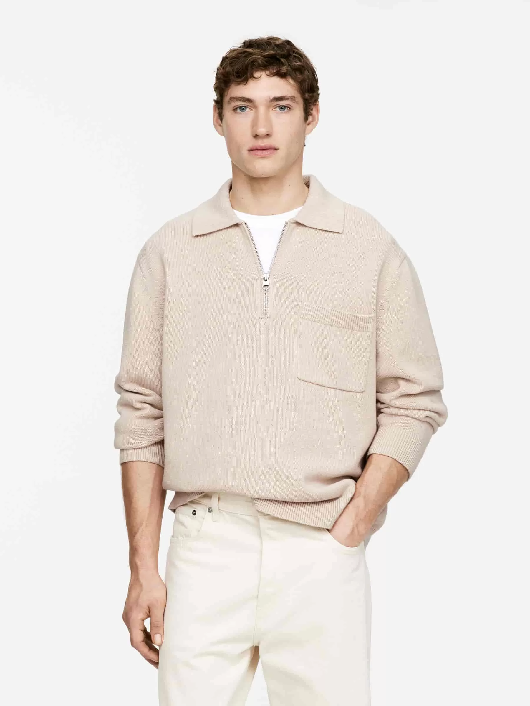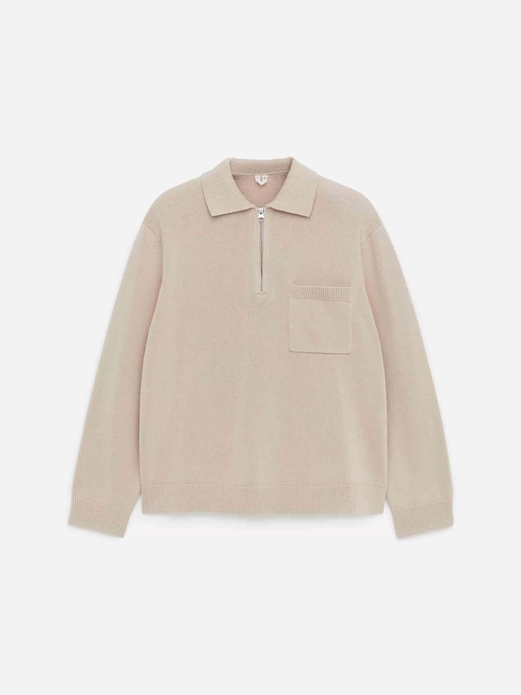 Plattstickad bomullströja med halv dragkedja. Ribbstickad krage och en enkel bröstficka. Ribbstickade beslag.