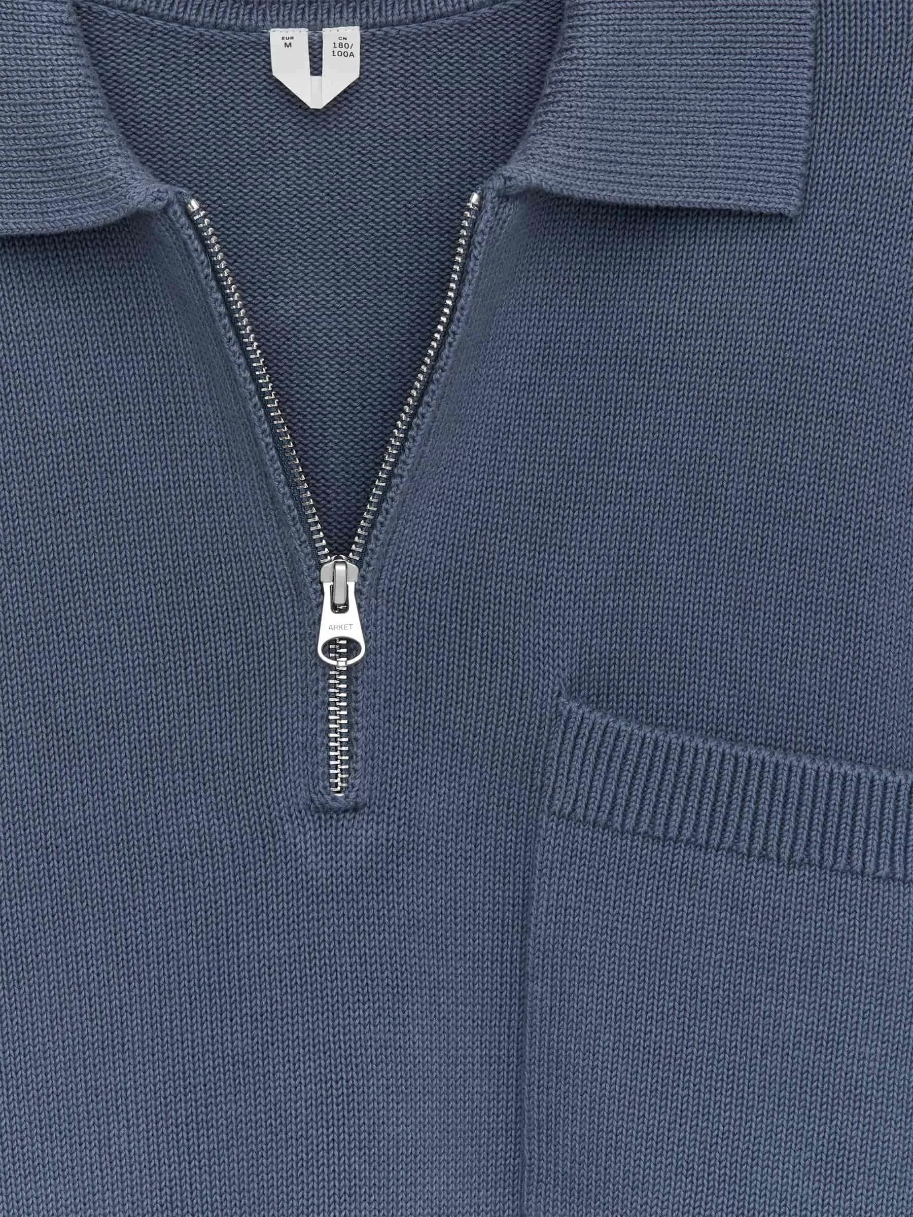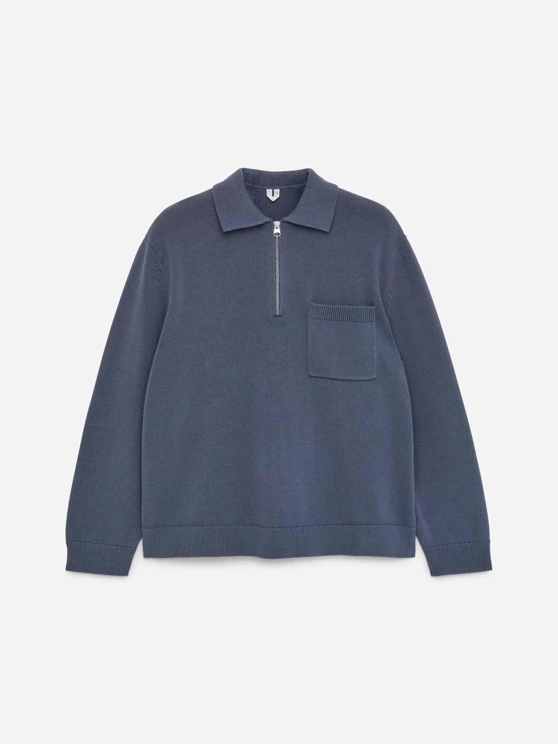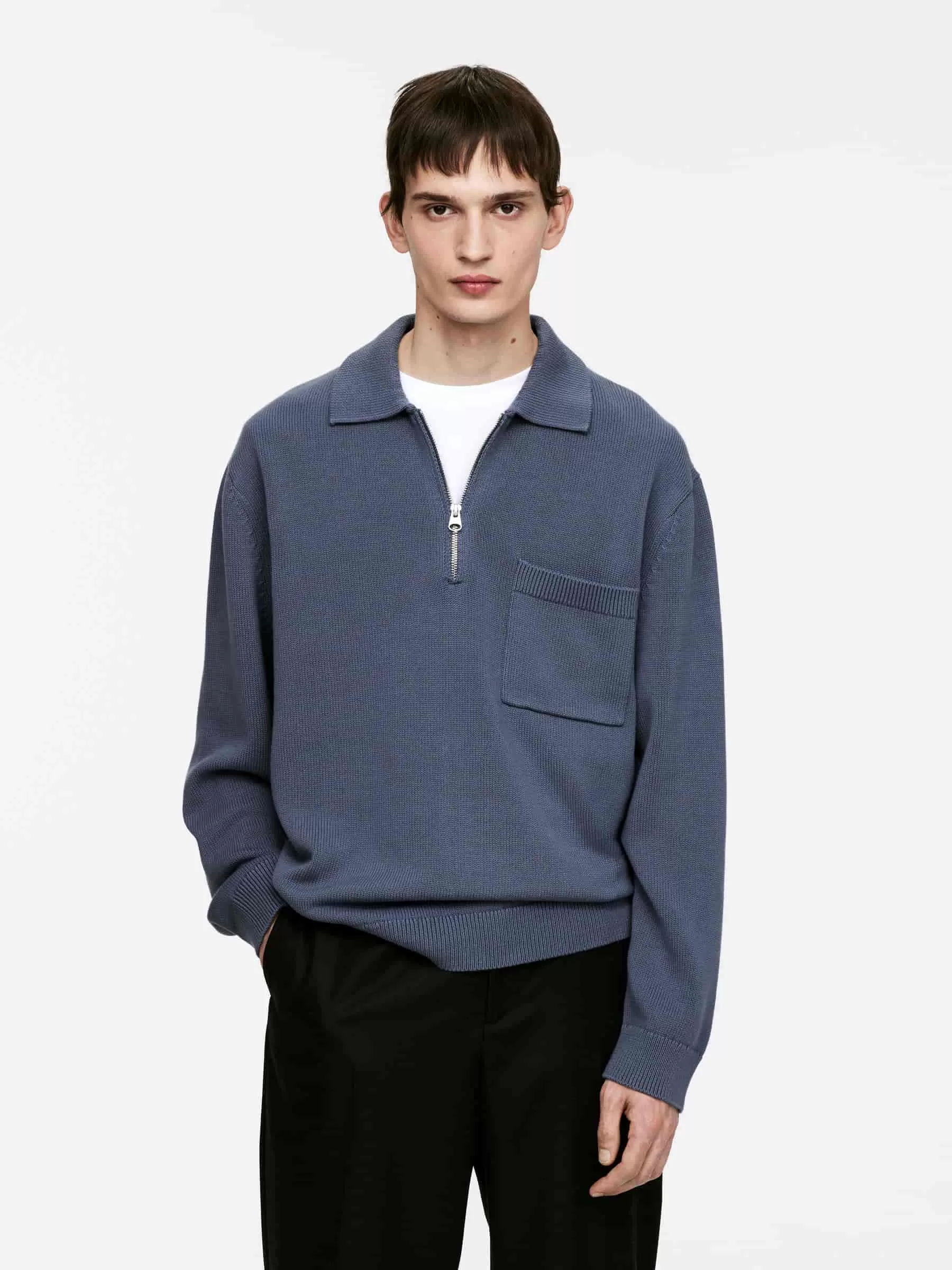 Plattstickad bomullströja med halv dragkedja. Ribbstickad krage och en enkel bröstficka. Ribbstickade beslag.