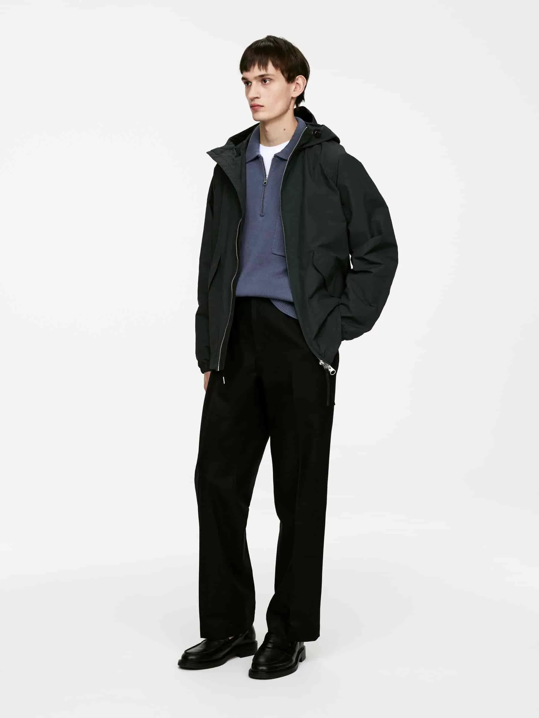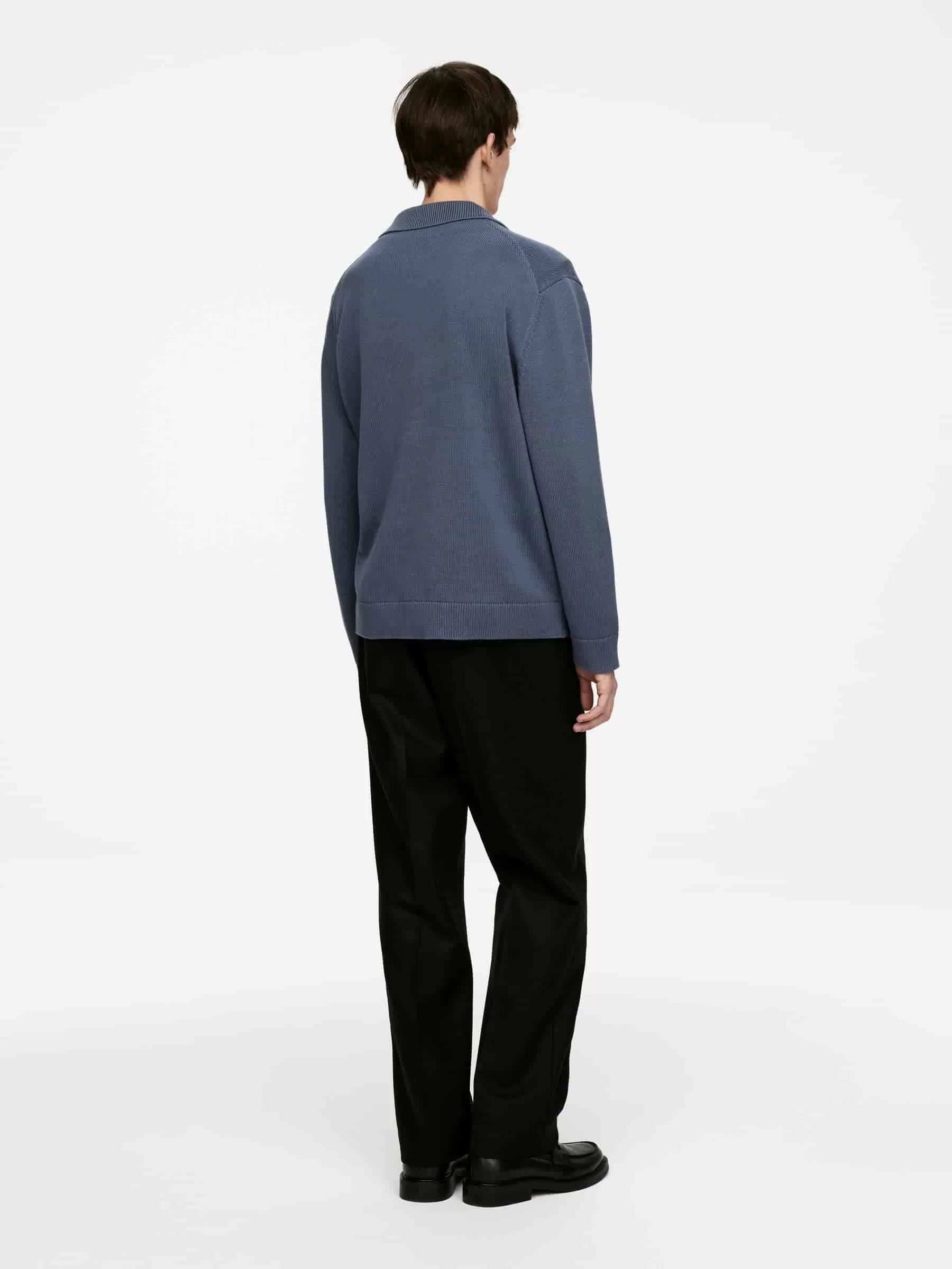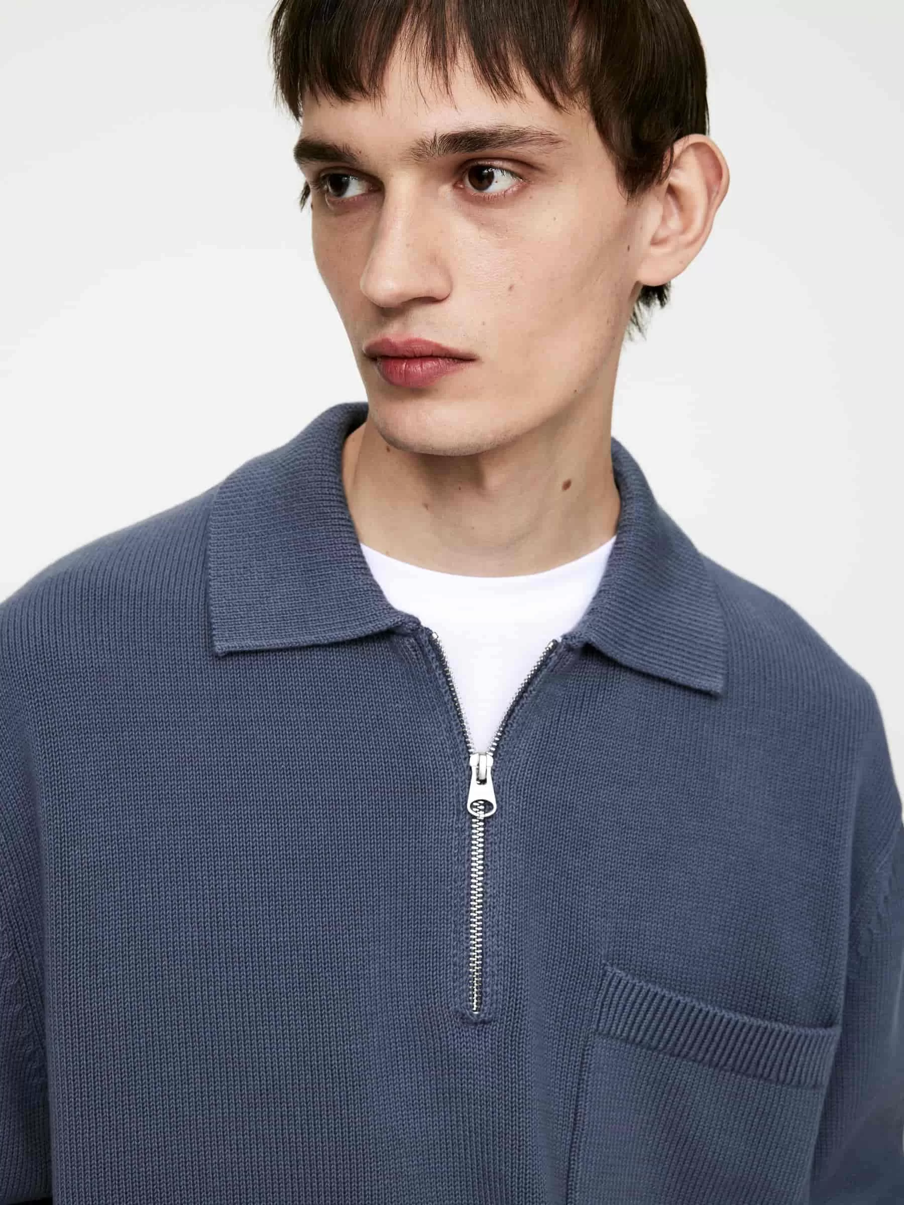 Plattstickad bomullströja med halv dragkedja. Ribbstickad krage och en enkel bröstficka. Ribbstickade beslag.