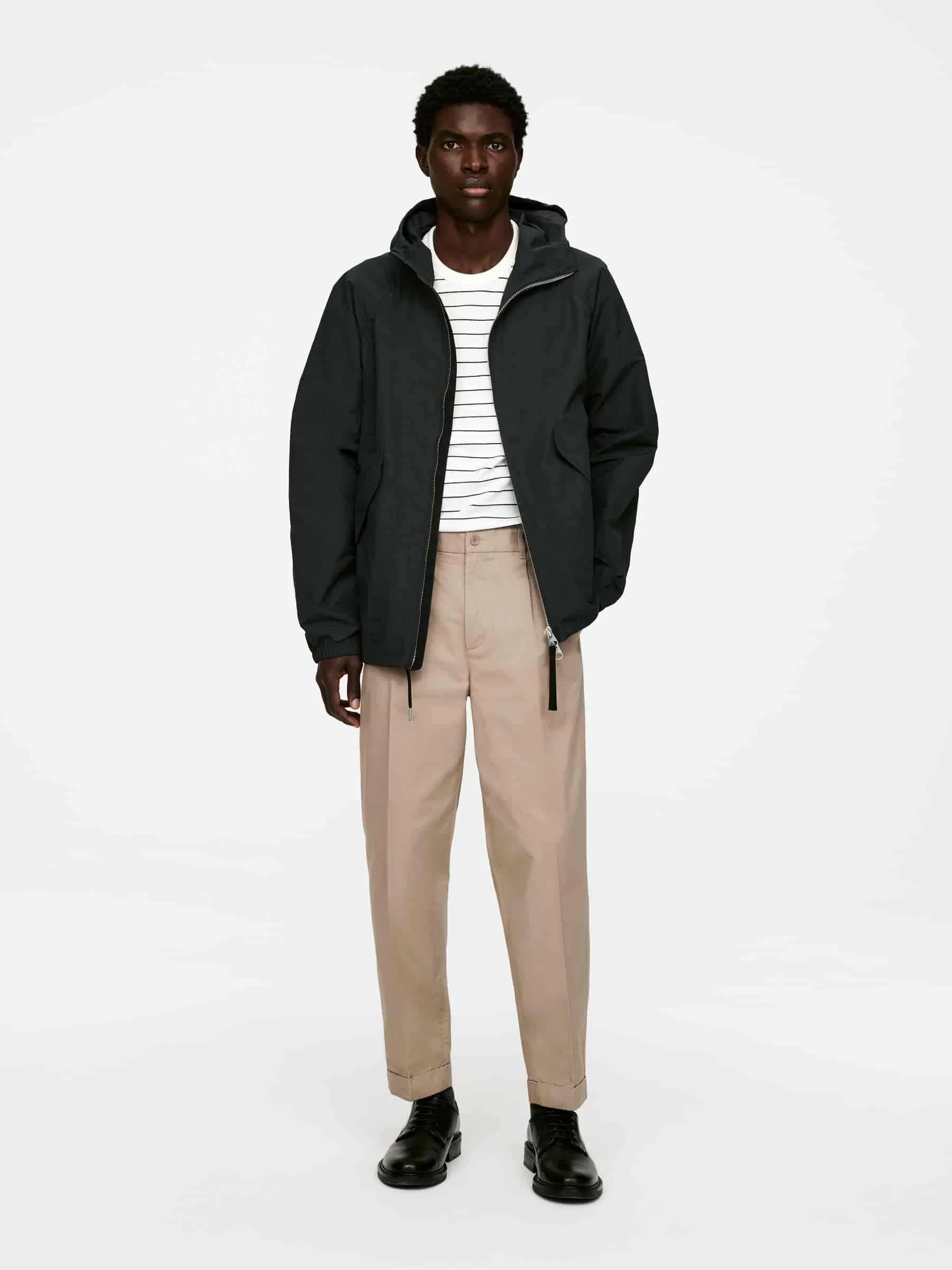 Bomullsbyxor med raka ben med fast uppvikning i nederkant. Två snedställda fickor fram och två jetfickor med knäppning bak. Midjeband med krok-och-stängning och gylf med dragkedja. Normal passform.